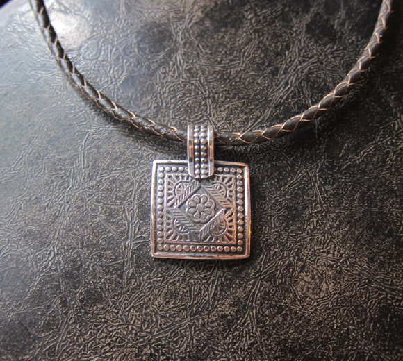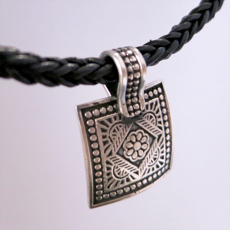 アラブ系の遊牧民ベドウィンのデザインを用いたシルバーペンダントです。部族の紋章のデザインとのことで、やや丸みのある正方形に花のようなレリーフが彫り込まれています。ひとつひとつ丁寧に仕上げられています。