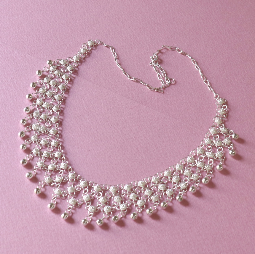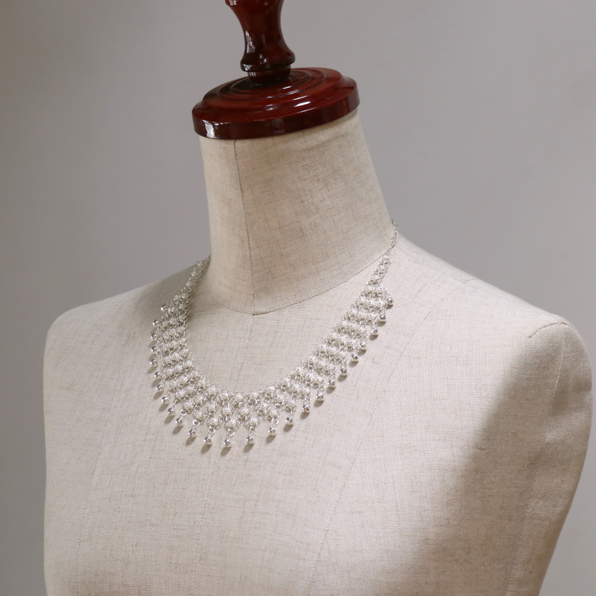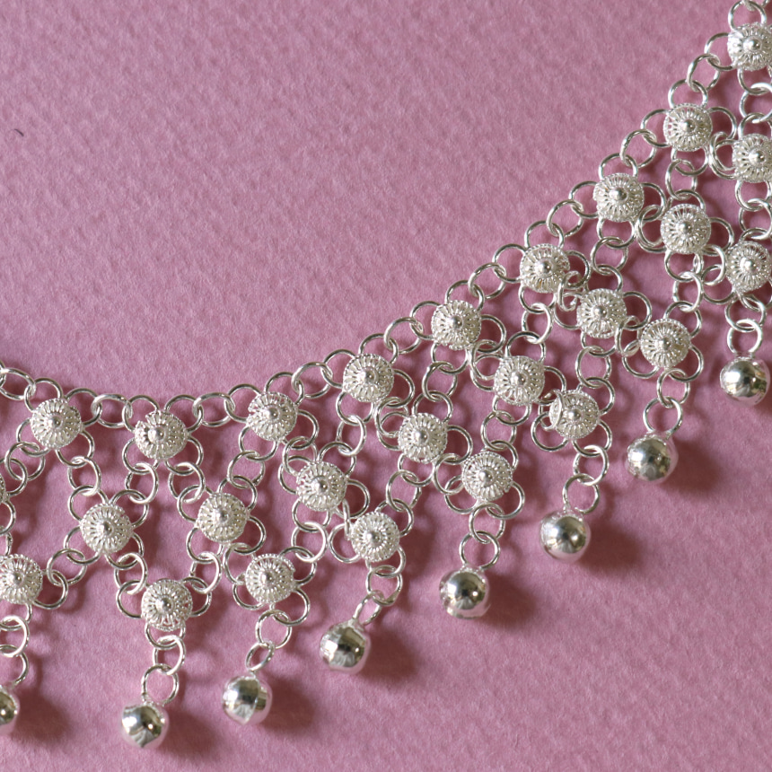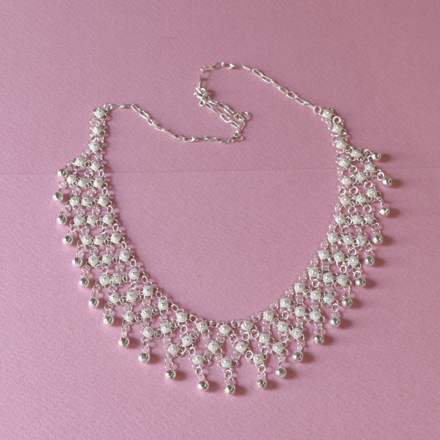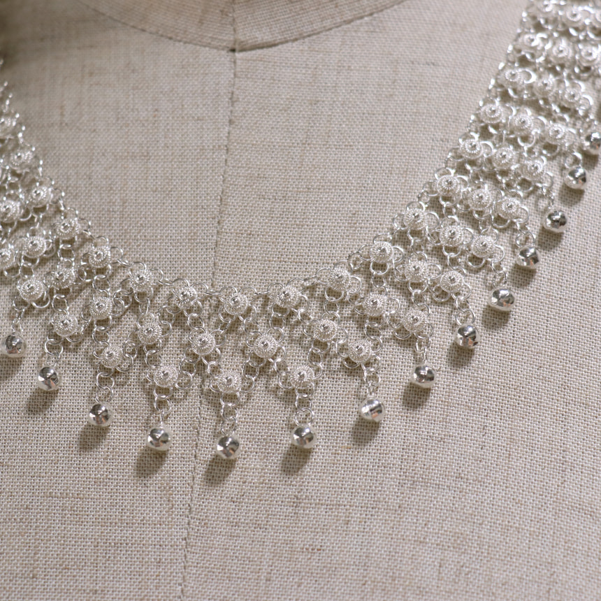 イスラムの女性たちは黒いチャドルの下にたくさんの装飾品をつけて着飾ります。手仕事で一つ一つつなぎ合わせられ網のようになっているネックレスは、見た目よりもずっしりとシルバーの重みを感じることができます。シャラシャラと揺れる動きをお楽しみください。