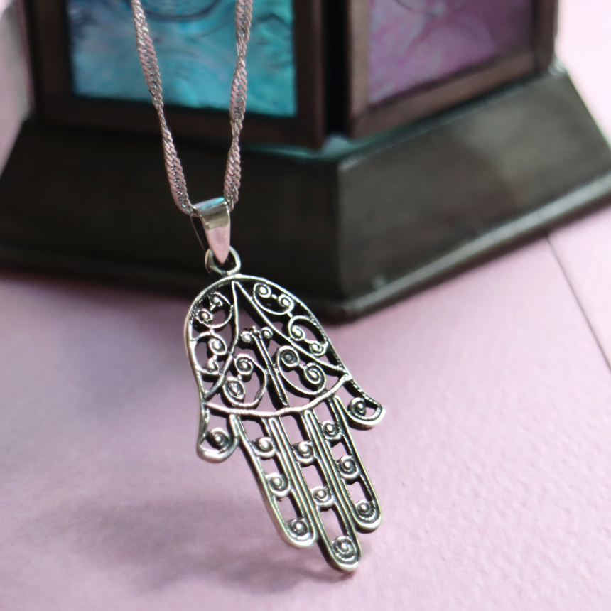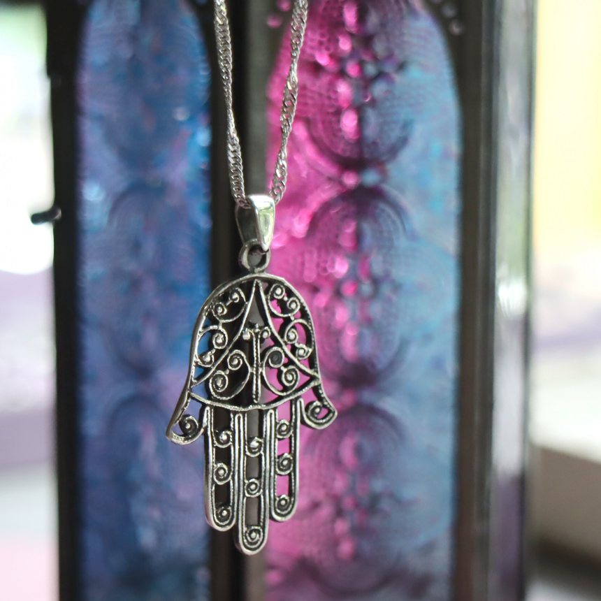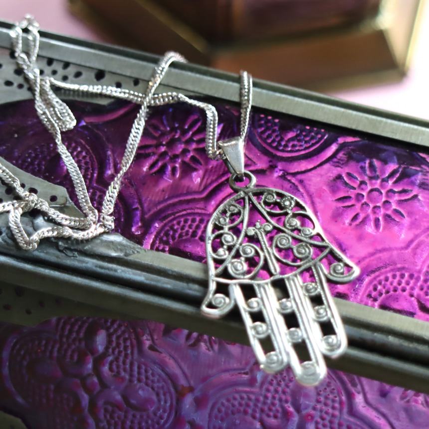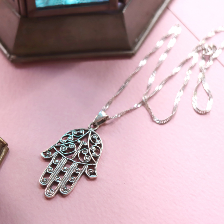 イスラム圏に広く見られる「ファティマの手」のモチーフ。預言者ムハンマドの第4女ファティマは、慈悲深く、貧しい人々を思いやり、病気の人をすすんで看護する優しい女性。ファティマから手を差し伸べてもらえるよう、女性の手を模ったモチーフを持つ習慣が広まったといわれています。