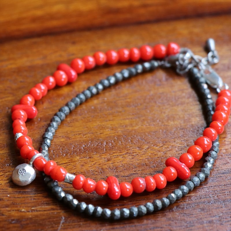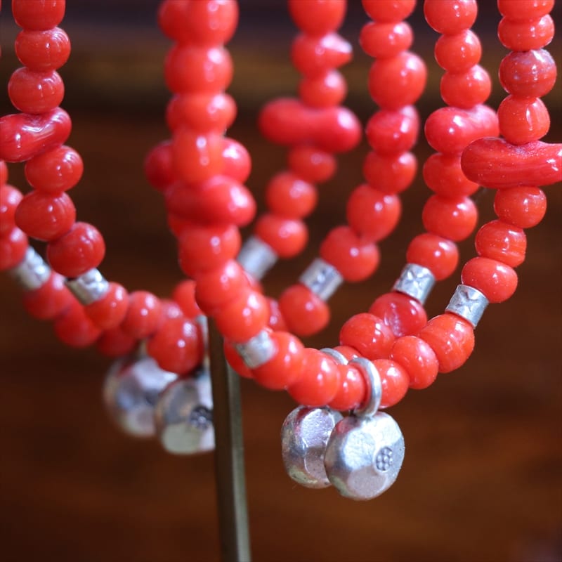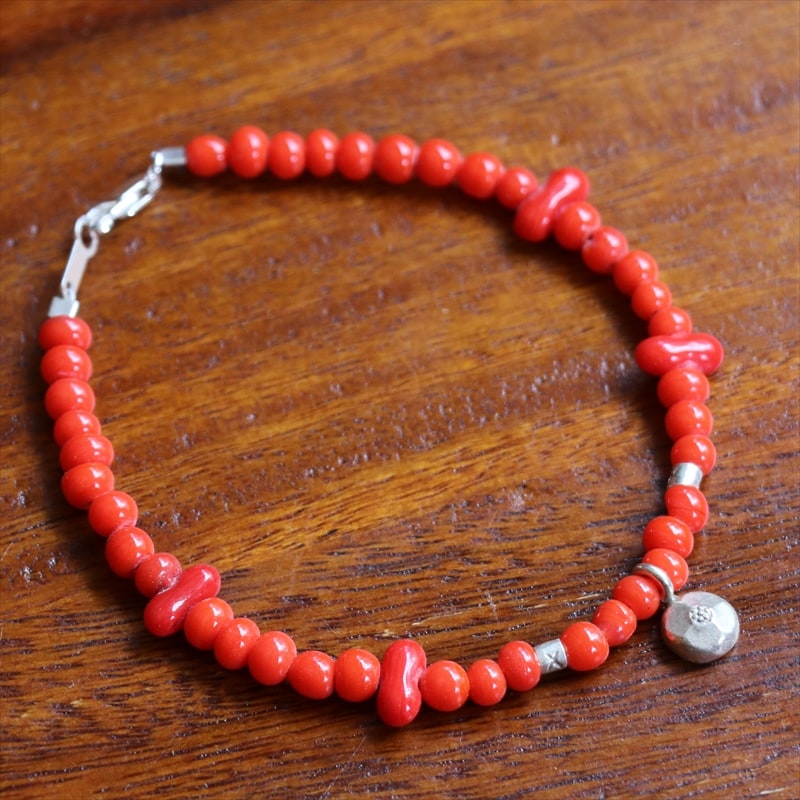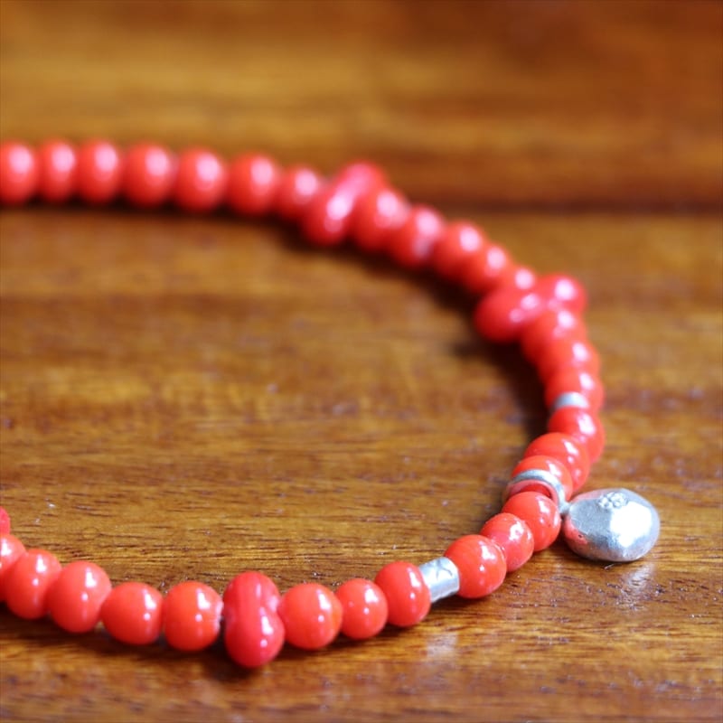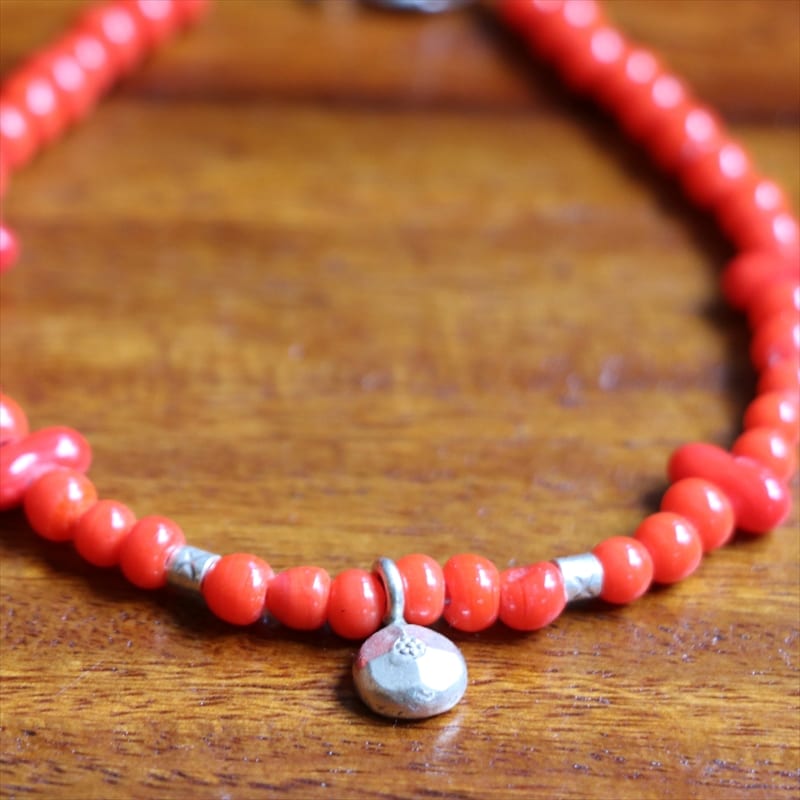 鮮やかな赤いオールドビーズにカレンシルバーと天然の山サンゴがところどころにちりばめられたブレスレットは当店のオリジナルデザイン。留め具部分にもシルバーを使用しています。