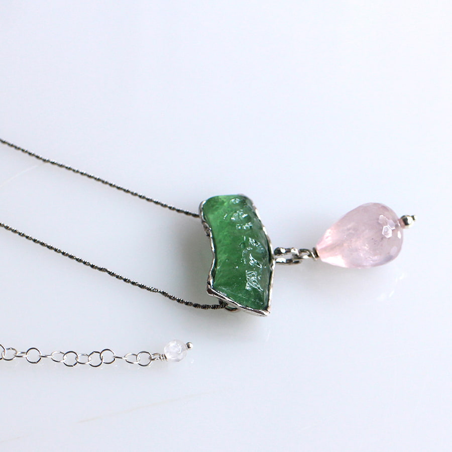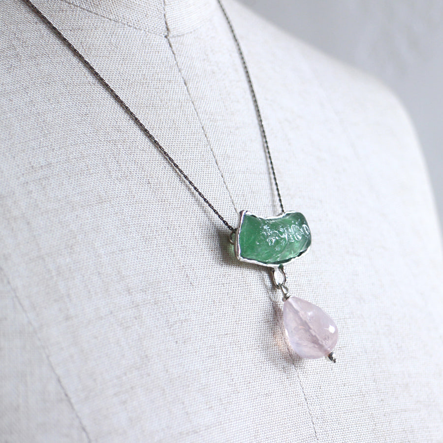 ローズクォーツの淡いピンクと深いグリーンのガラスの組み合わせが珍しい色使いのネックレスです。