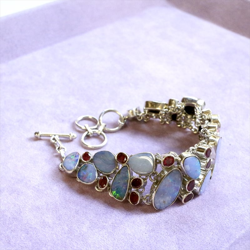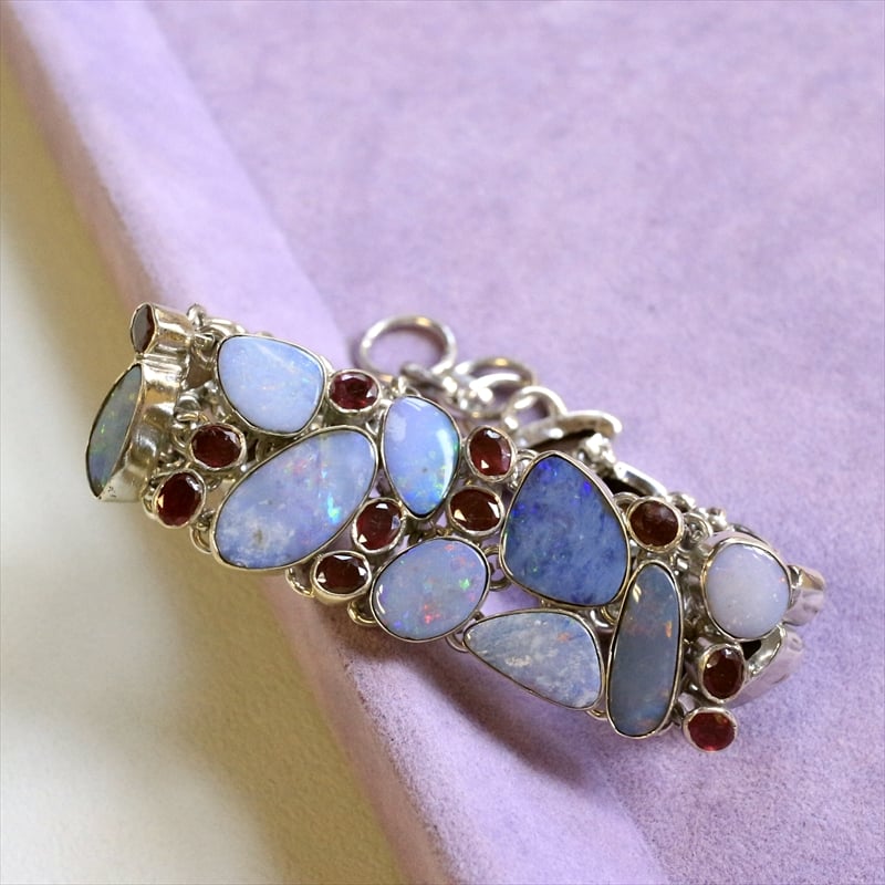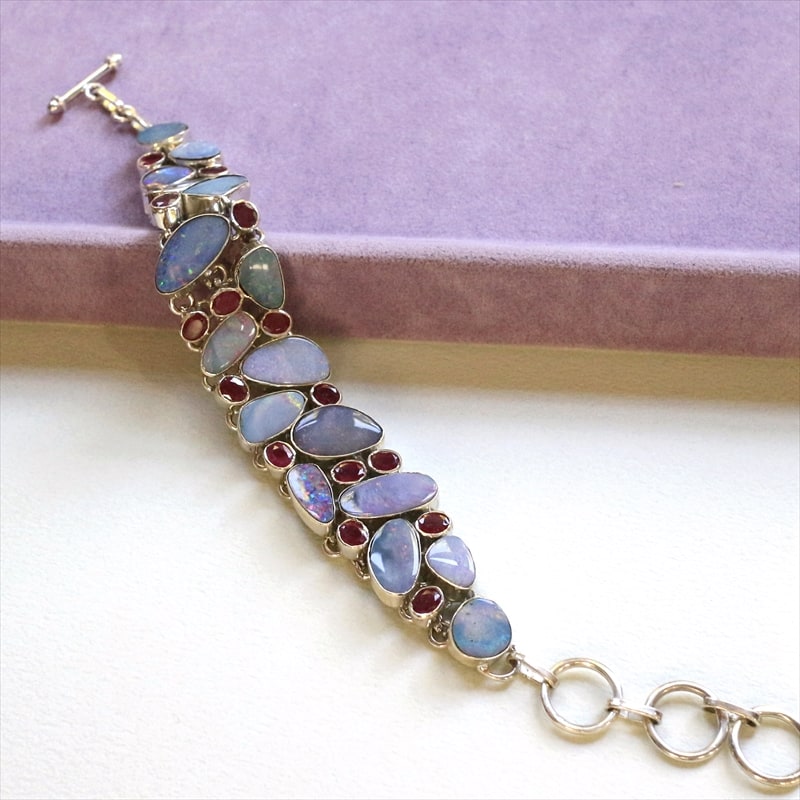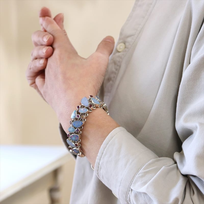 ブレスレットに仕立てられてあるものをインド・ジャイプールの工房から買い付けています。オパールの色は白から水色、やや紫がかったものもあり、それぞれに遊色効果が見られます。オパール17粒、ルビー18粒。