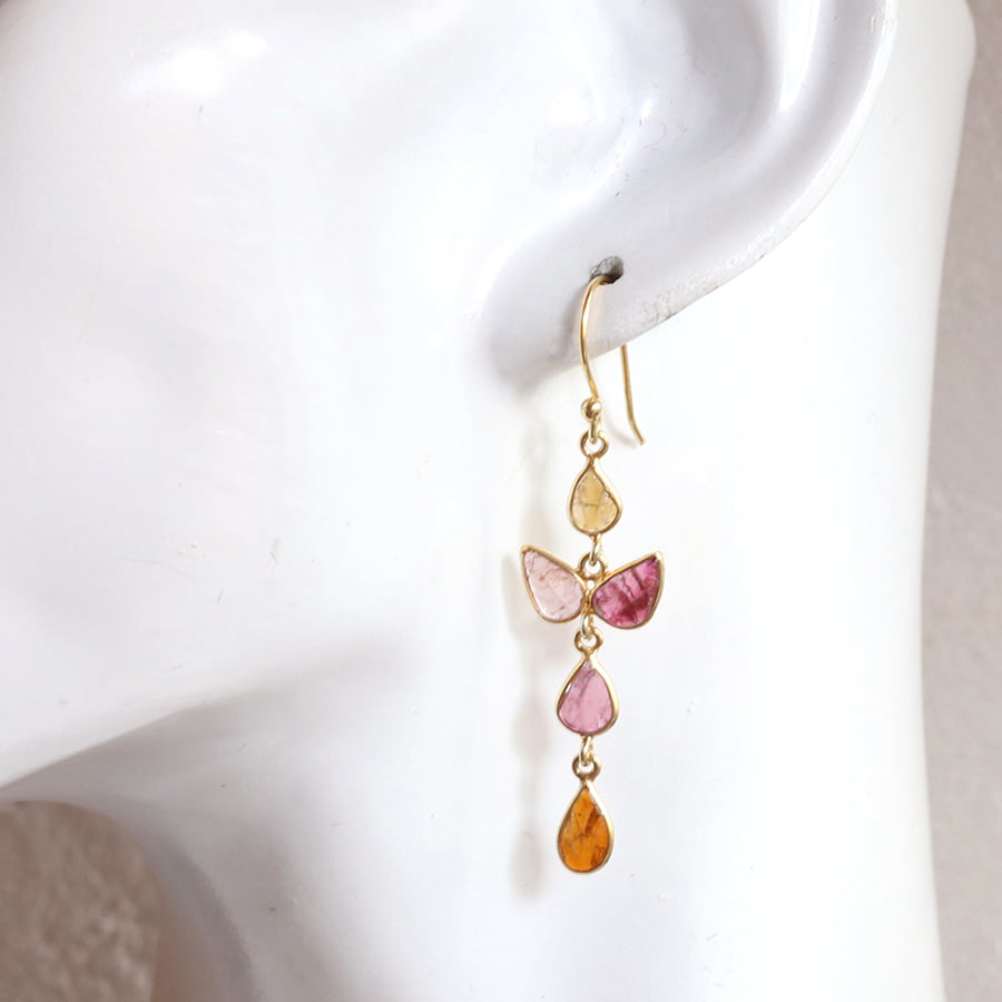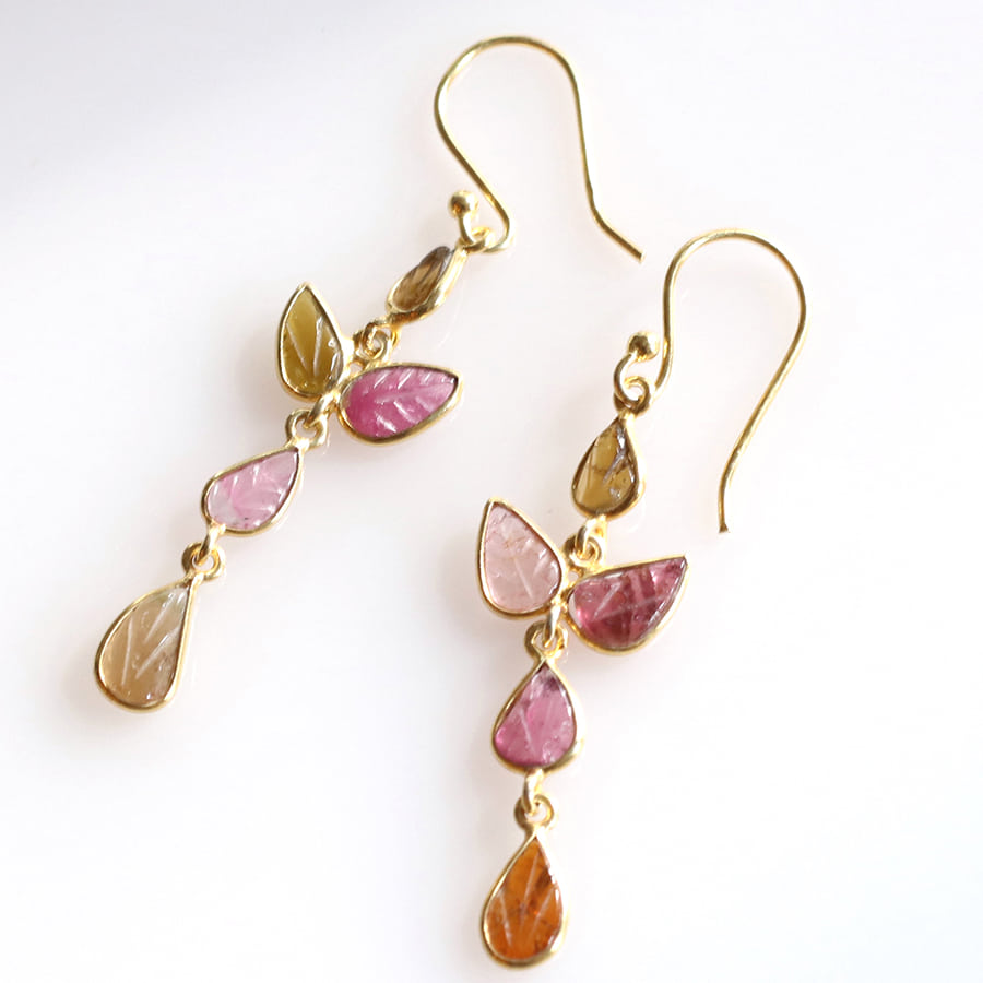 中世より宝石の街として知られる、インド・ジャイプールで手作りされている天然石のジュエリー。インドらしい繊細で動きのある優雅なデザインが特徴です。リーフ模様が彫られた薄くスライスカットされたトルマリンが、一つぶずつゆれる可愛らしいデザイン。透明感あるピンク系スモーキーカラーの絶妙に色味の違うグラデーションが美しいピアスです。<br><br>天然石を使用しているため、石には細かな傷やインクルージョンが見られる場合がございますが、石の個性としてご理解くださいませ。※写真の現品をお届けします。