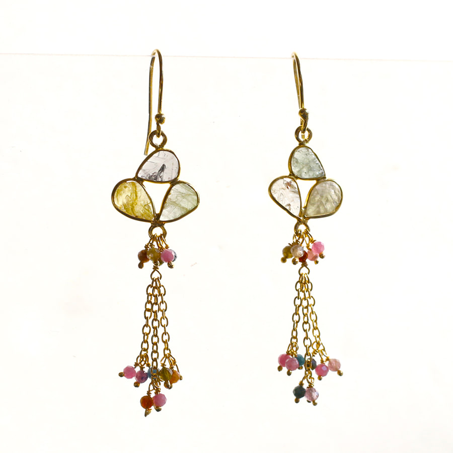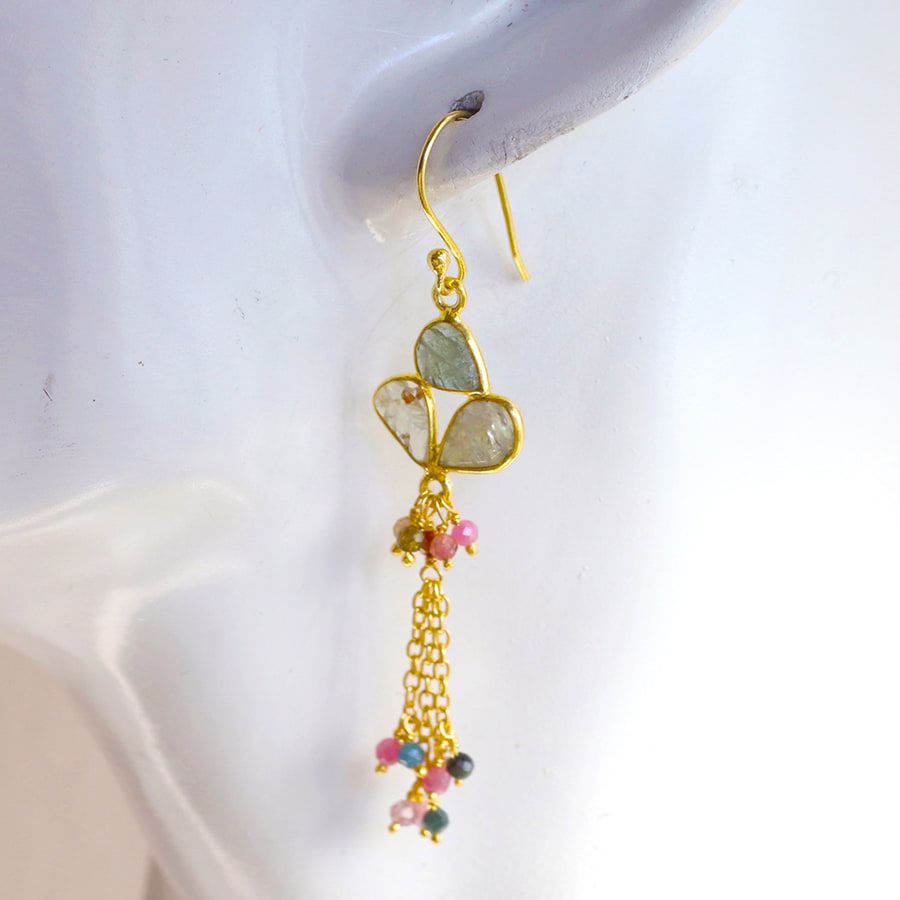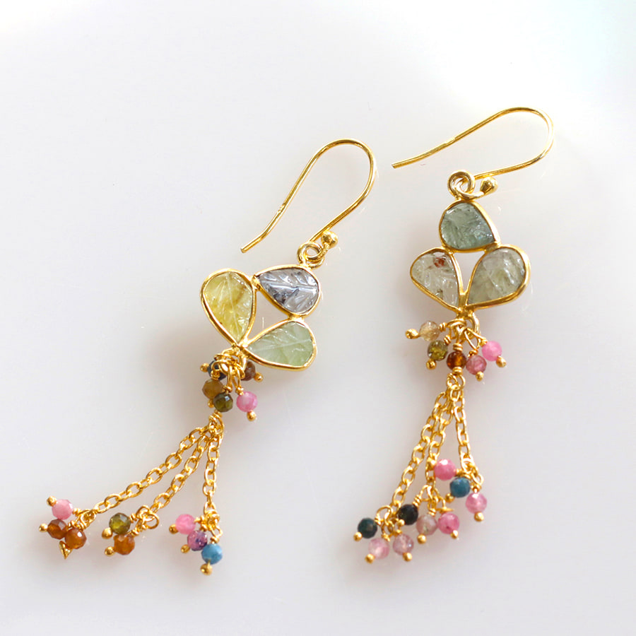 中世より宝石の街として知られる、インド・ジャイプールで手作りされている天然石のジュエリー。インドらしい繊細で動きのある優雅なデザインが特徴です。リーフ模様が彫られた薄くスライスカットされたトルマリンの先には、極小粒のトルマリンがついて揺れる可愛らしいデザインのトルマリンチェーンピアスです。<br><br>天然石を使用しているため、石には細かな傷やインクルージョンが見られる場合がございますが、石の個性としてご理解くださいませ。※写真の現品をお届けします。