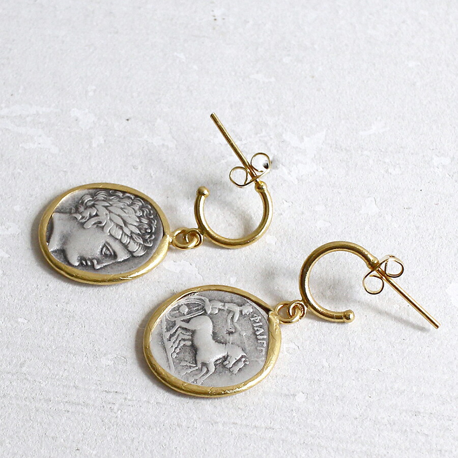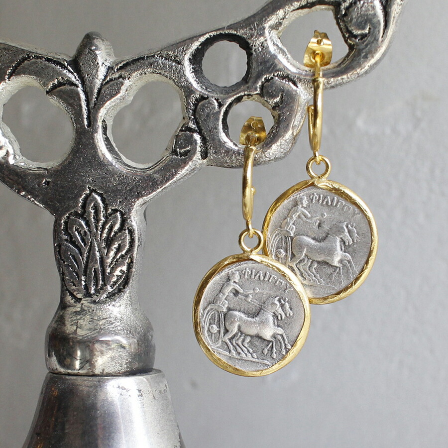 縁どられたゴールドカラーと白銀のコンビが上品な印象のコインモチーフのピアスです。表面には二頭の馬を従えた馬車が、裏面にはギリシア神話の神アポロンが彫られており、古代ロマンの神秘を感じさせます。*コイン直径1.8cm<br><br>