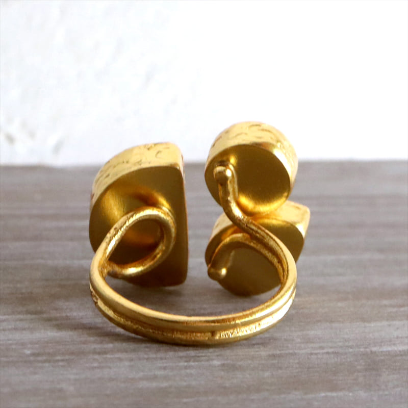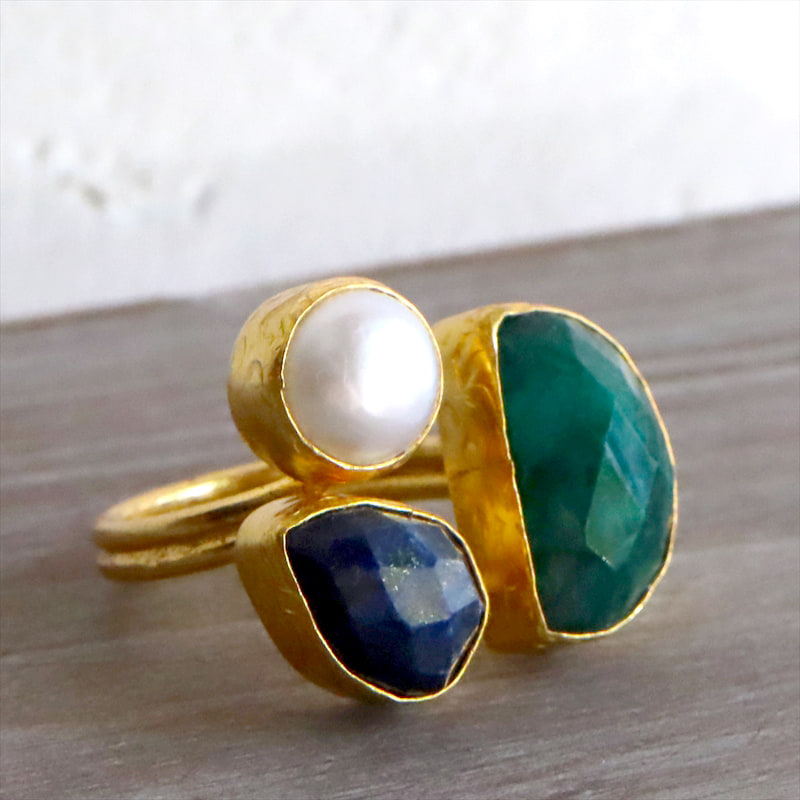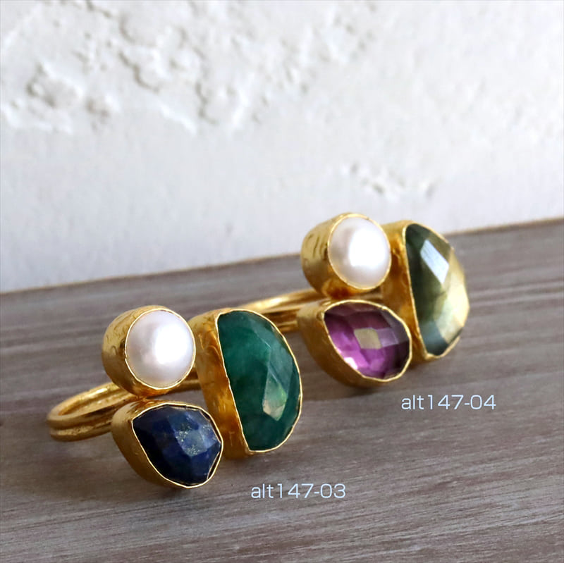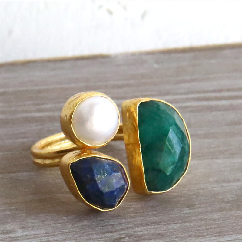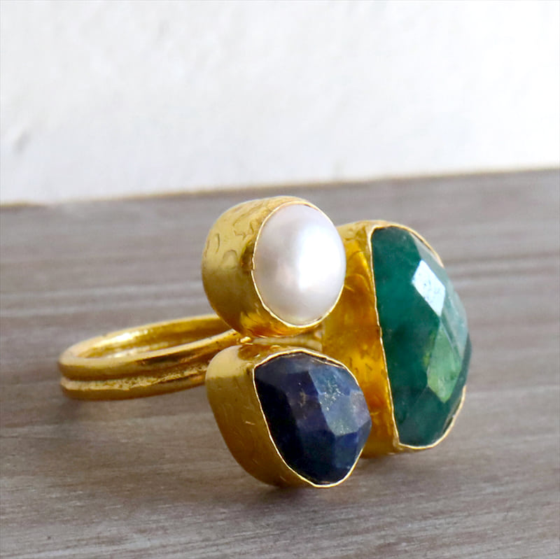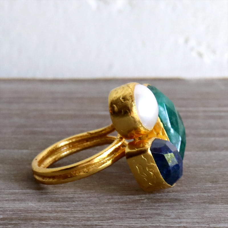 アルサメイア 三つの石のリング グリーンジェイド&ラピスラズリ&パール 天然石22KGP トルコジュエリー