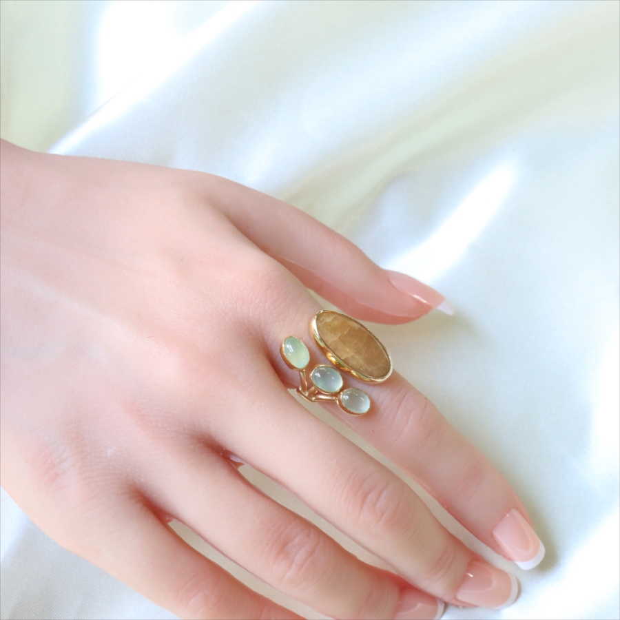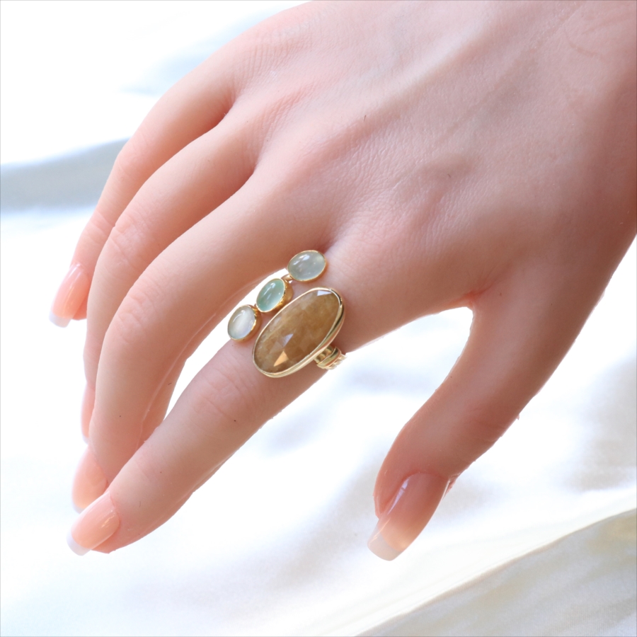 やさしい色味のベージュゴールドのサファイア。かわいらしいサイズのカボションカットの淡いパステルカラーのグリーンカルセドニーが三つ寄り添うようについたデザインのリングです。絶妙なニュアンスカラーが上品さを引き出します。それぞれの石は裏面が抜けているので、光を透す仕様になっています。※サファイア2.3×1cm