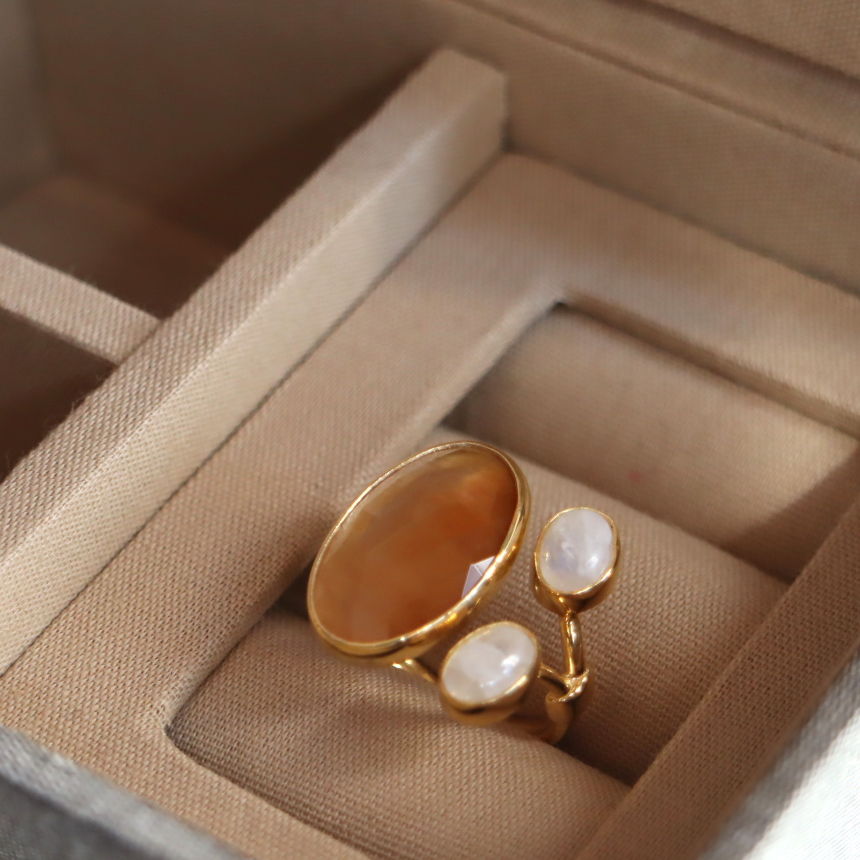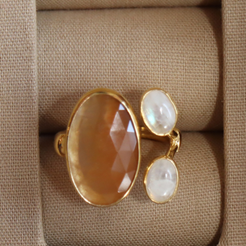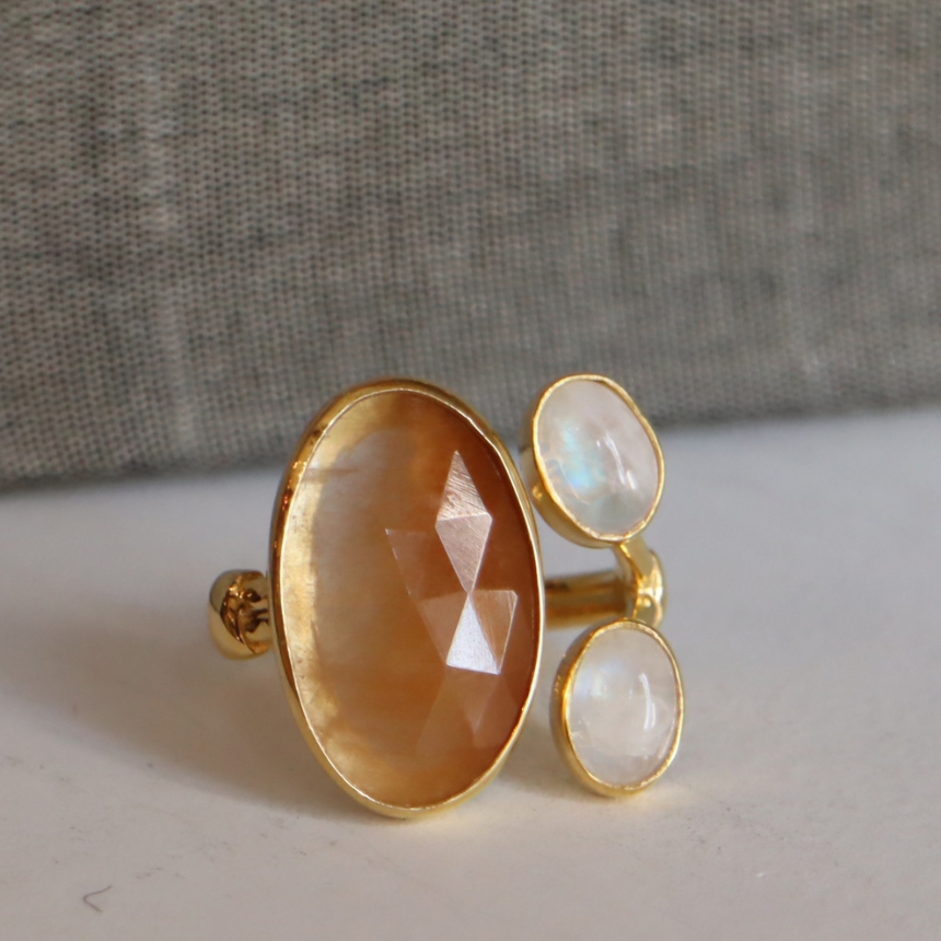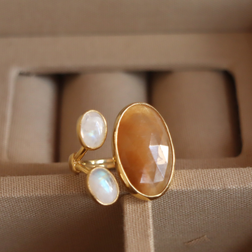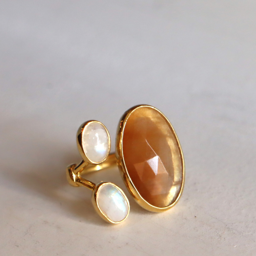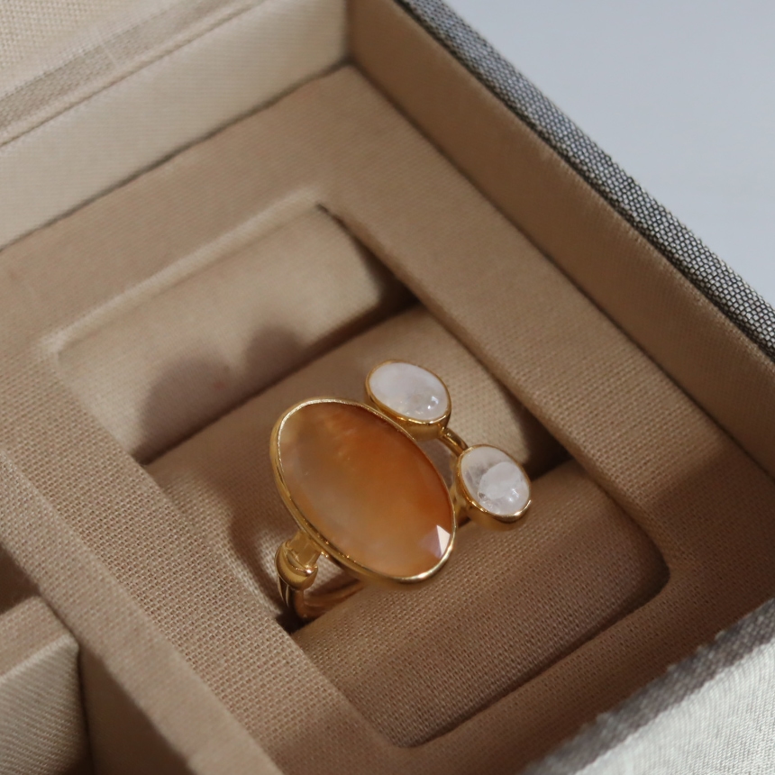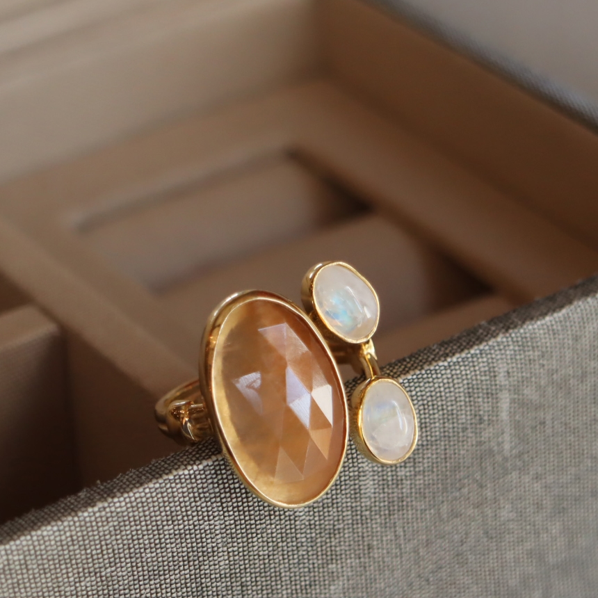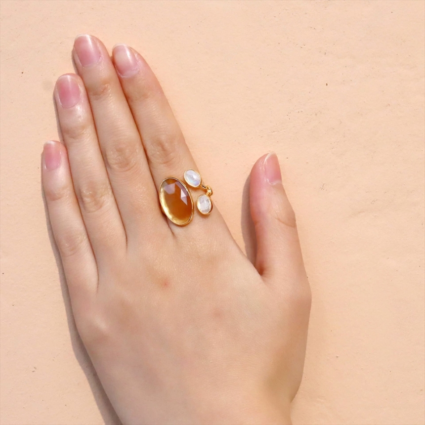 透明感ある淡いオレンジブラウンの美しいサファイア。かわいらしいサイズのカボションカットのムーンストーンが二つ寄り添うようについたデザインのリングです。絶妙なニュアンスカラーが上品さを引き出します。それぞれの石は裏面が抜けているので、光を透す仕様になっています。※石大1.8×1cm