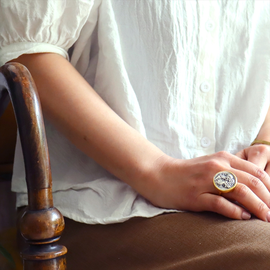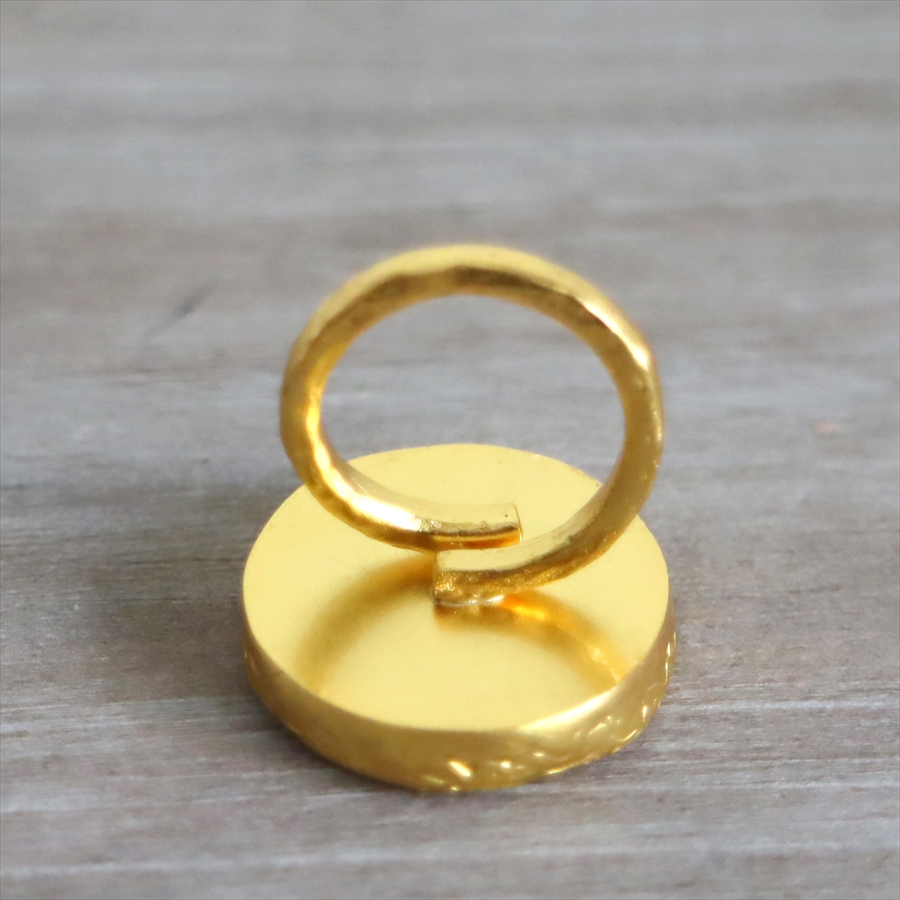 縁どられたゴールドカラーと白銀のコンビのコインモチーフのビッグリング。つや消しのツチメ加工による凹凸が手作り感あり個性的です。裏面は金貼りになっています。※コイン直径2.5cm