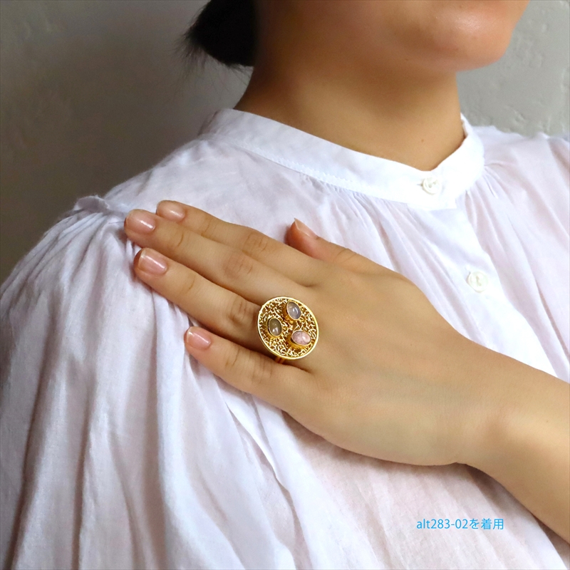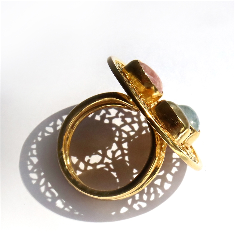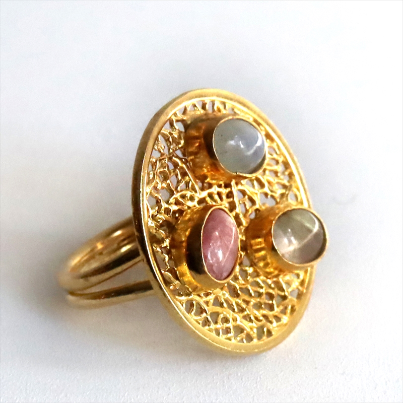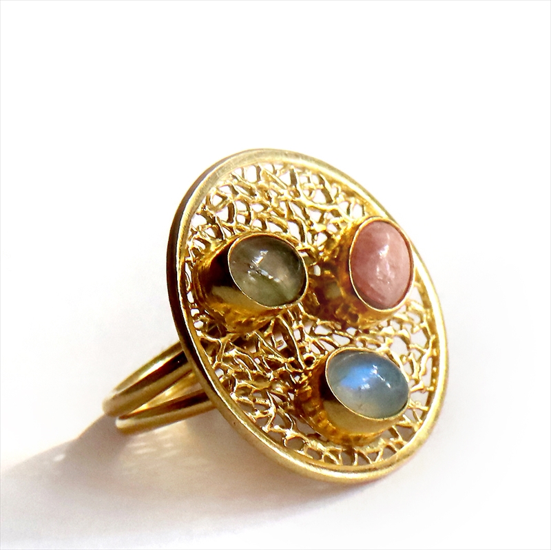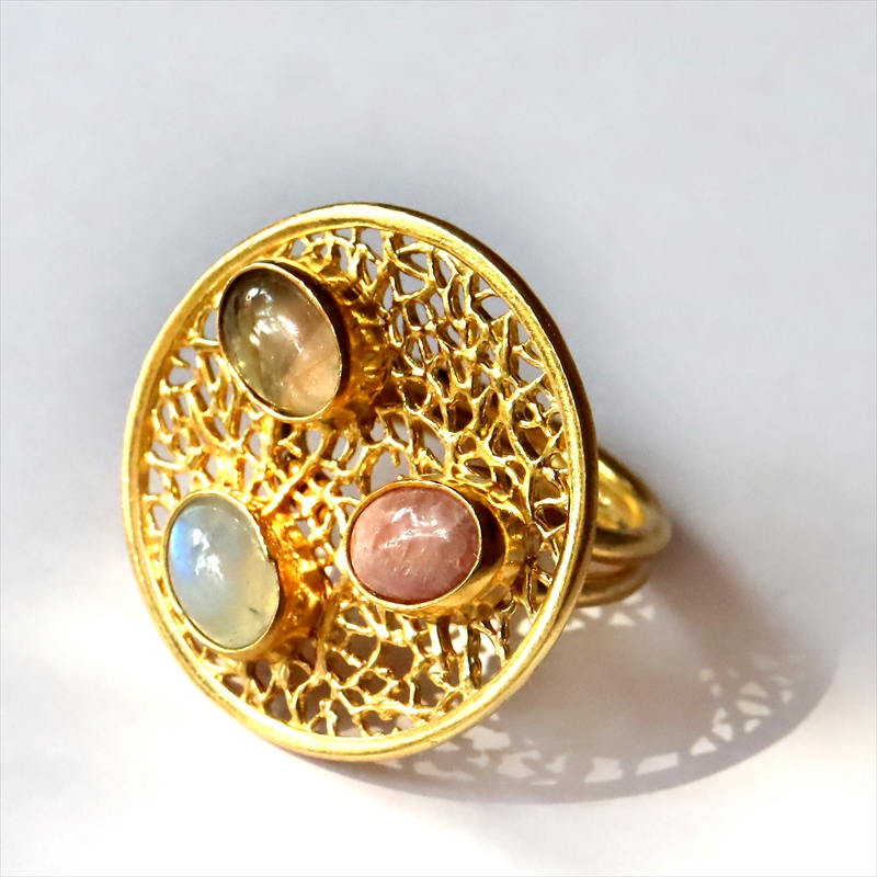 繊細なゴールドモチーフの上に三つのカボションカットの石がのったリング。ミルキーなピンクのロードクロサイト、青みのシラーが強く出ているレインボームーンストーン、クォーツの中にはブラウンゴールドのルチル(針状の結晶)が見えるルチルクォーツ。優しい雰囲気のカラーが集まったリングです。※石一つ約0.8×0.5cm
