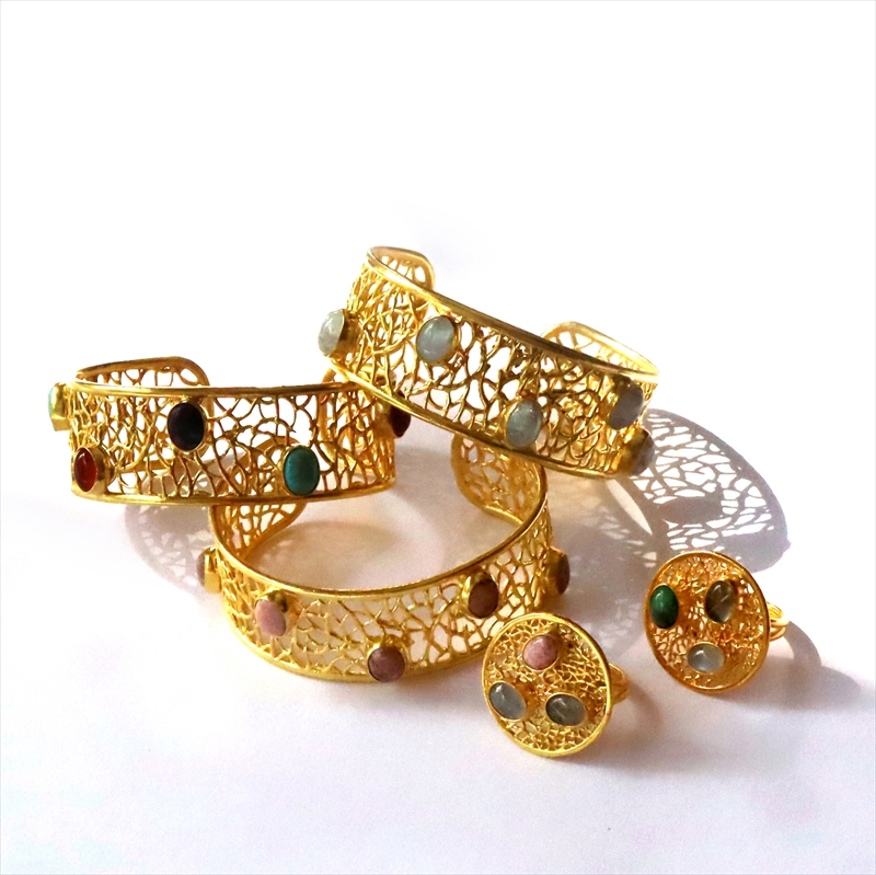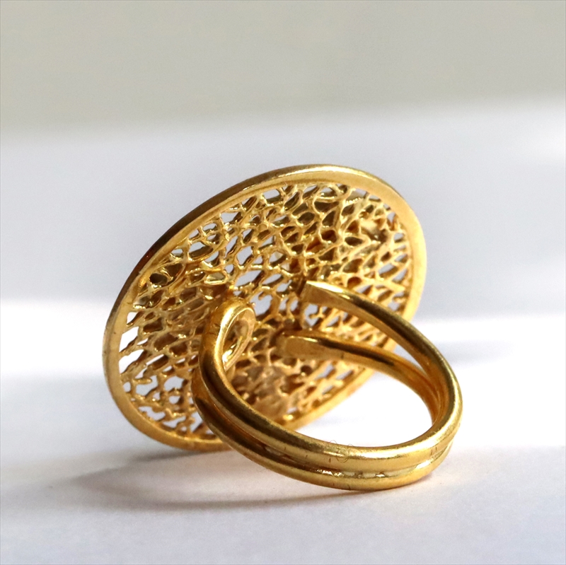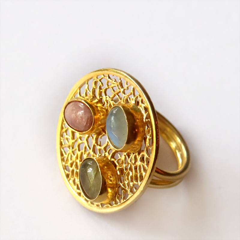 ロードクロサイト×レインボームーンストーン×ルチルクォーツ ゴールドモチーフサークルリング 22KGP トルコジュエリー