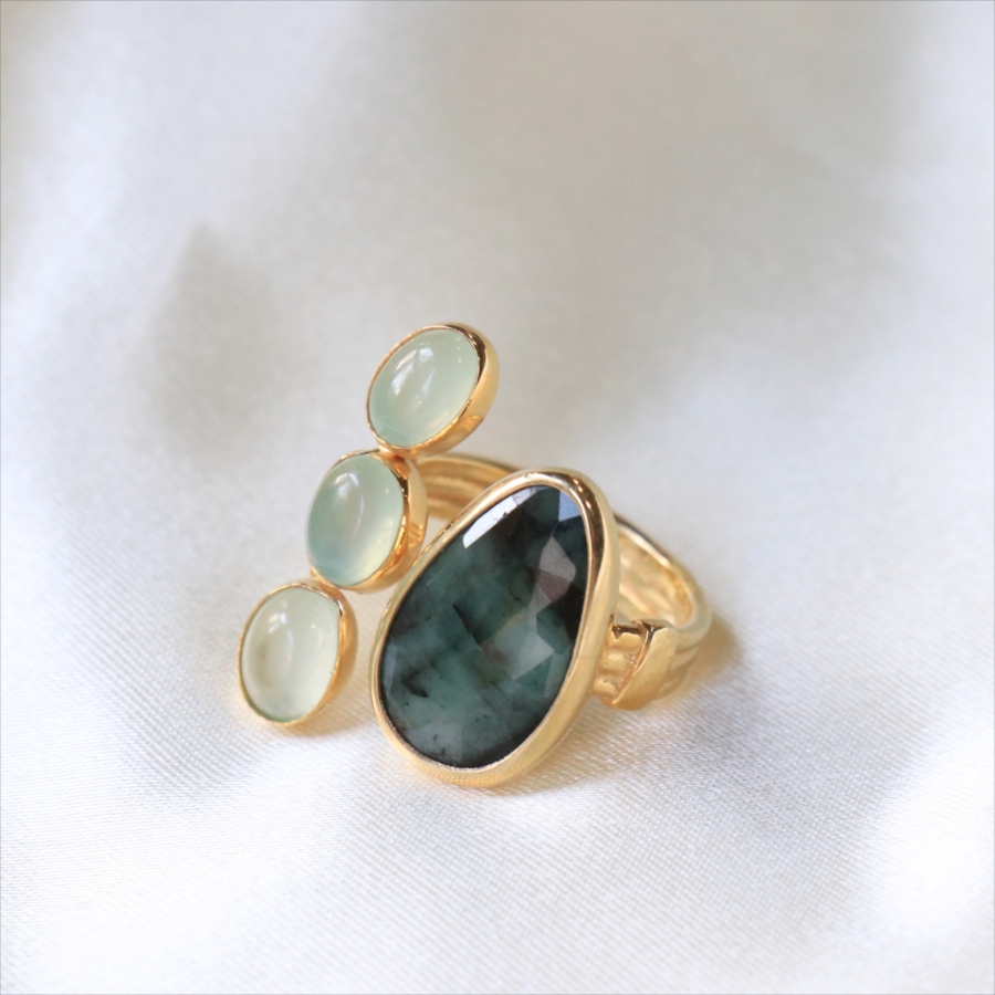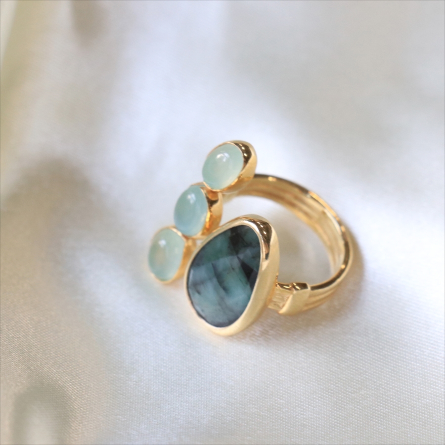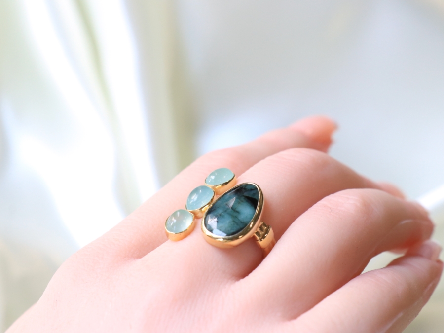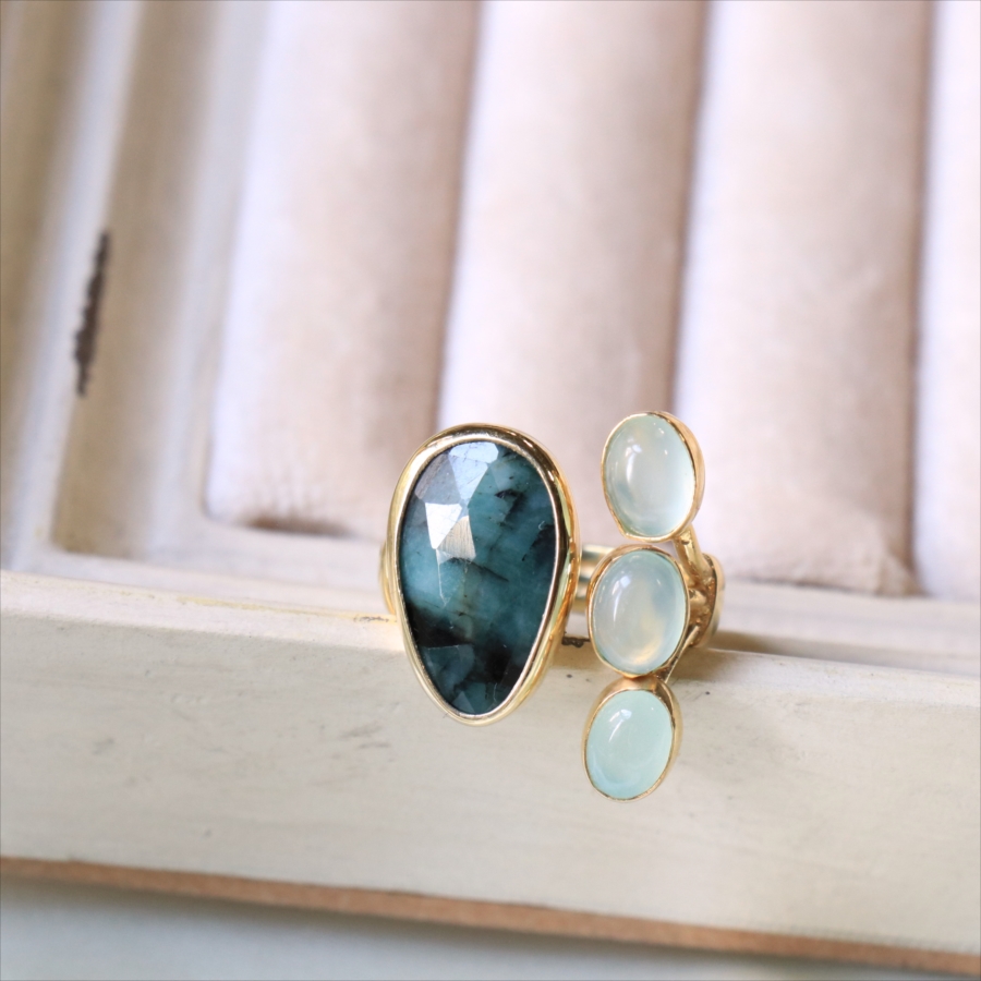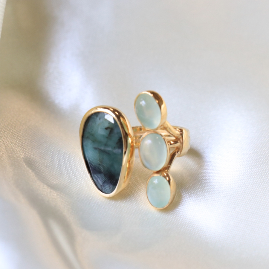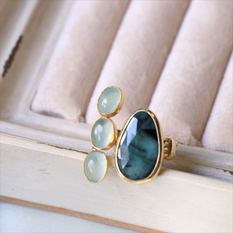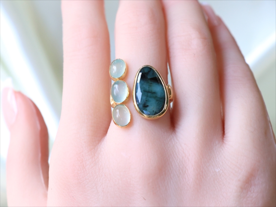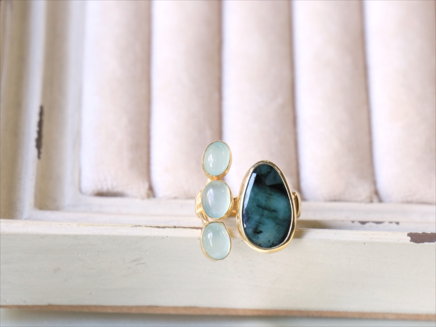 鮮やかな深いモスグリーンの中に淡い濁りの結晶がにじんだようなニュアンスあるサファイアと、みずみずしいミントグリーンのカルセドニーが三つ並んだリング。落ちついた色あいながら、サファイアの輝きが大変美しく存在感を放っています。それぞれの石は裏面が抜けているので、光を透す仕様になっています。。※サファイア1.6×1cm
