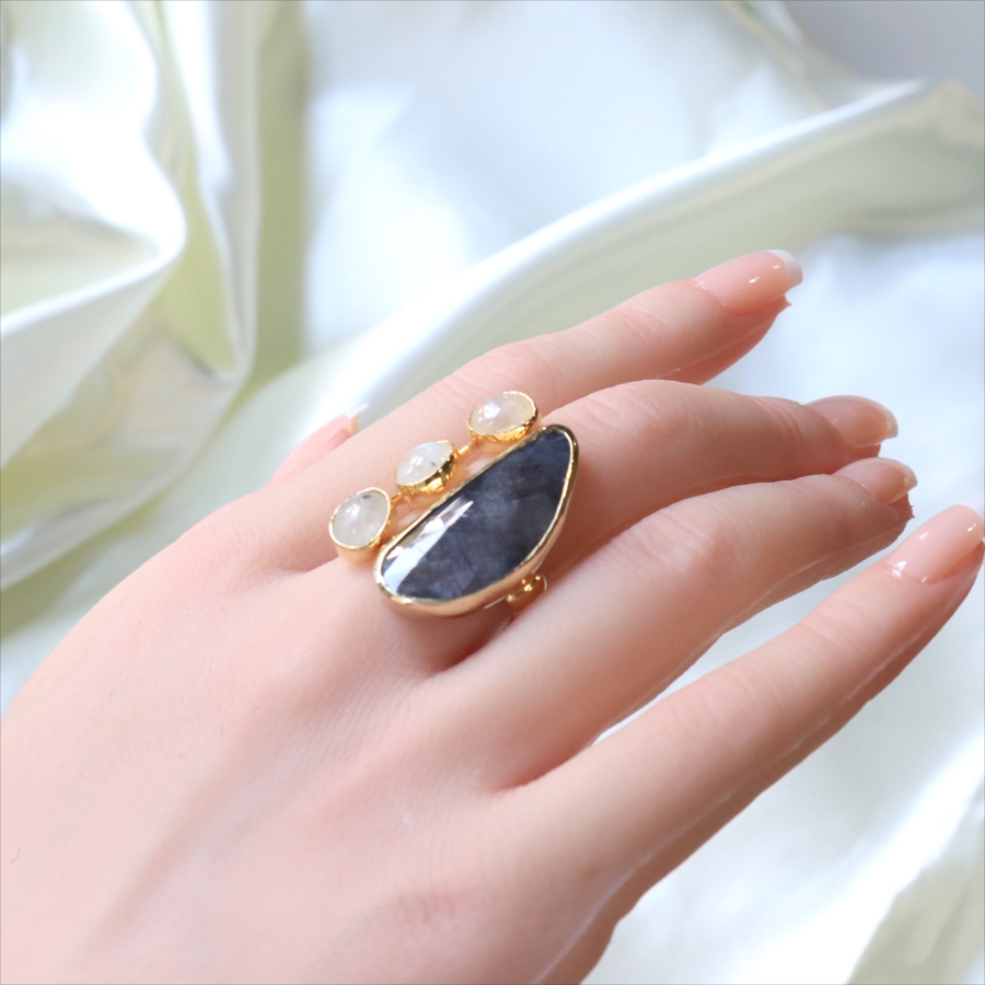 わずかにブルーがかった深いグレーにやわらかな白い結晶がにじんだような色味が美しいサファイア。かわいらしいサイズのカボションカットのムーンストーンが三つ寄り添うようについたデザインのリングです。絶妙なニュアンスカラーが上品さを引き出します。それぞれの石は裏面が抜けているので、光を透す仕様になっています。。※サファイア2.8×1.3cm