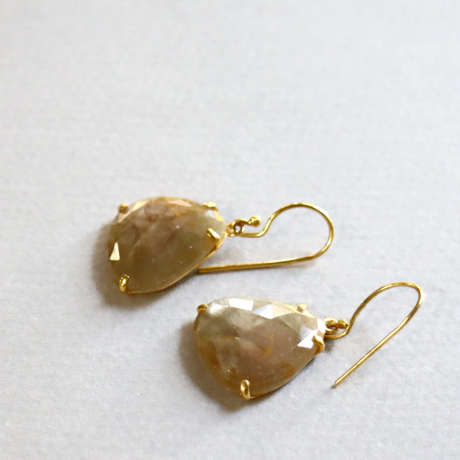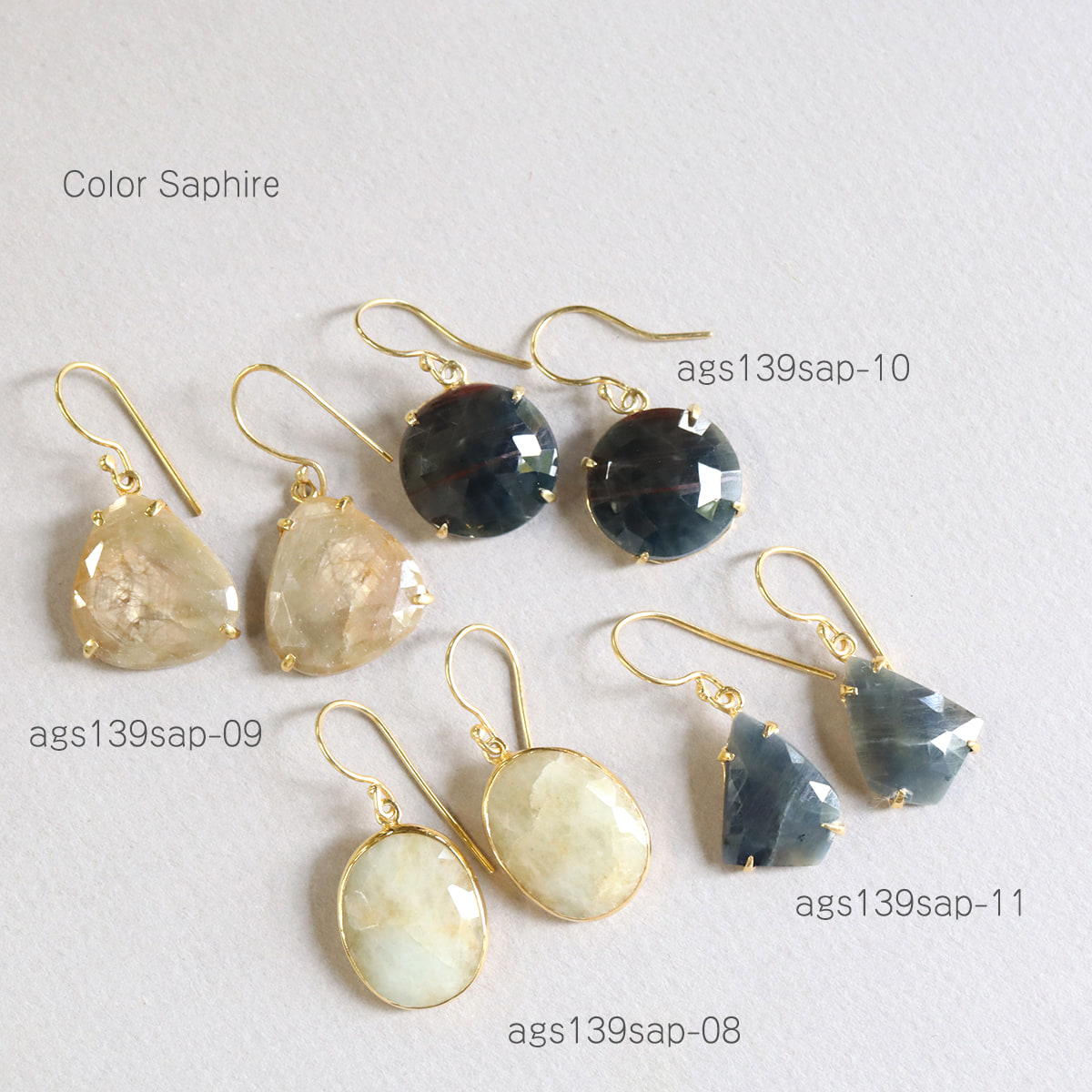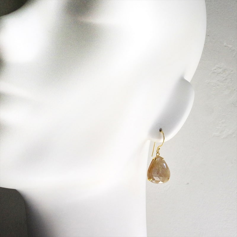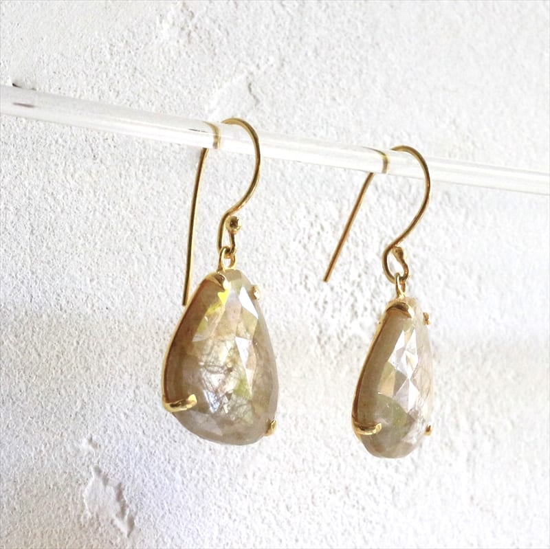 淡いベージュゴールドの輝きが美しいサファイアシルバーピアス。肌なじみよいカラーで、耳元でキラキラと揺れ、華やかな印象です。