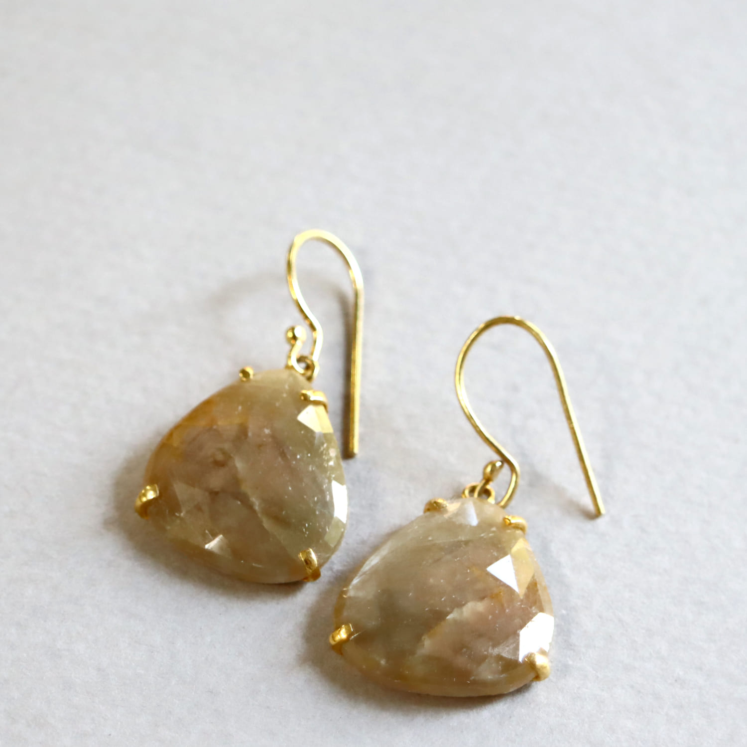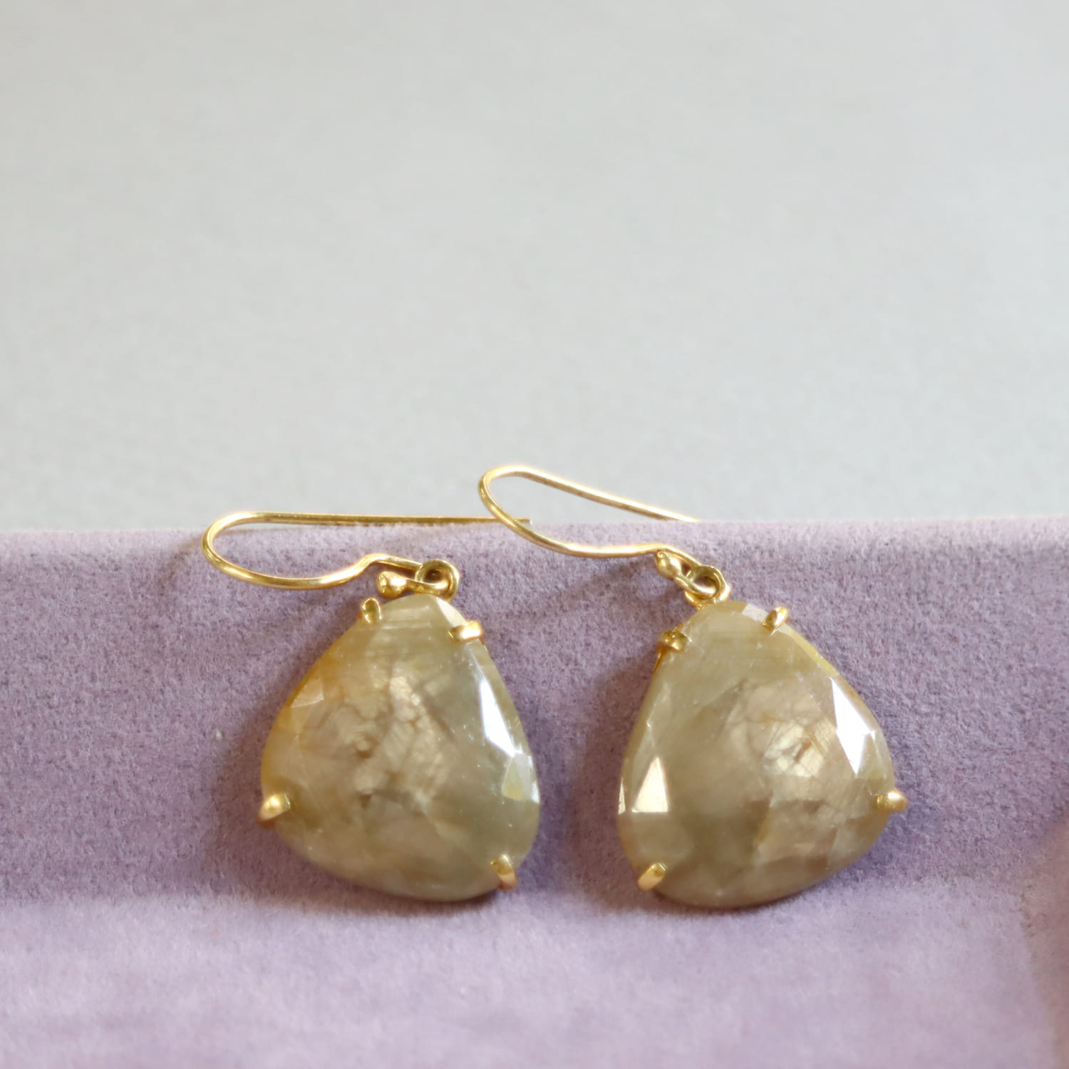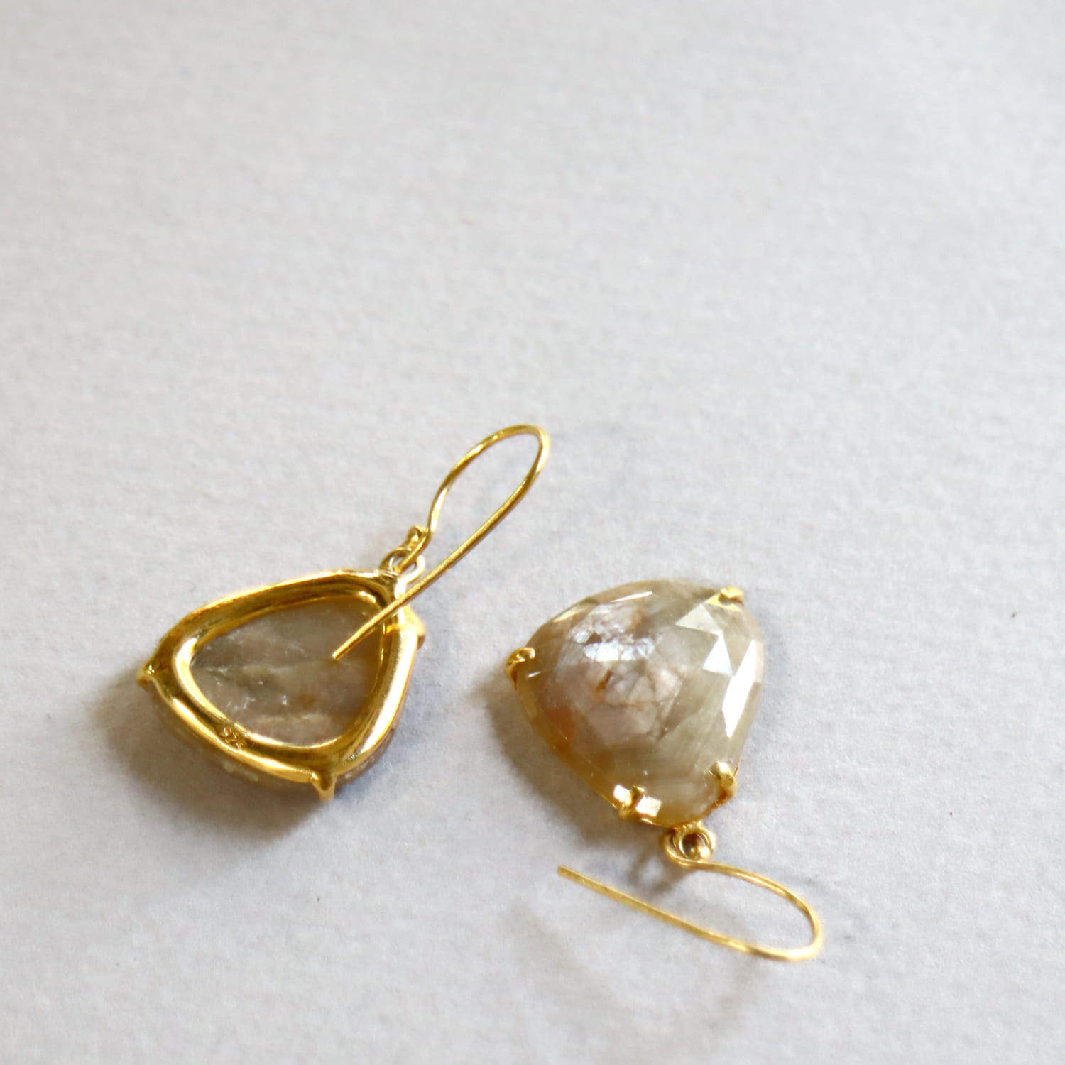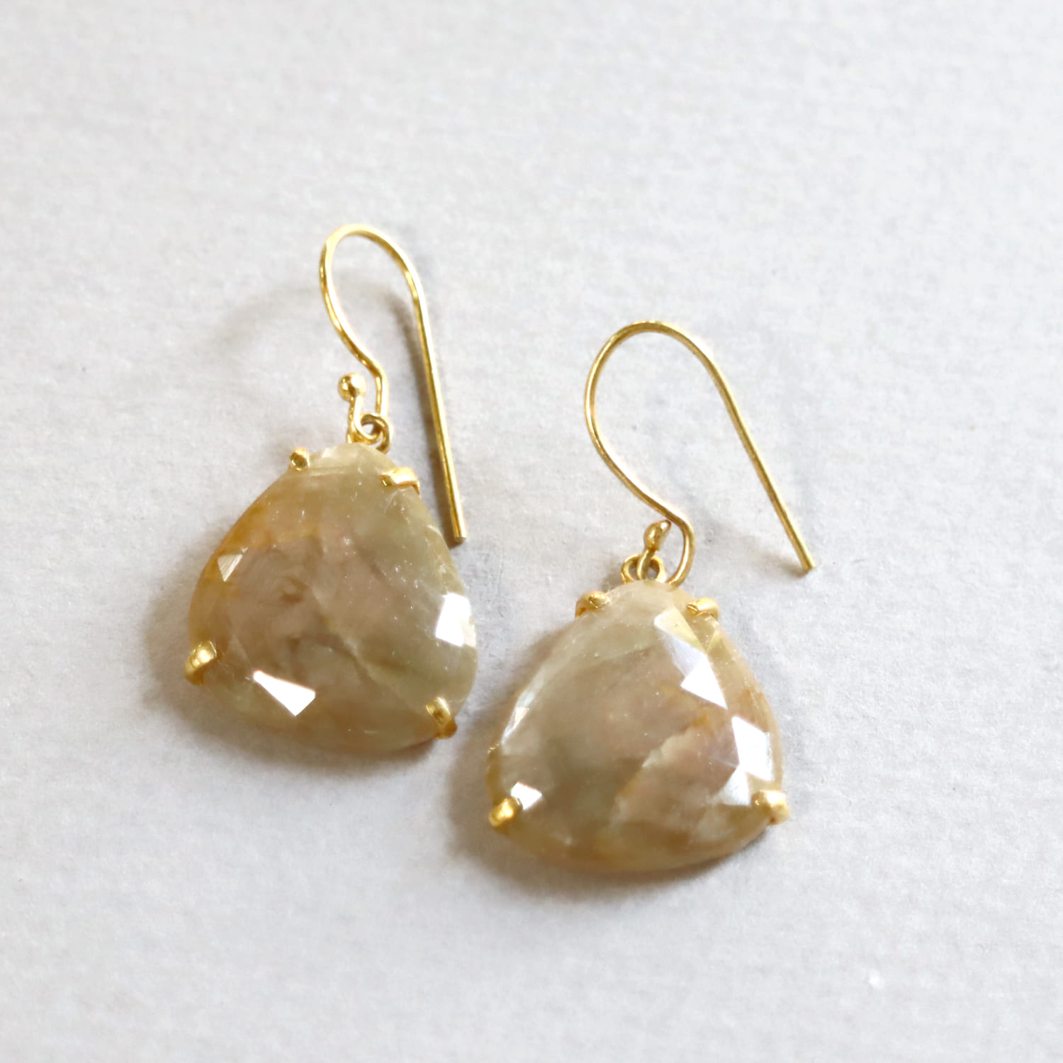 淡いベージュゴールドの輝きが美しいサファイアシルバーピアス。肌なじみよいカラーで、耳元でキラキラと揺れ、華やかな印象です。