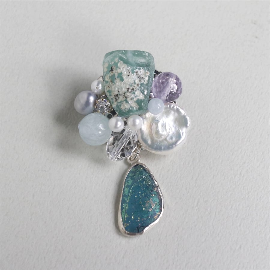 ローマンガラス & バロックパール ブローチ 花束のようなグラデーション