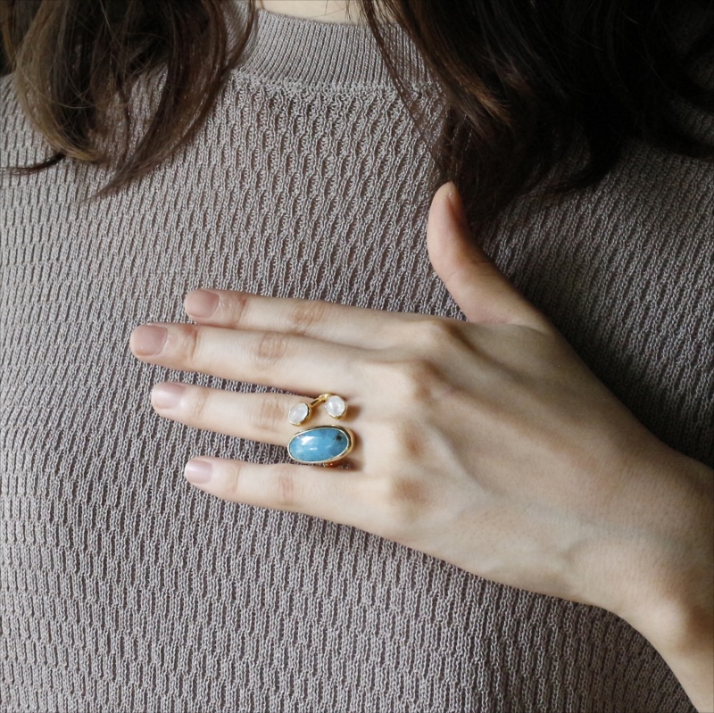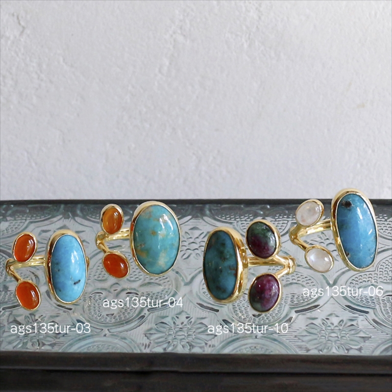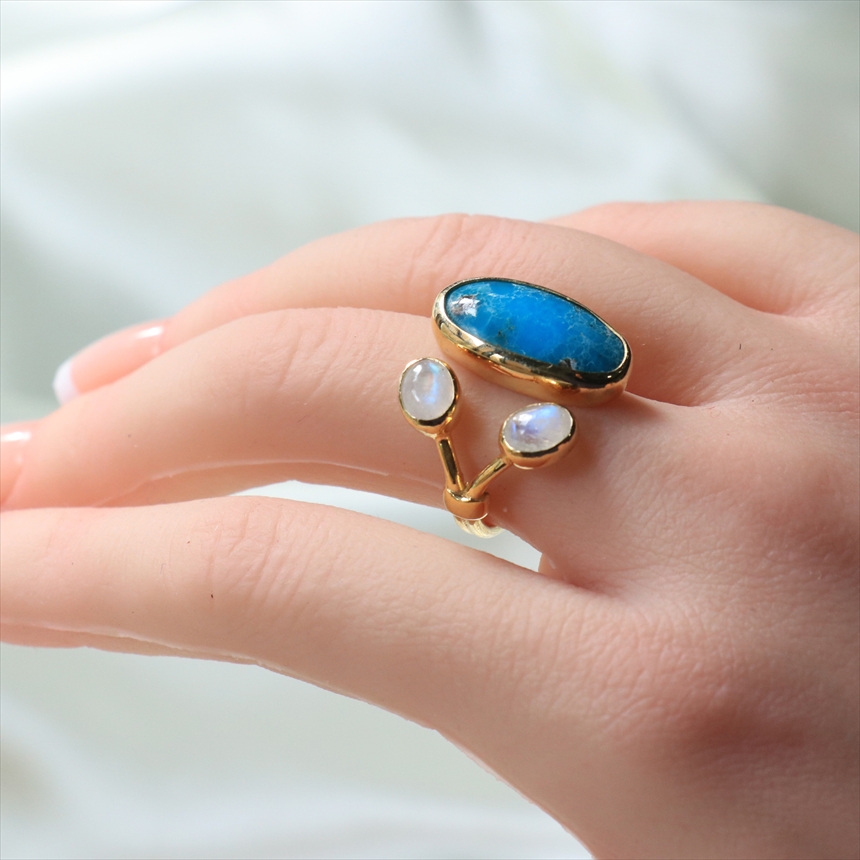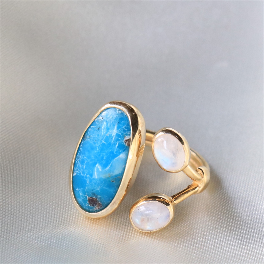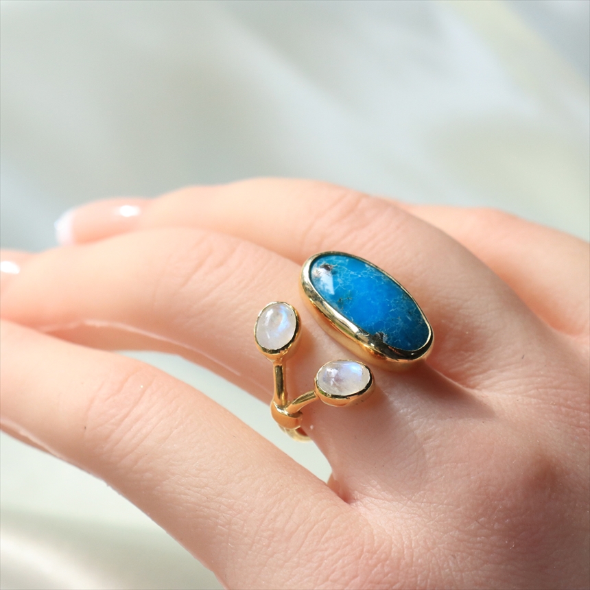 大粒のマットなターコイズと、かわいらしいサイズのカボションカットのコロンとした二つのレインボームーンストーンの組み合わせが大人っぽいリング。それぞれの石は裏面が抜けているので、光を透す仕様になっています。※ターコイズ1.8×1cm