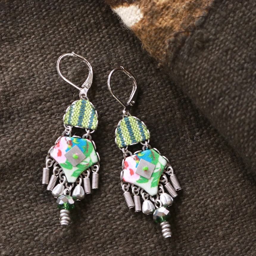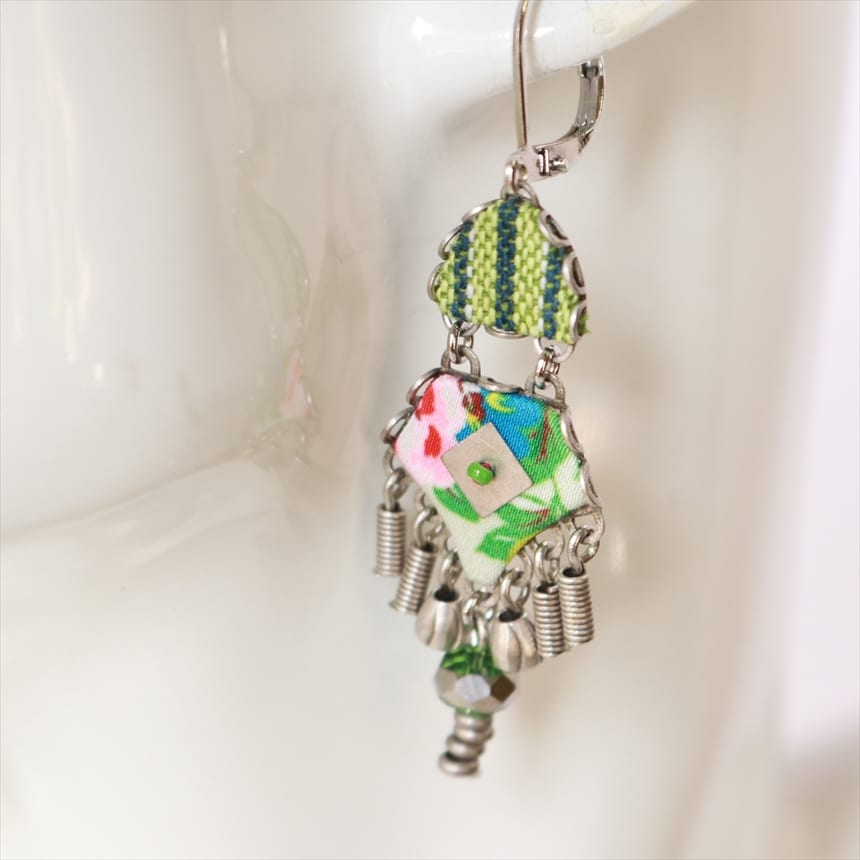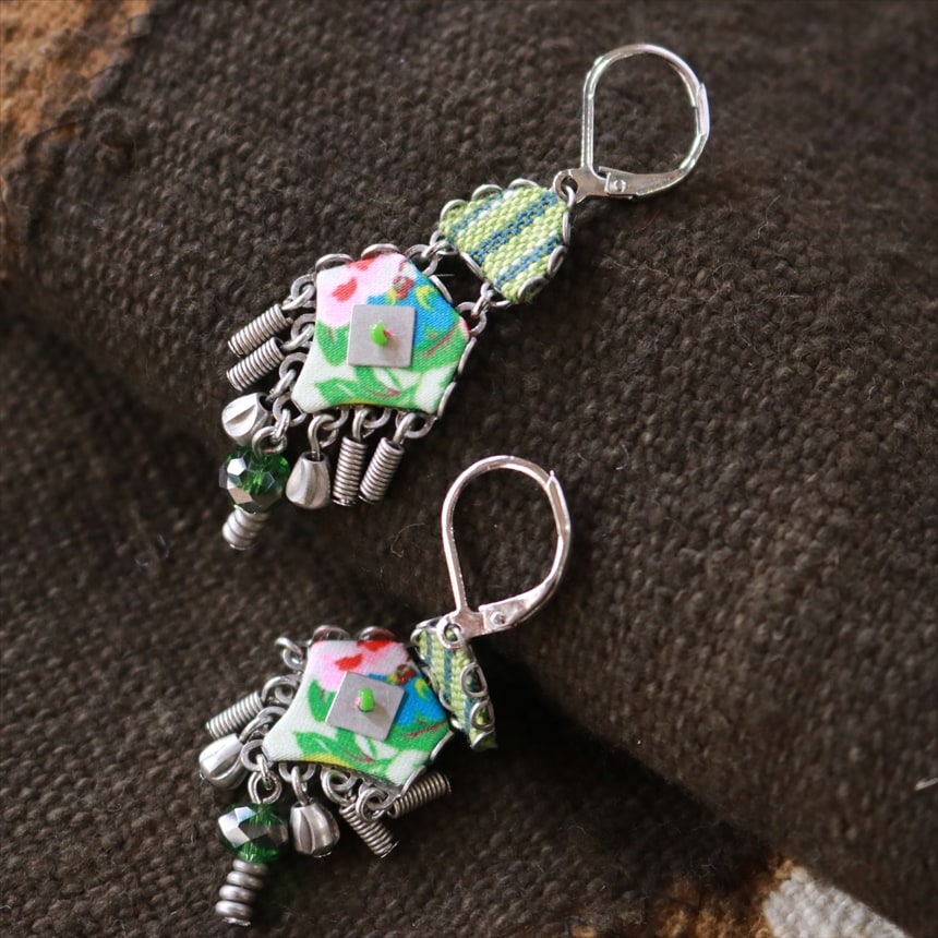 グリーンンをベースに、レトロなお花のプリントファブリックを合わせてあります。シャラシャラと揺れる真鍮パーツが心地よい!