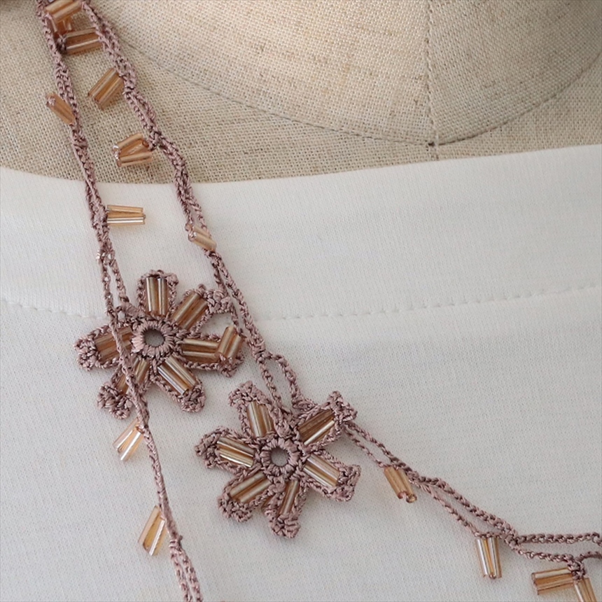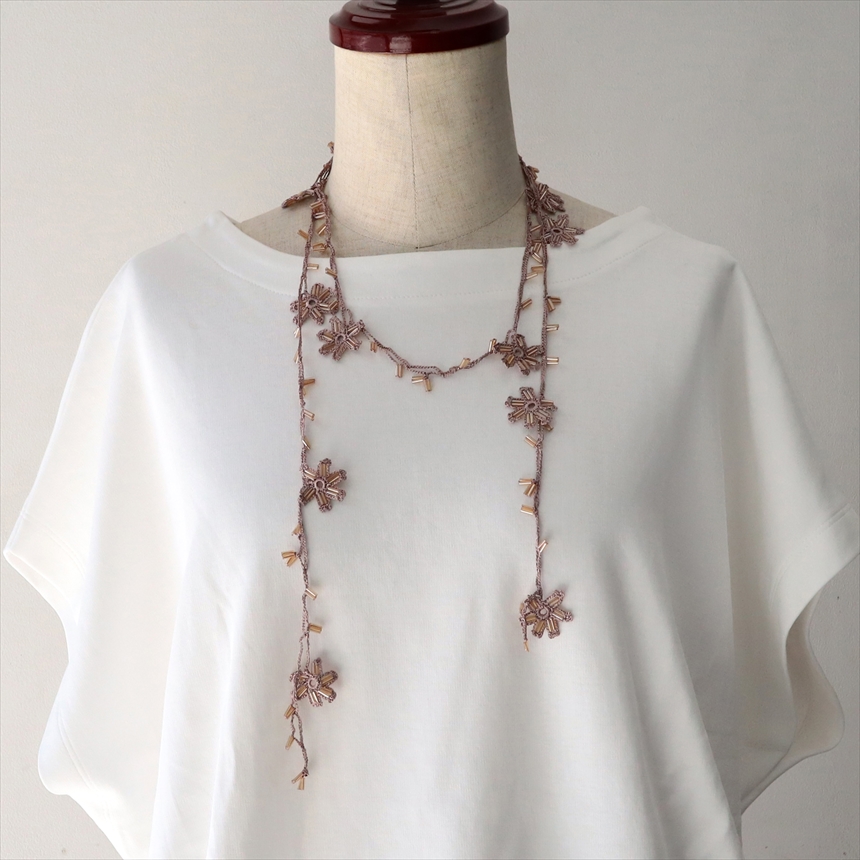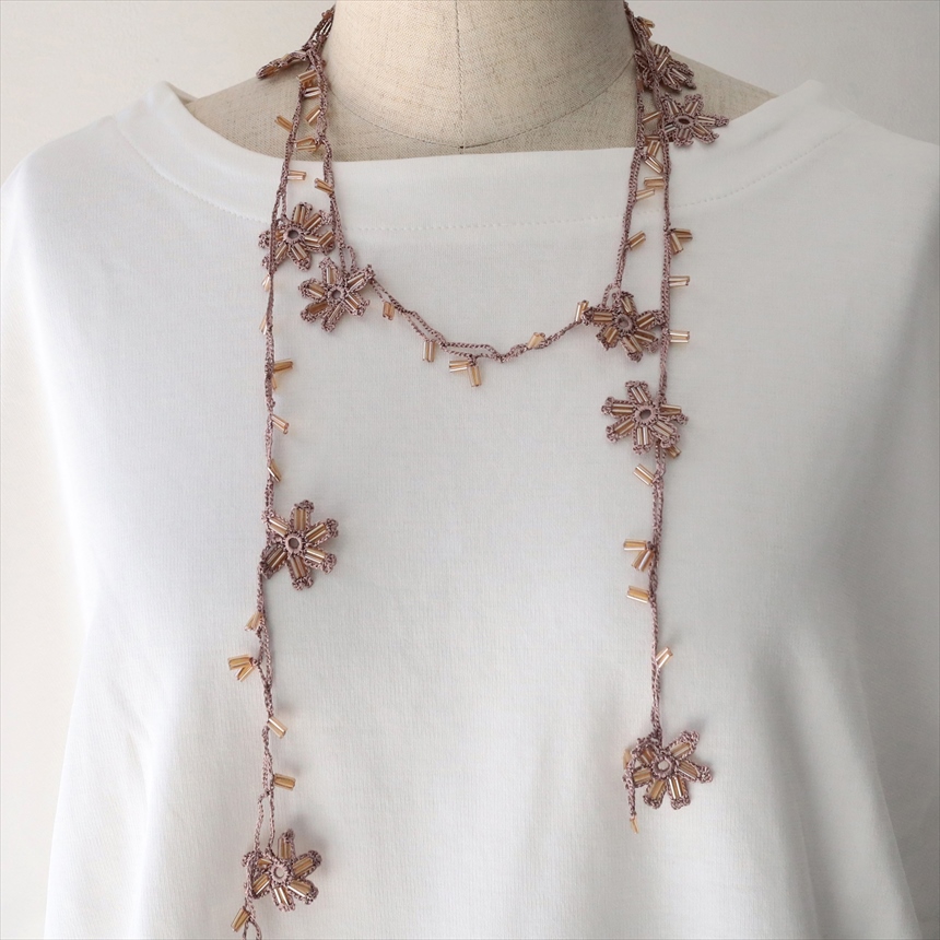 トルコの伝統的な手芸「オヤ」をモチーフにして、手編みで作られたネックレスです。このピースは、かぎ針で編んだ「トゥ・オヤ」。様々な色の取り合わせが、首もとを華やかに彩ります。巻き方次第で印象が変わるので、その日のお洋服に合わせてお楽しみいただけます。