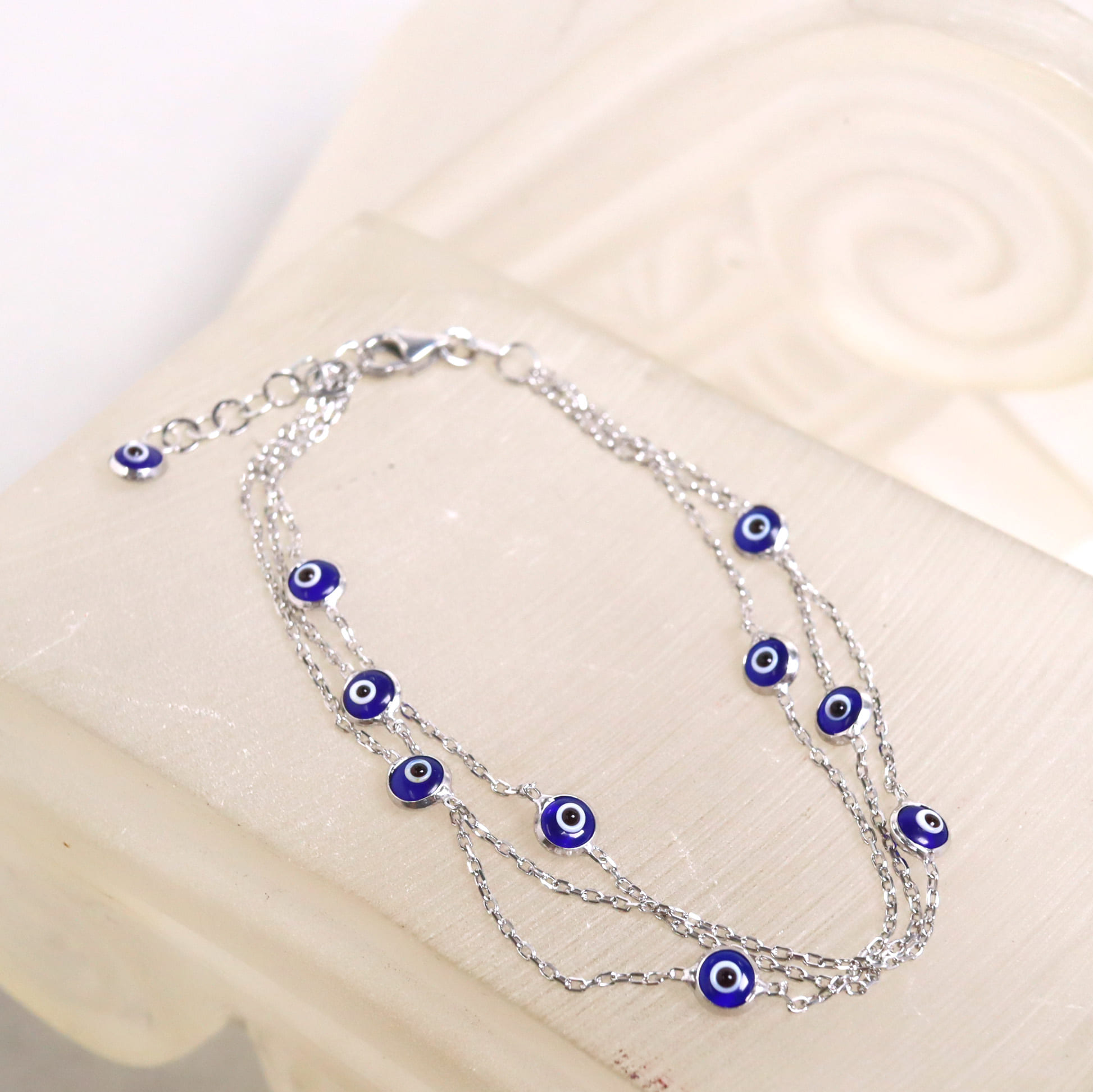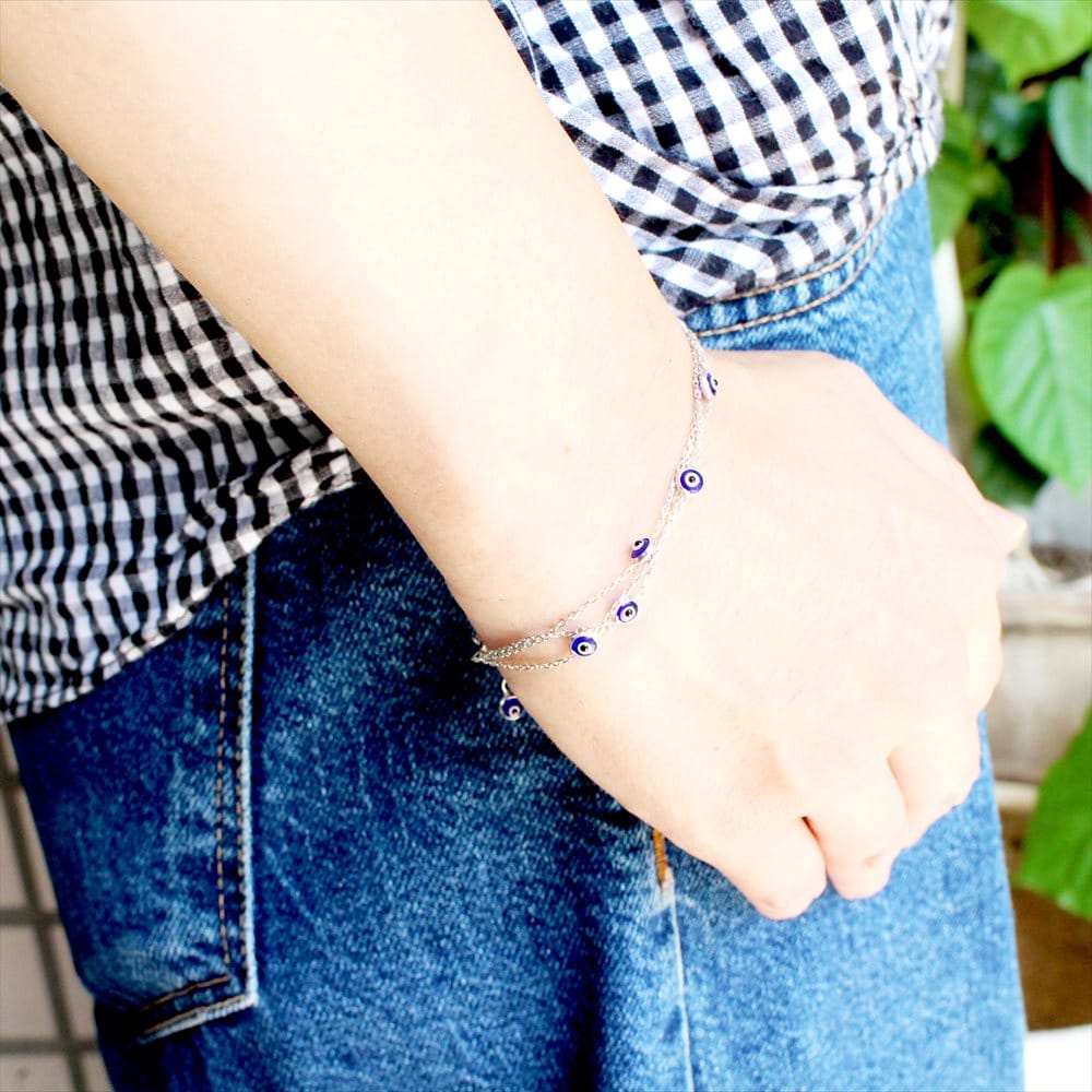 小さなナザルボンジュウと、きゃしゃなシルバーチェーンが三連になった女性らしいブレスレット。フェニキア時代の古代より地中海に伝わる青い目玉のお守り“ナザルボンジュウ”は、魔よけのお守り〜と説明されることが多いのですが、悪魔祓いというよりは、他人からのやっかみやジェラシーの目から、自分を守ってくれるためのお守りです。ガラスの目玉が割れてしまったときは、自分の代わりにナザルボンジュウが、他人の視線を受け止めてくれた…ということなのとか。ひとつひとつ手作りのため、少々形がくずれていたりガラスに気泡が入っていることもありますが、手作りならではの味わいということでお楽しみいただければと思います。<br><br>