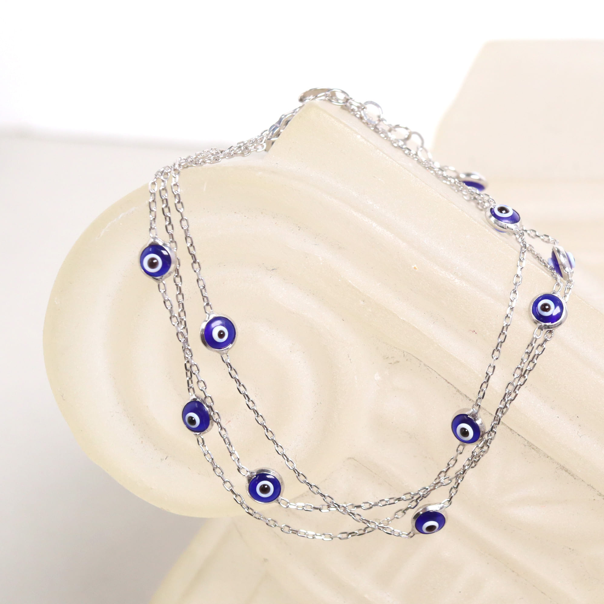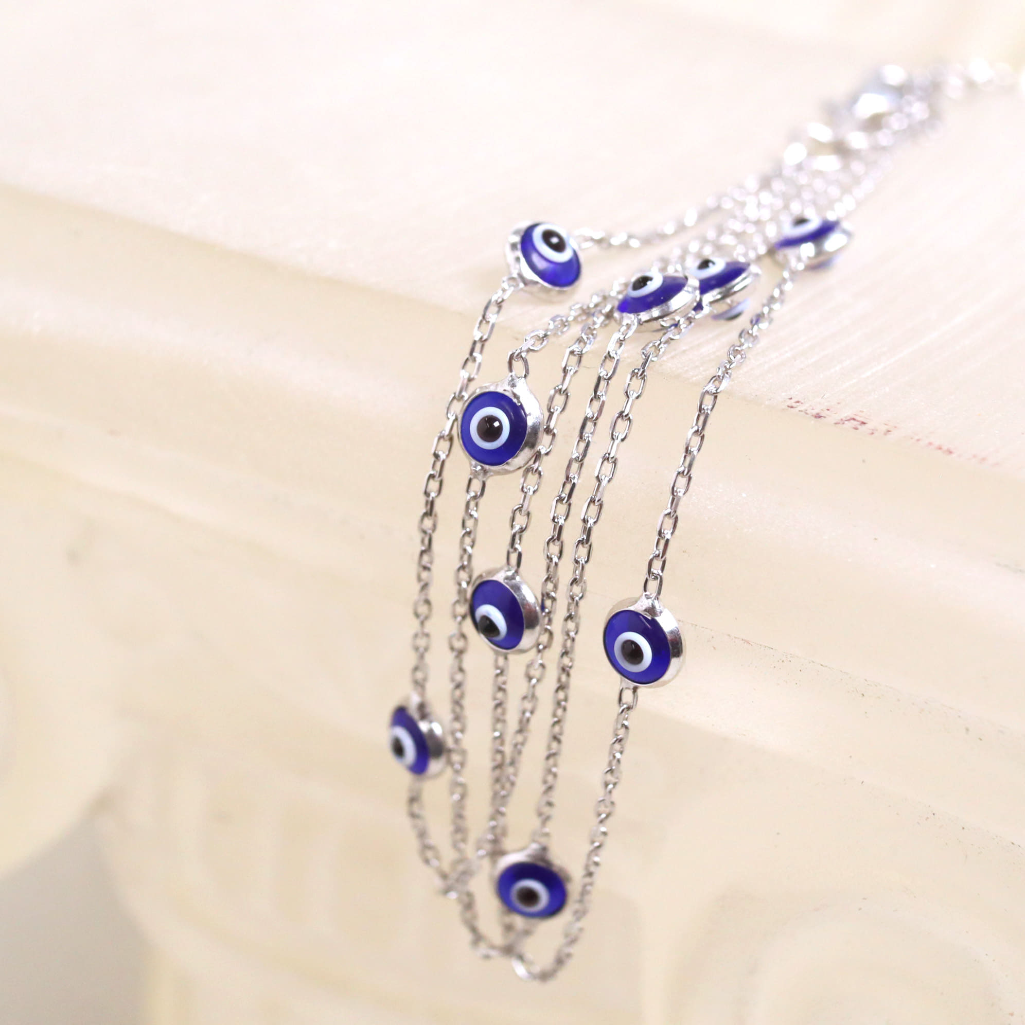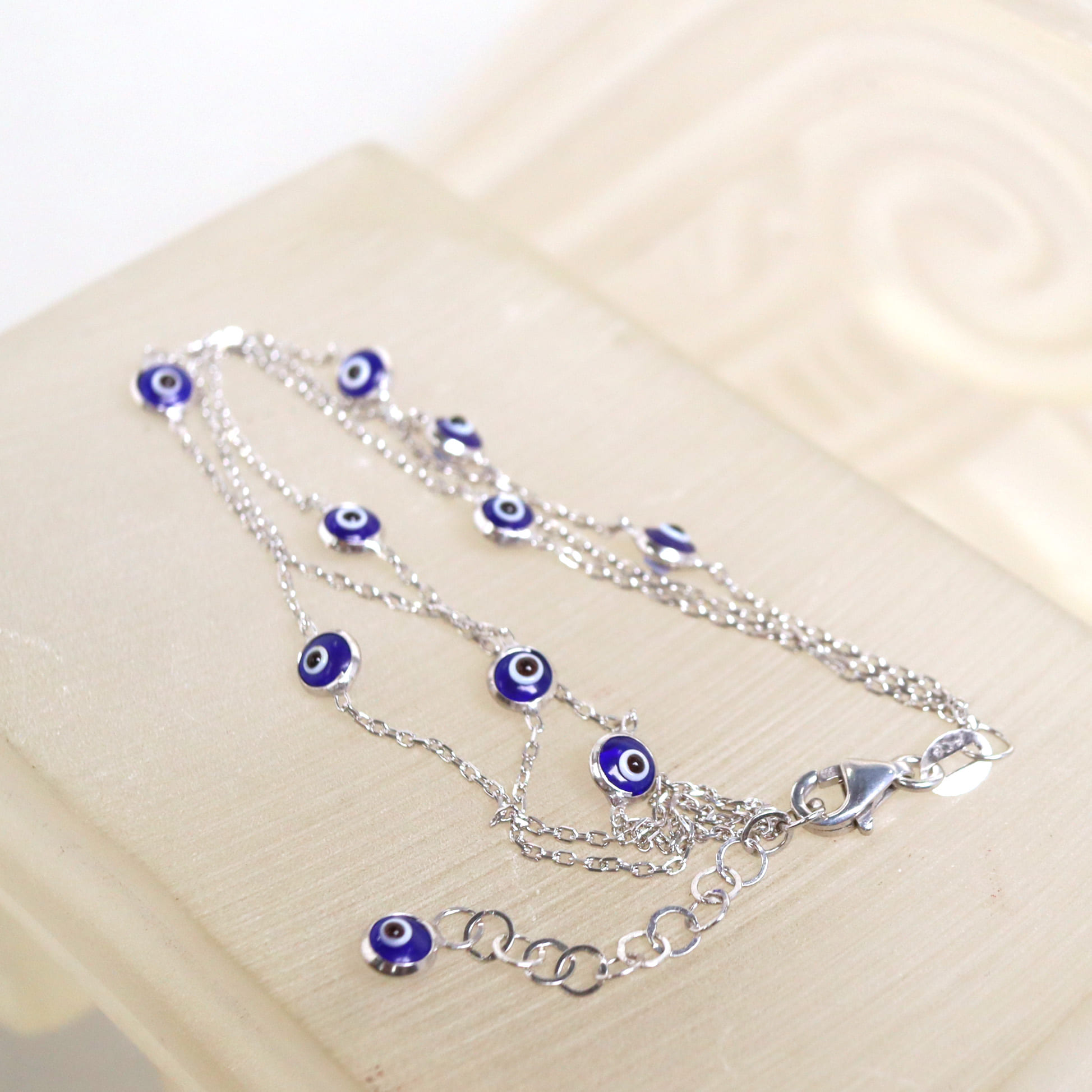ナザルボンジュウ&シルバーチェーン ブレスレット 三連 カラービーズ コバルトブルー 華奢 細め