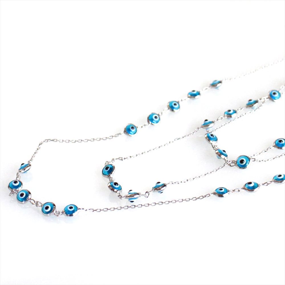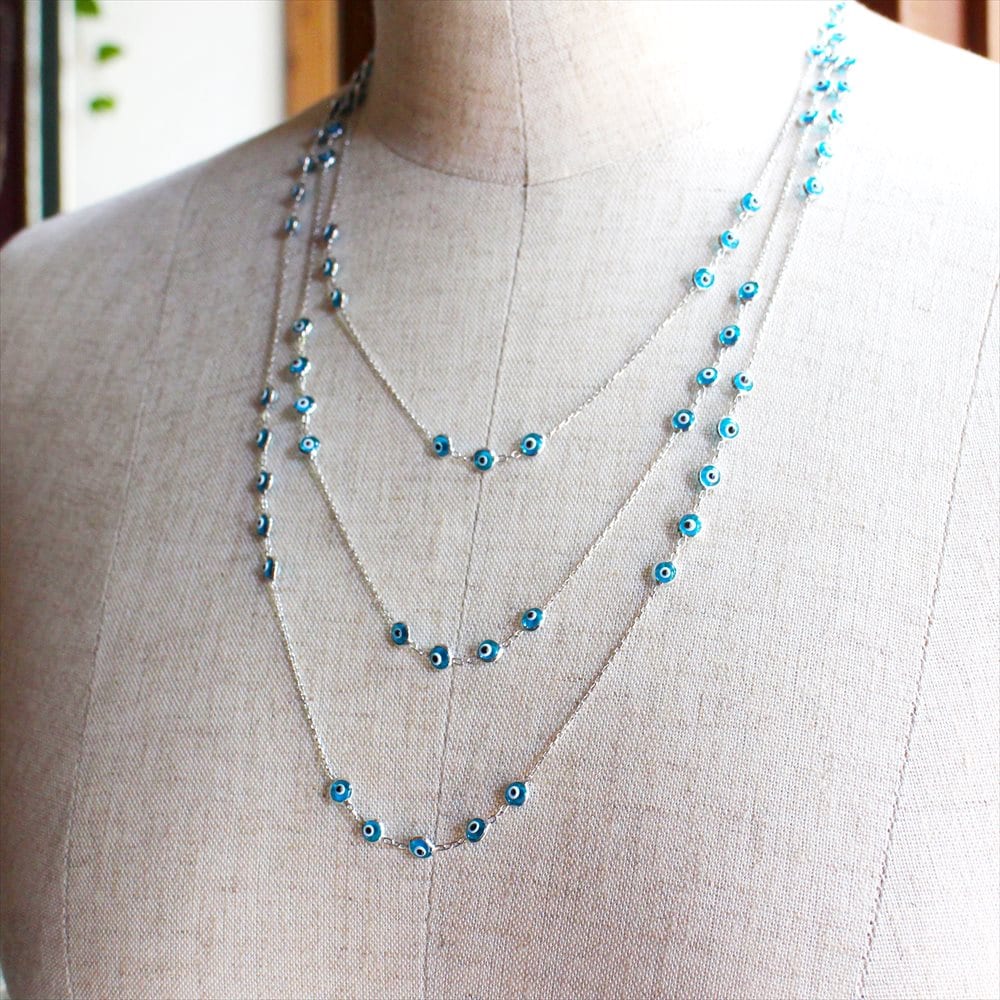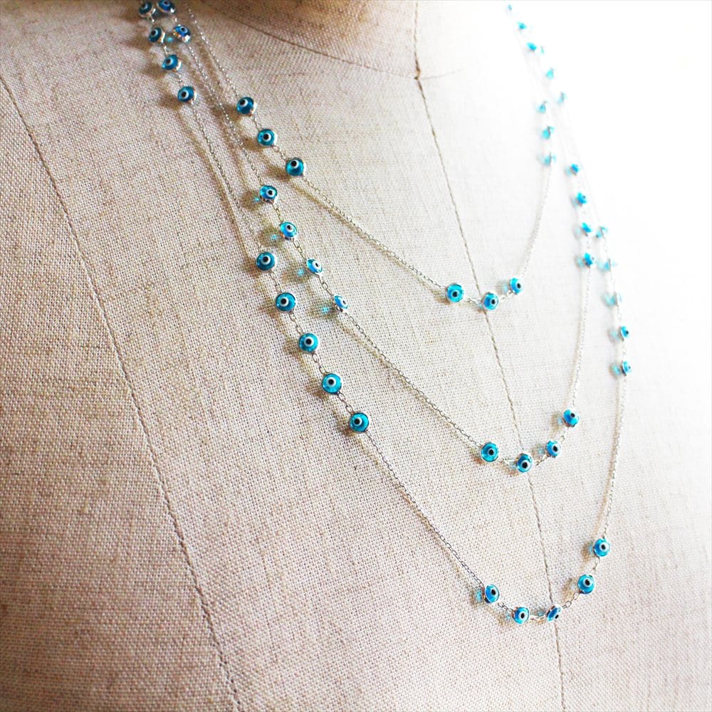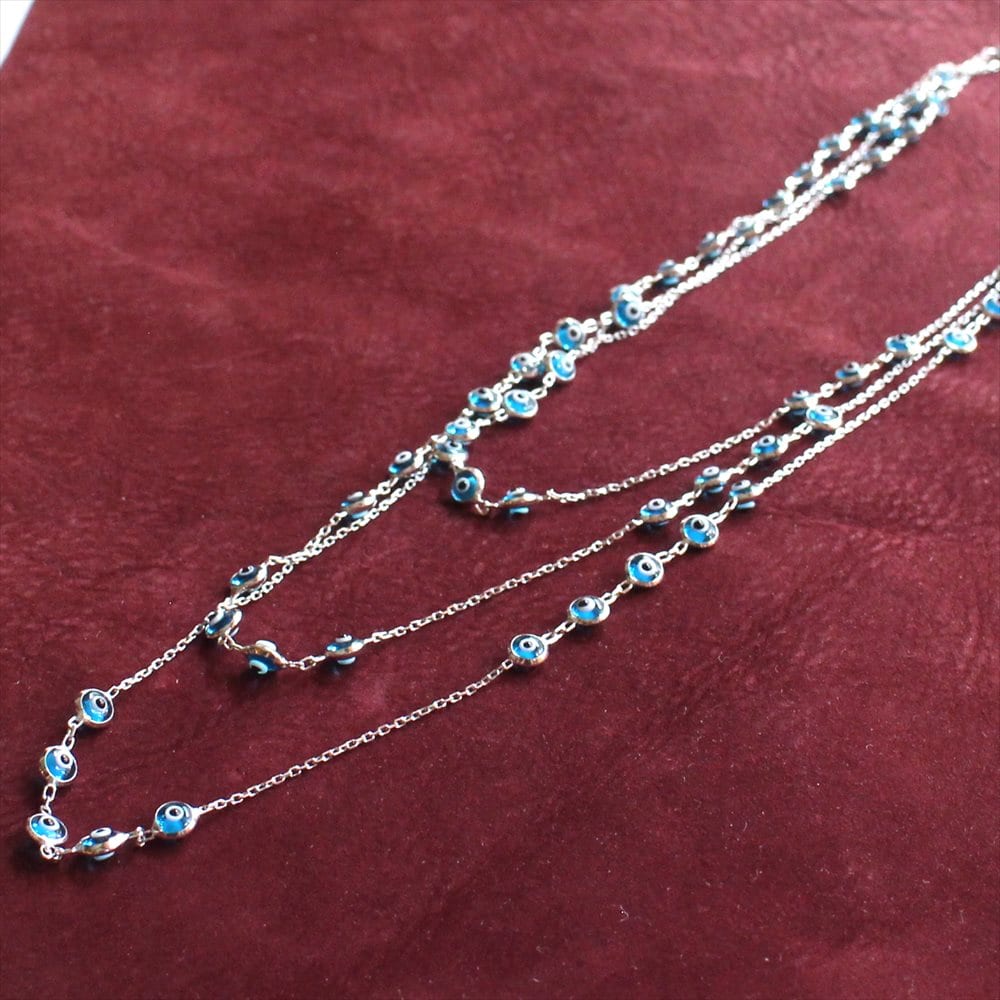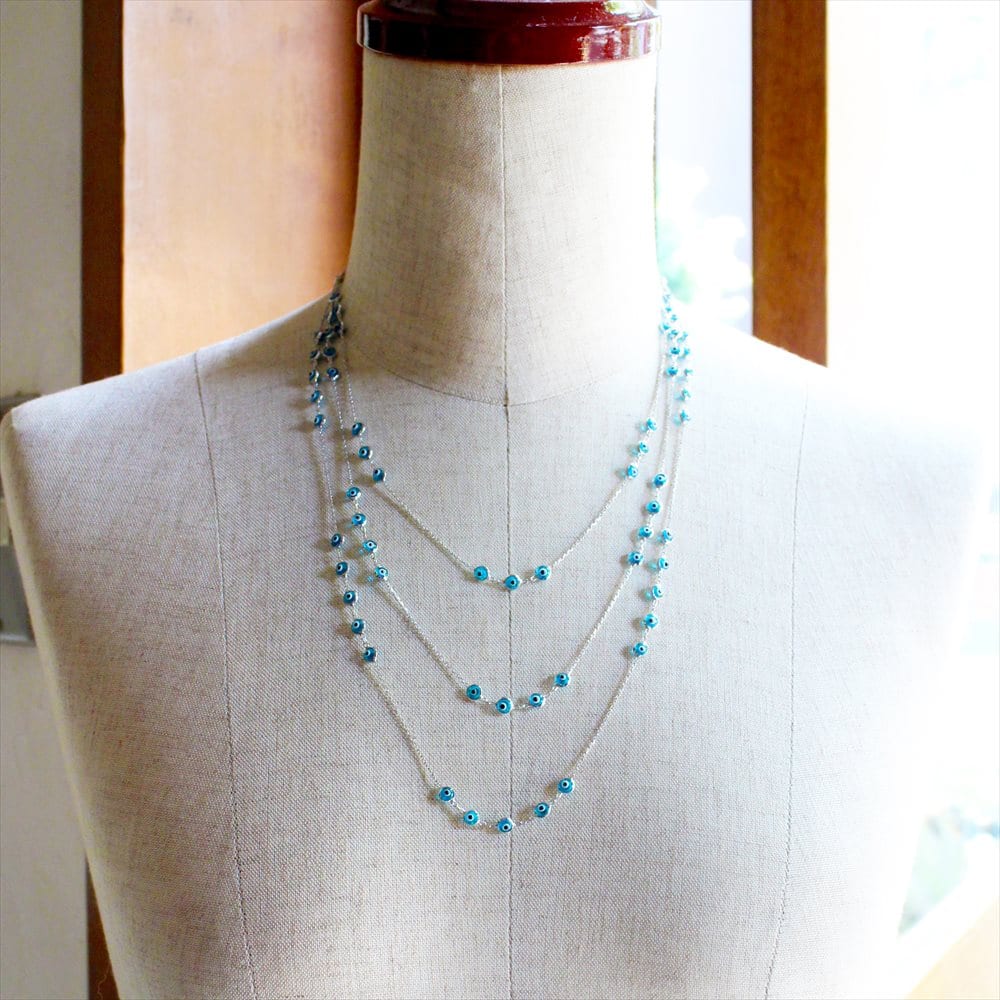 爽やかなスカイブルーの小さなナザルボンジュウのガラスビーズがたくさんついた3連ネックレス。きゃしゃなシルバーチェーンとの組合せが女性らしいデザインのネックレスです。シンプルな装いもさりげなく華やかな印象にかえてくれます。