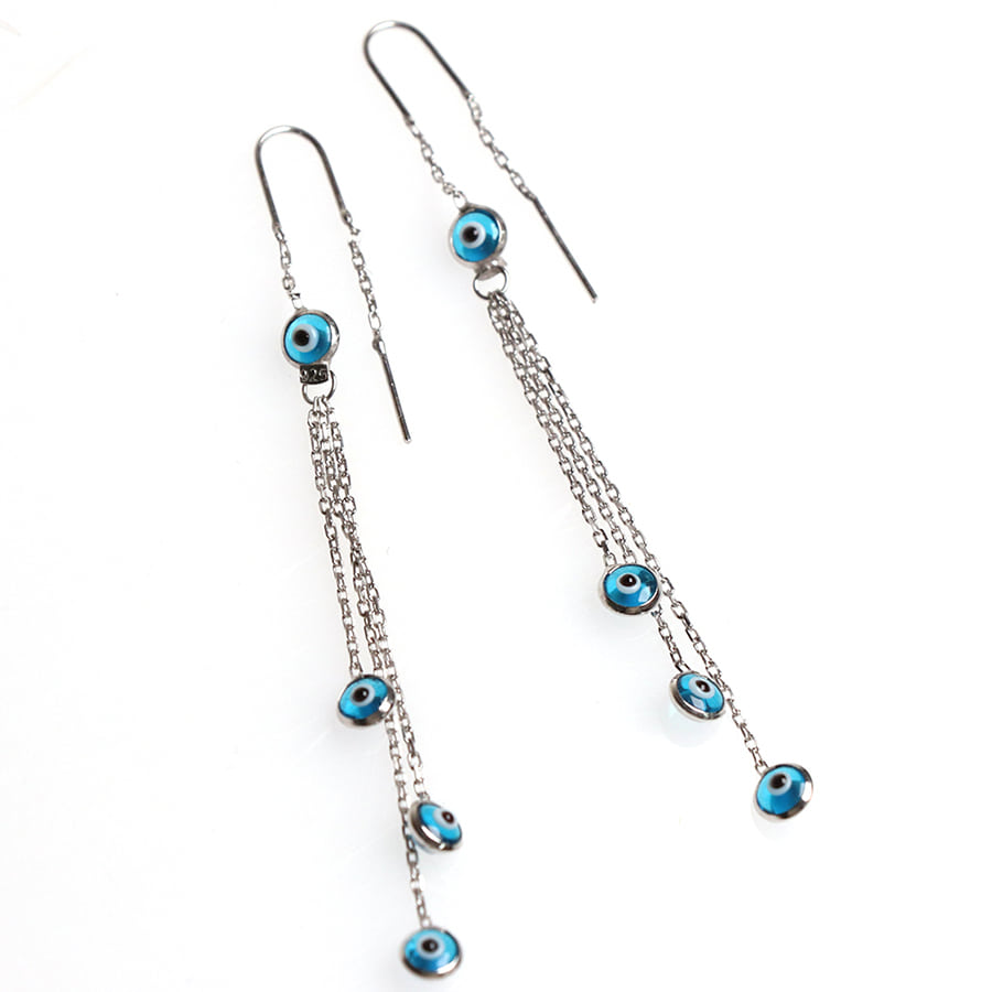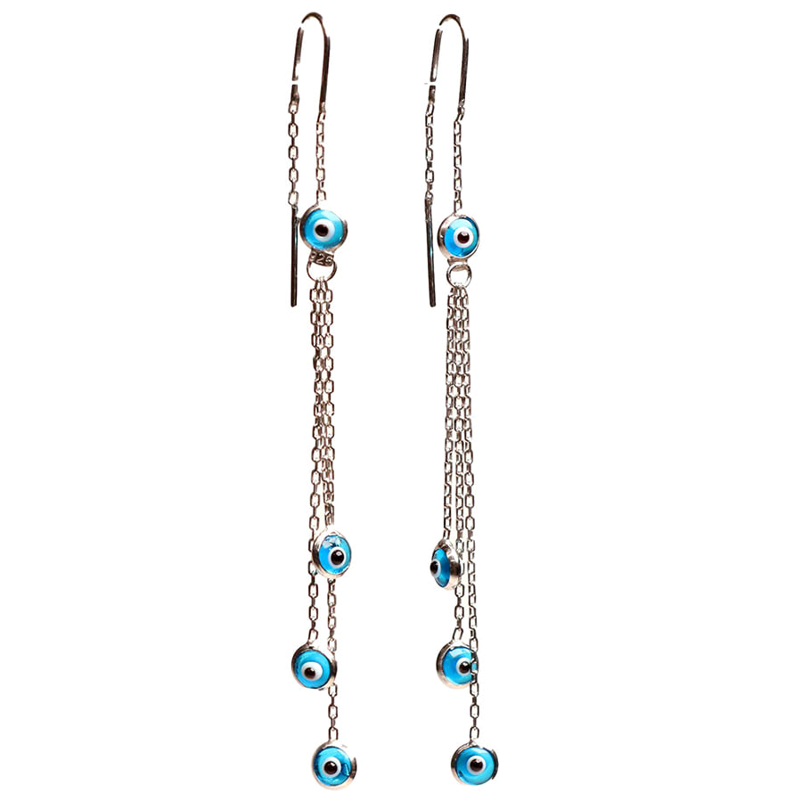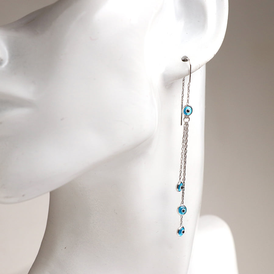 きゃしゃなシルバーチェーンの先についた小さなナザルボンジュウが耳元でゆれるデザインのピアスです。ピアスホールに先が棒状になっているチェーンを通してつけるので外れにくく、上品なi印象のロングタイプのピアスです。