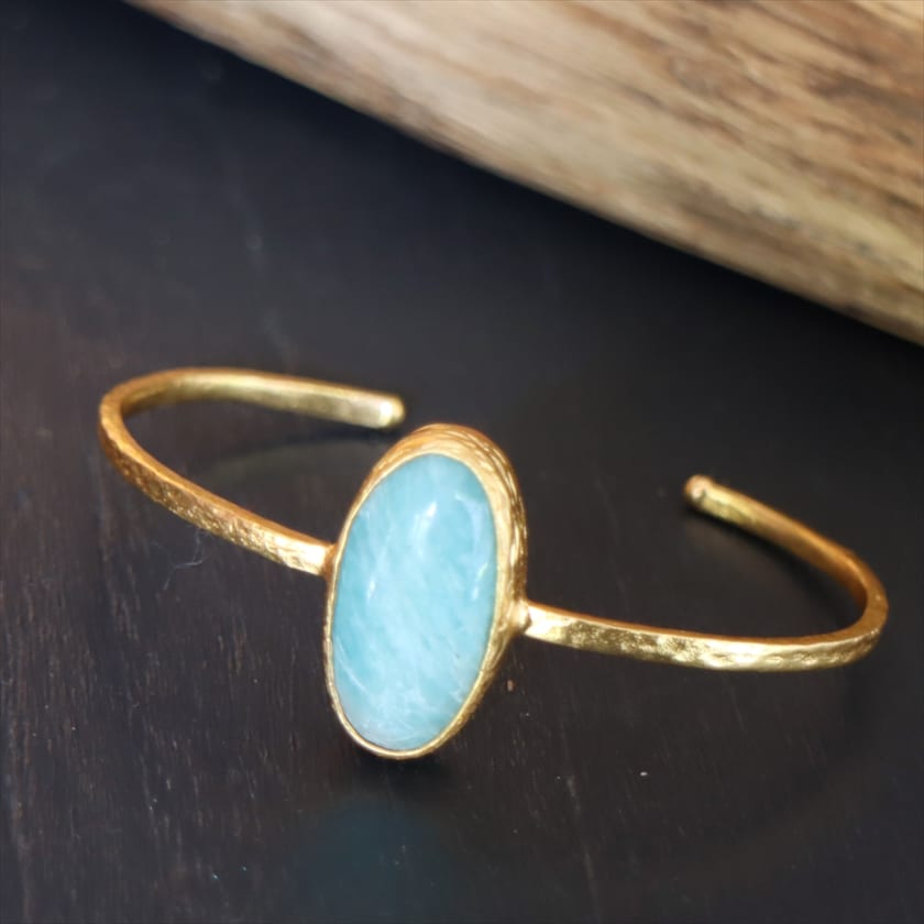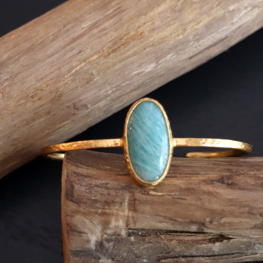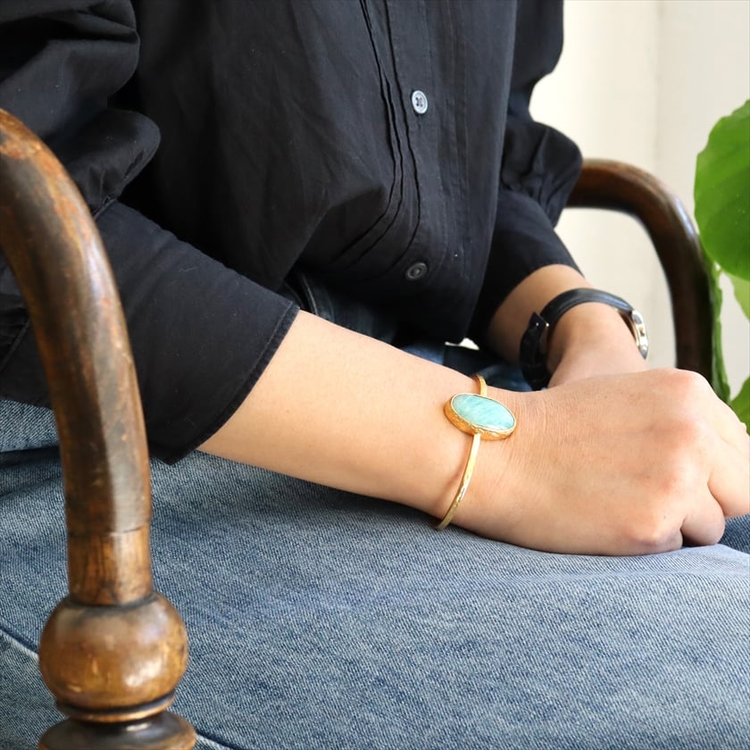 美しいブルーグリーンの発色が魅力のアマゾナイトビッグストーンバングル。打ち加工がされたシンプルなゴールドアームは、無駄なデザインを省きクールで上品な印象です。
