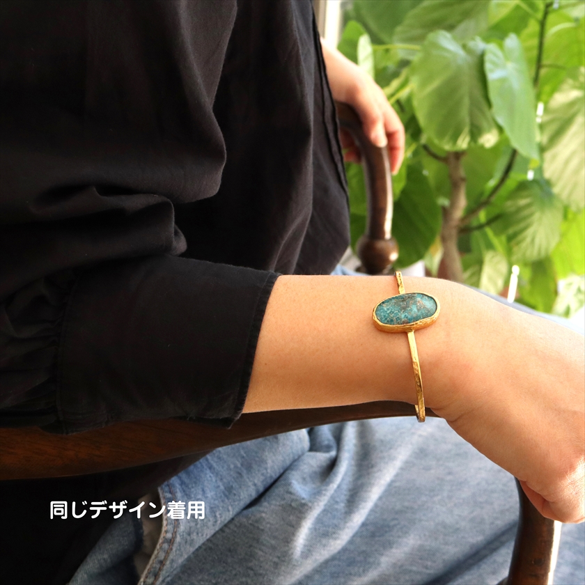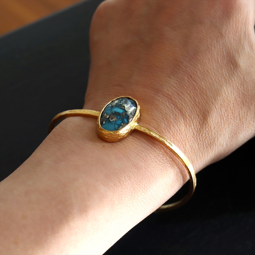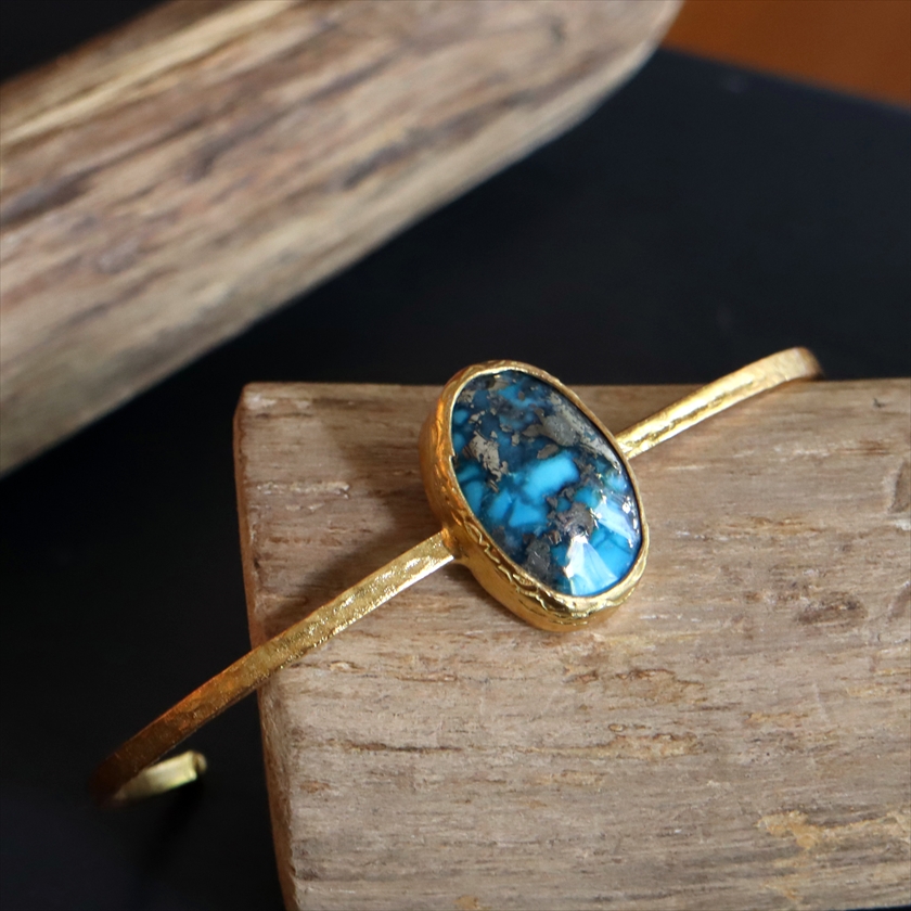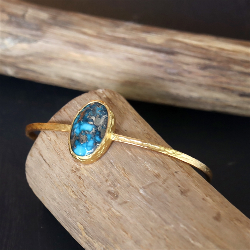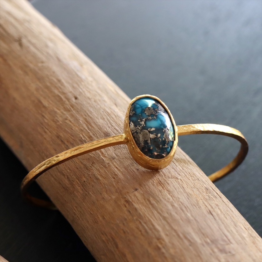 原石の雰囲気をそのままにマットなターコイズを金枠に閉じ込めた、美しいバングル。こちらは淡いスカイブルーにブラウンベージュの模様がでています。重ねづけもおすすめです。