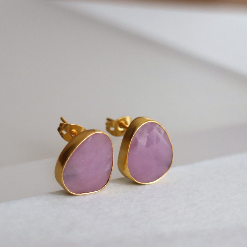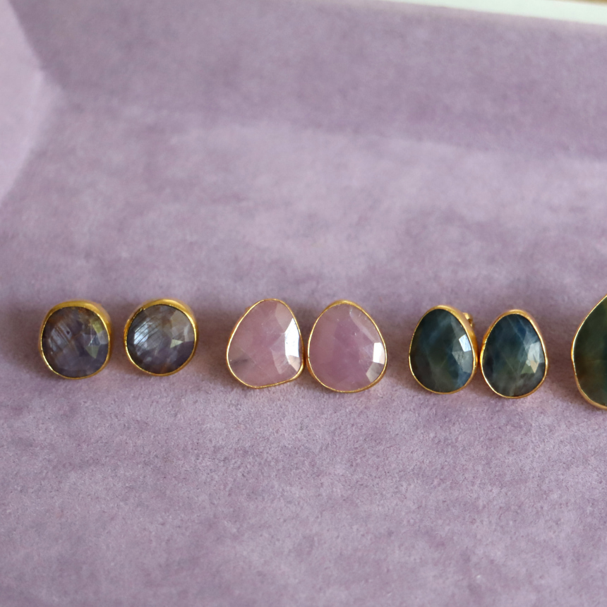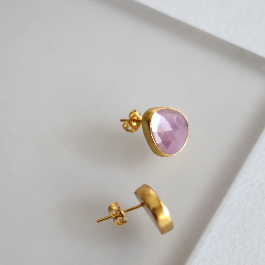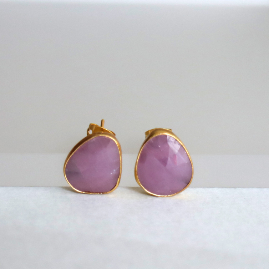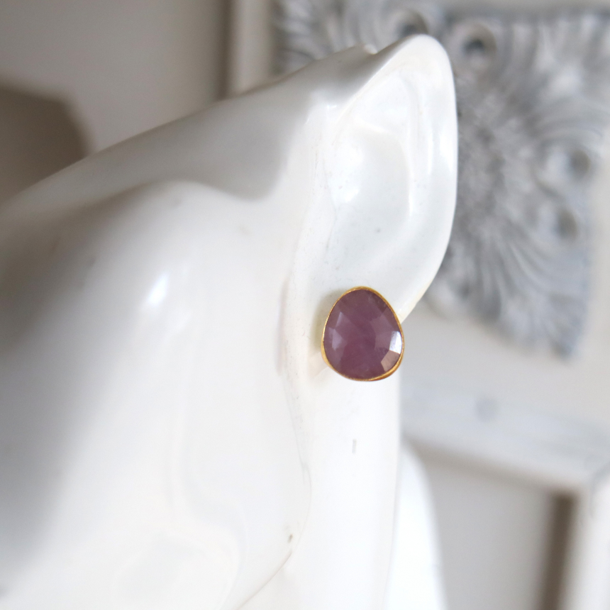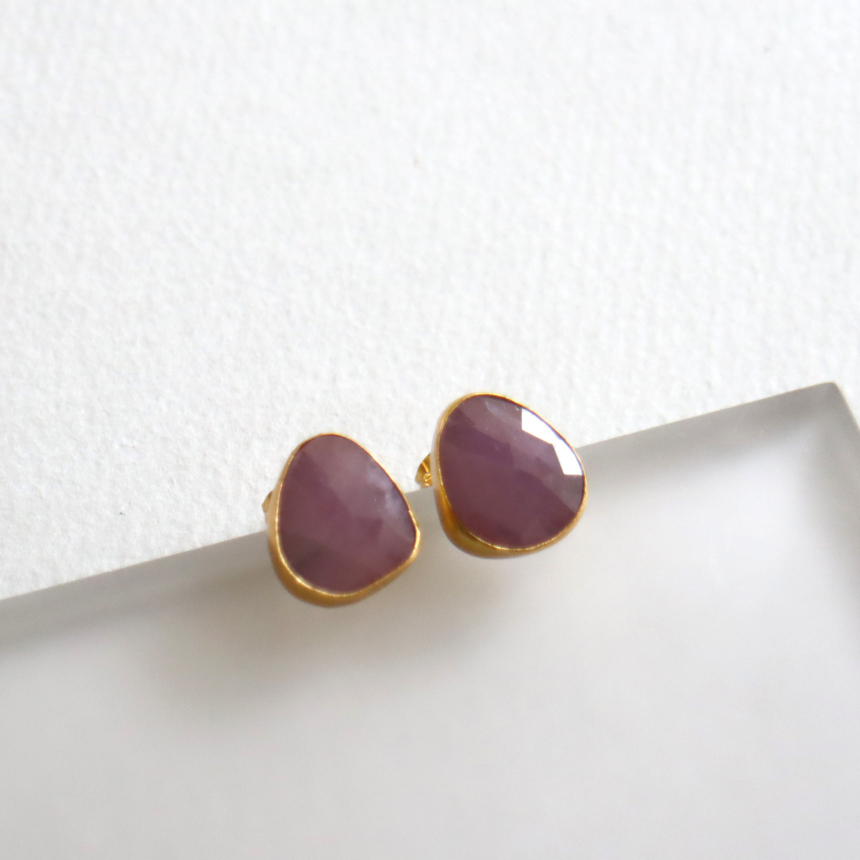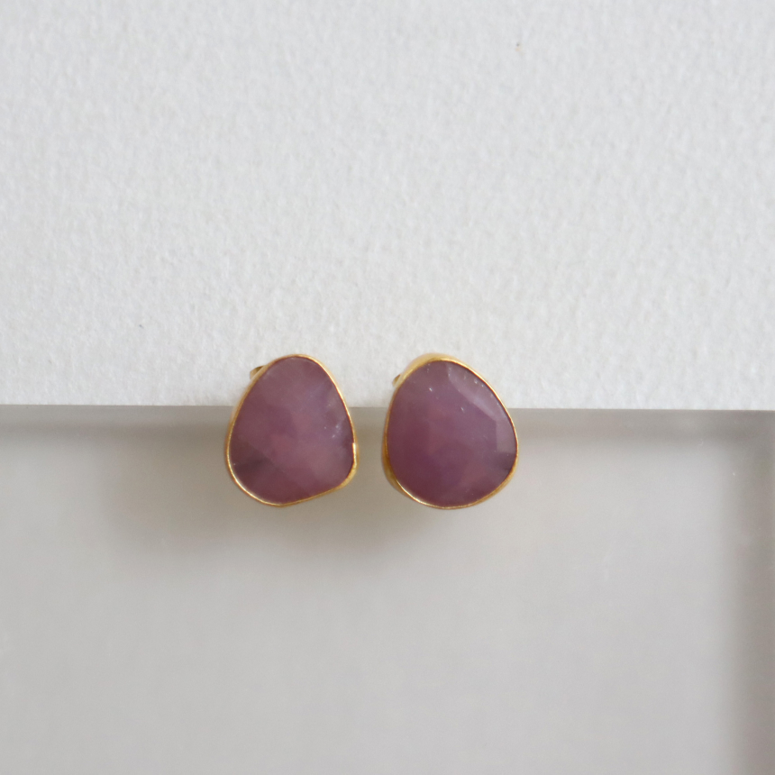 左右で個体差のある可愛らしいラフカットピアスです。ピンクサファイアとしていますが、紫がかって淡く、くすんだカラーです。