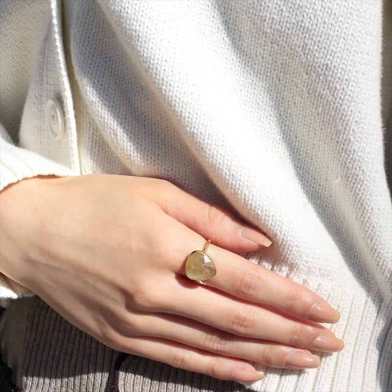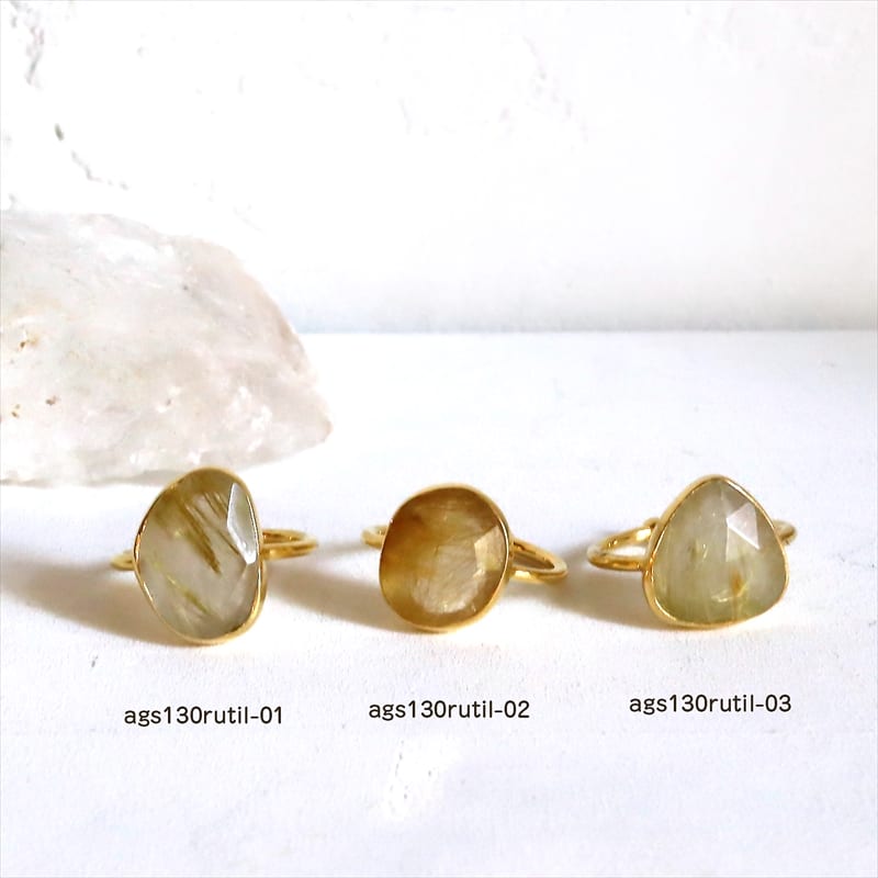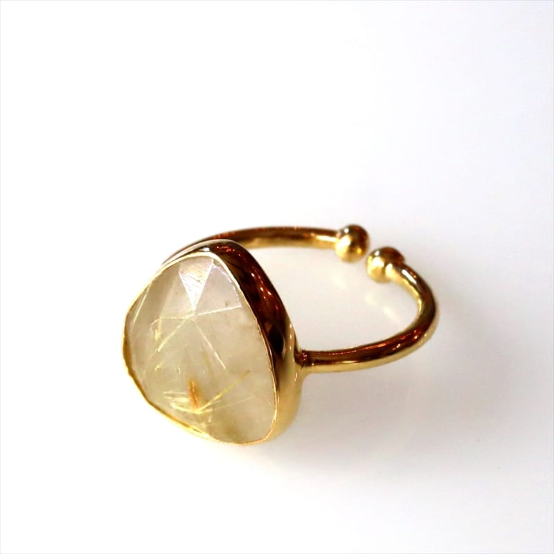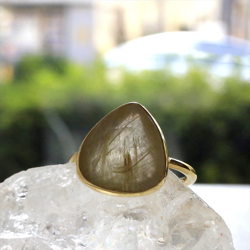 透明感あるクォーツ(水晶)の中に、ブラウンや黄金色の柱状のルチル(金線)がたくさん散りばめられた美しいルチルクォーツのリングです。
