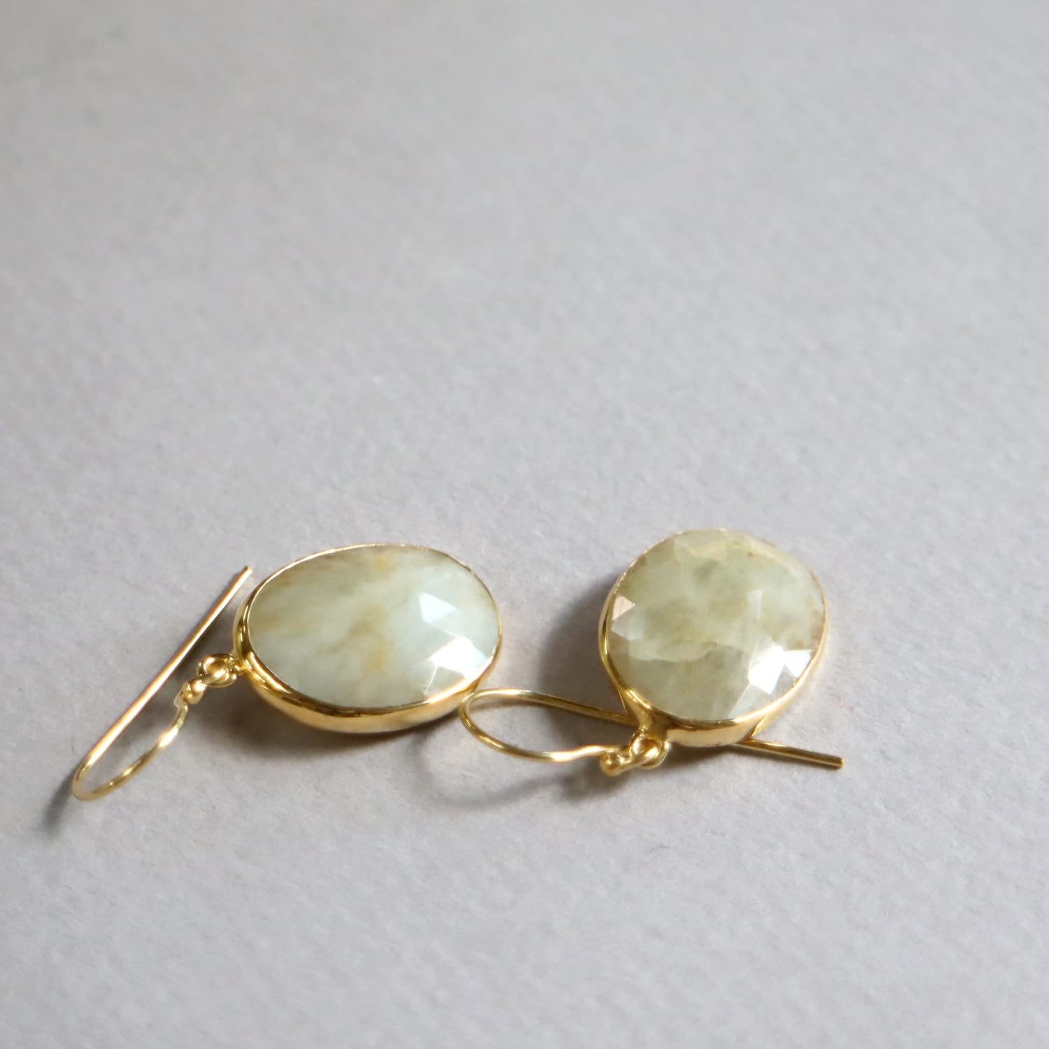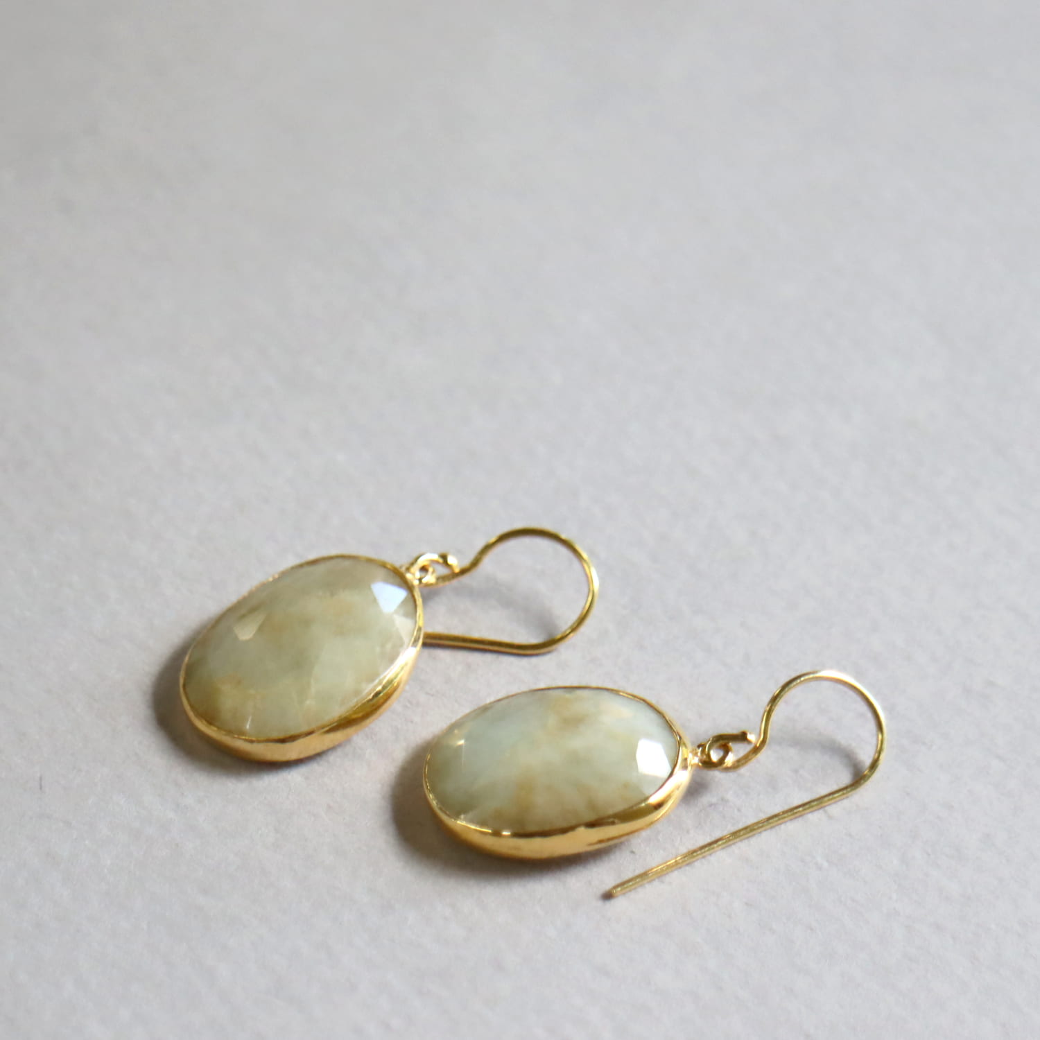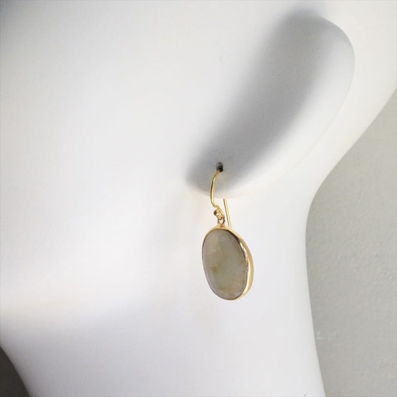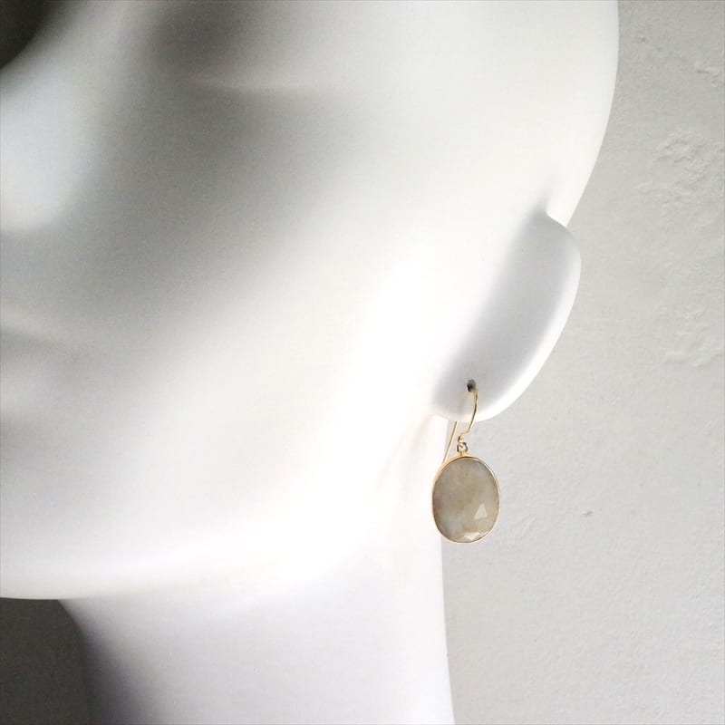 ほんのり青みを帯びた乳白色のサファイア。ベージュゴールドのインクルージョン(内包物)が大理石のように浮かび、上品でゴージャスな印象。丁寧にローズカットが施されているので、耳元で揺れ輝きます。