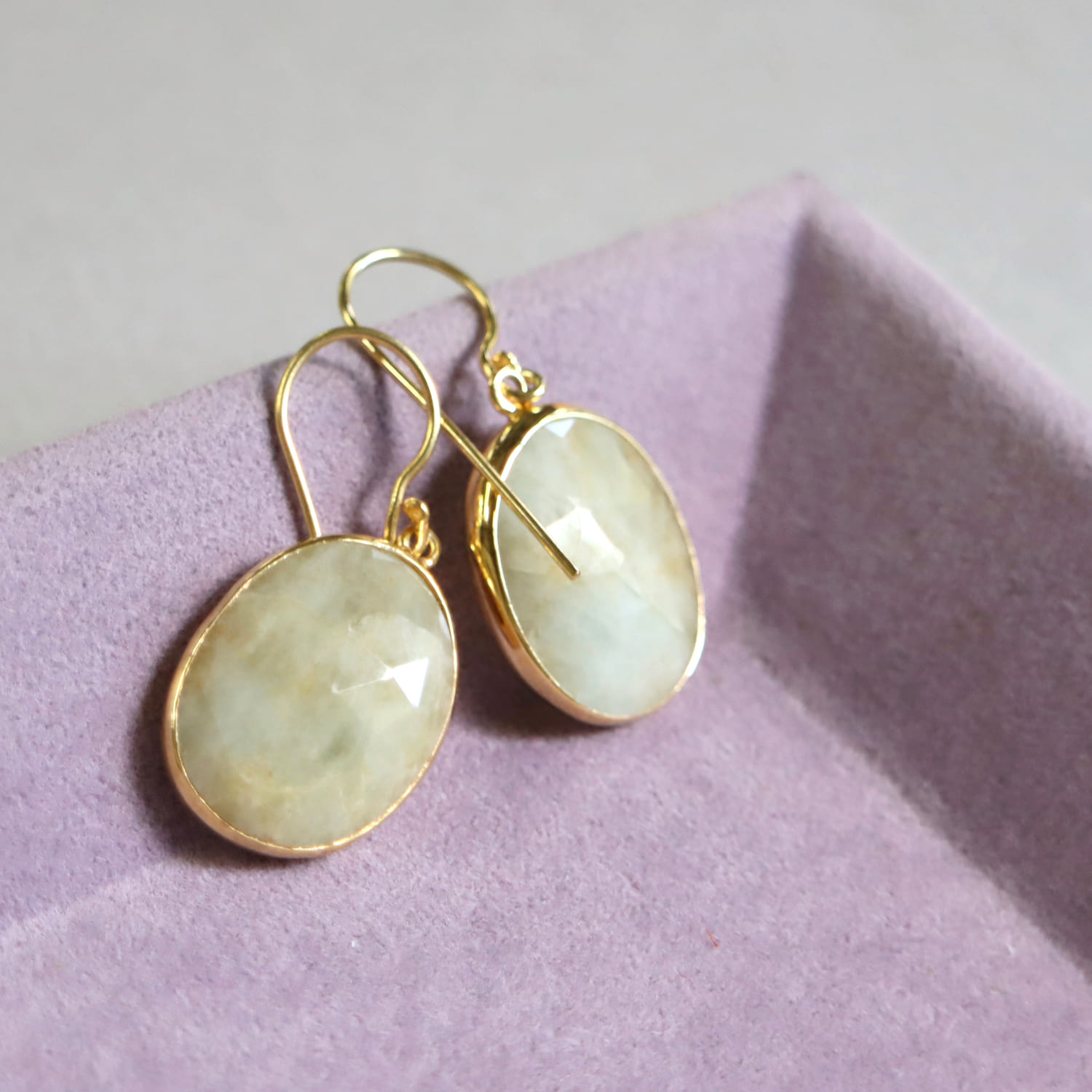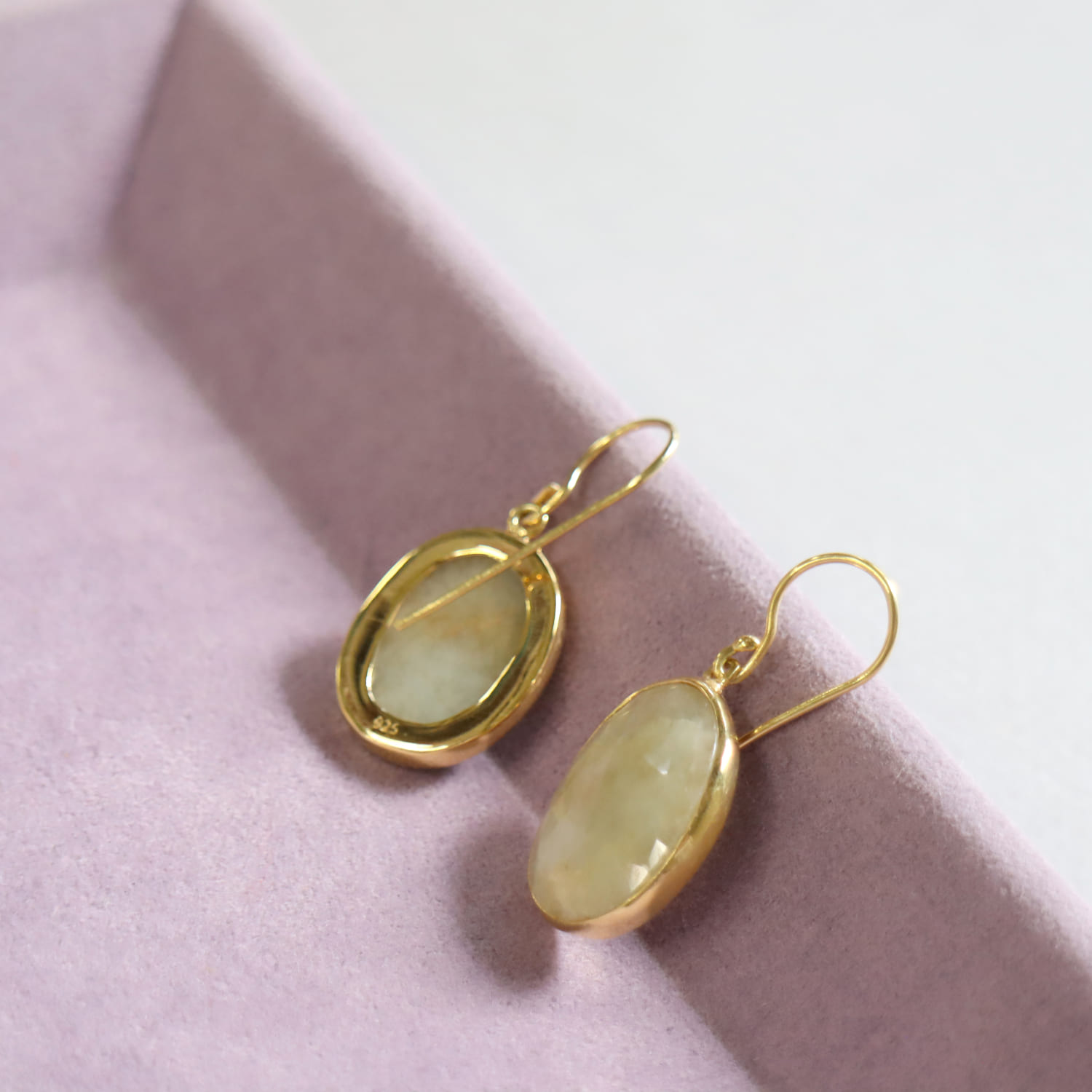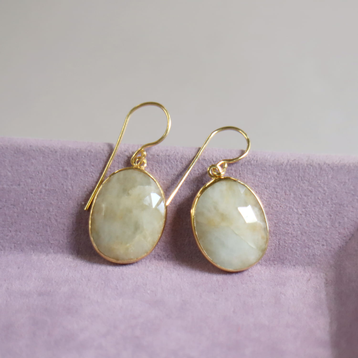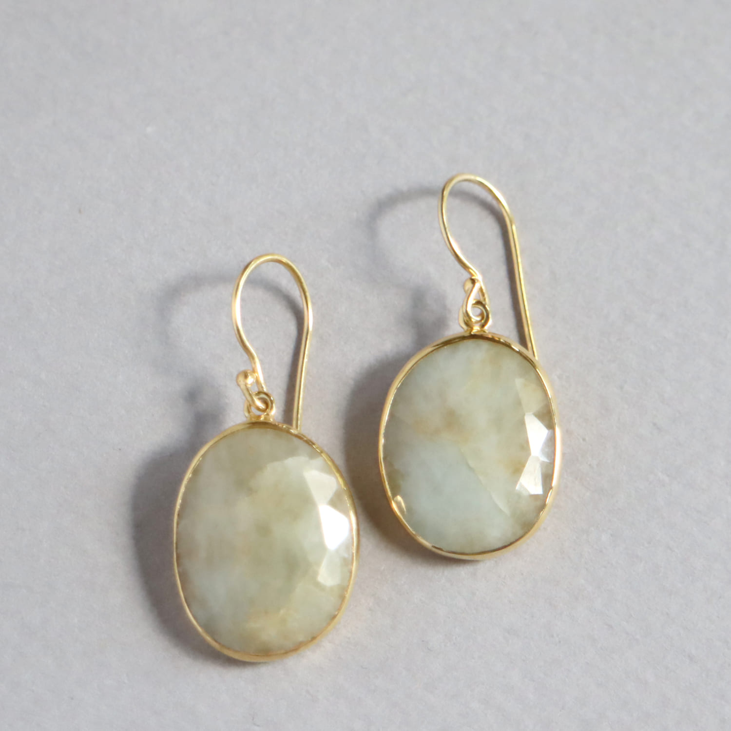 ほんのり青みを帯びた乳白色のサファイア。ベージュゴールドのインクルージョン(内包物)が大理石のように浮かび、上品でゴージャスな印象。丁寧にローズカットが施されているので、耳元で揺れ輝きます。