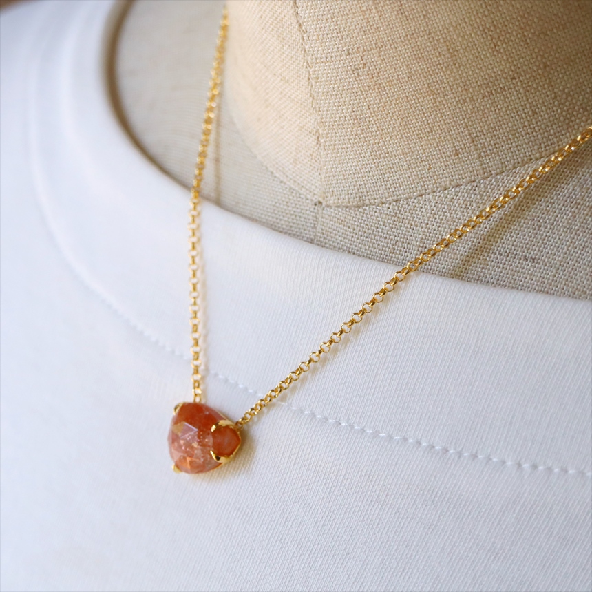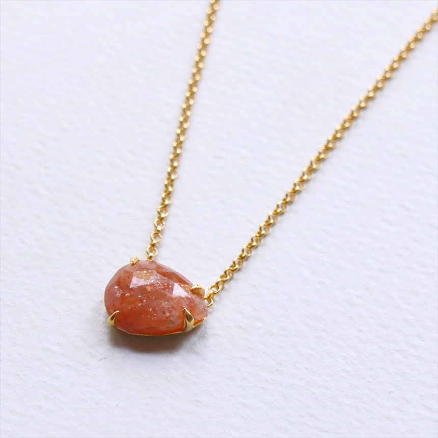太陽の石、といわれるように、輝く太陽のような赤褐色の色が美しいサンストーン。石の中に散りばめられたインクルージョン(内包物)が、光を反射し角度によってキラキラと輝きます。