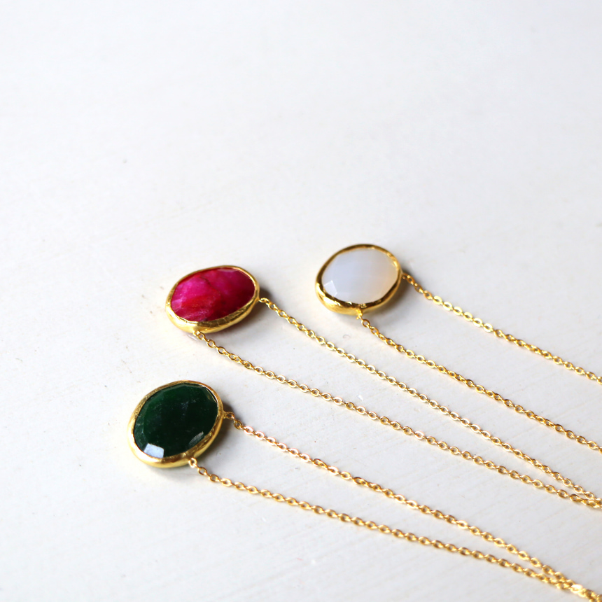 一粒の天然石のシンプルなデザインのネックレス。オーバルのストーンが横型についての新しいデザインです。安定感がよく、肌になじむように着けていただける、ながくつかえるアイテムです。