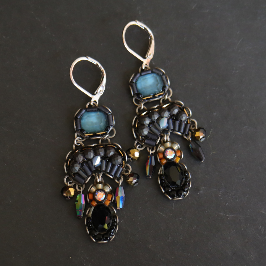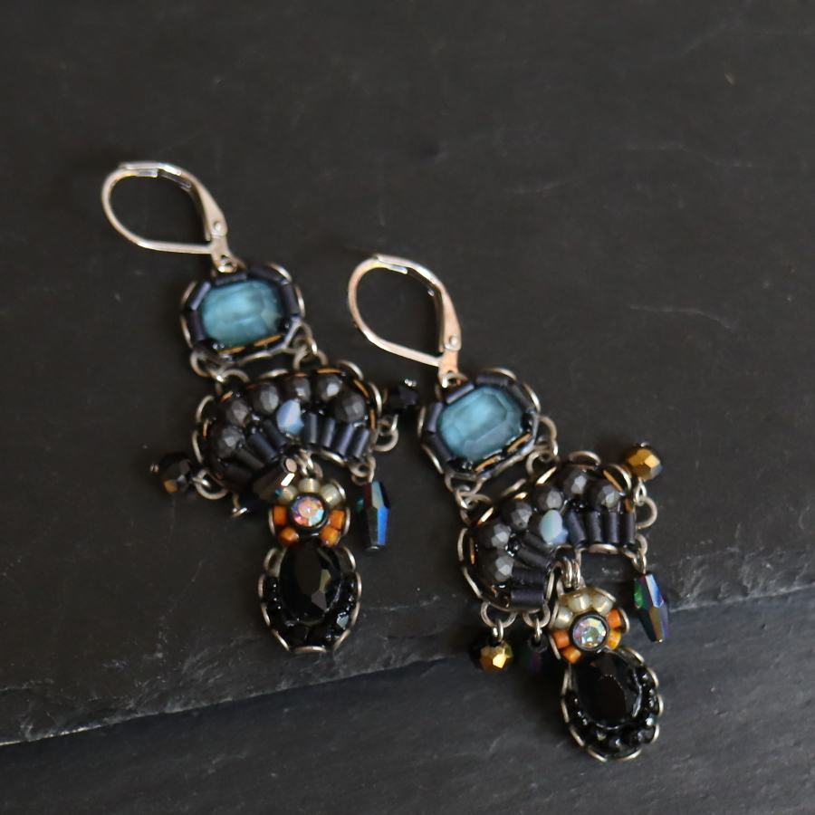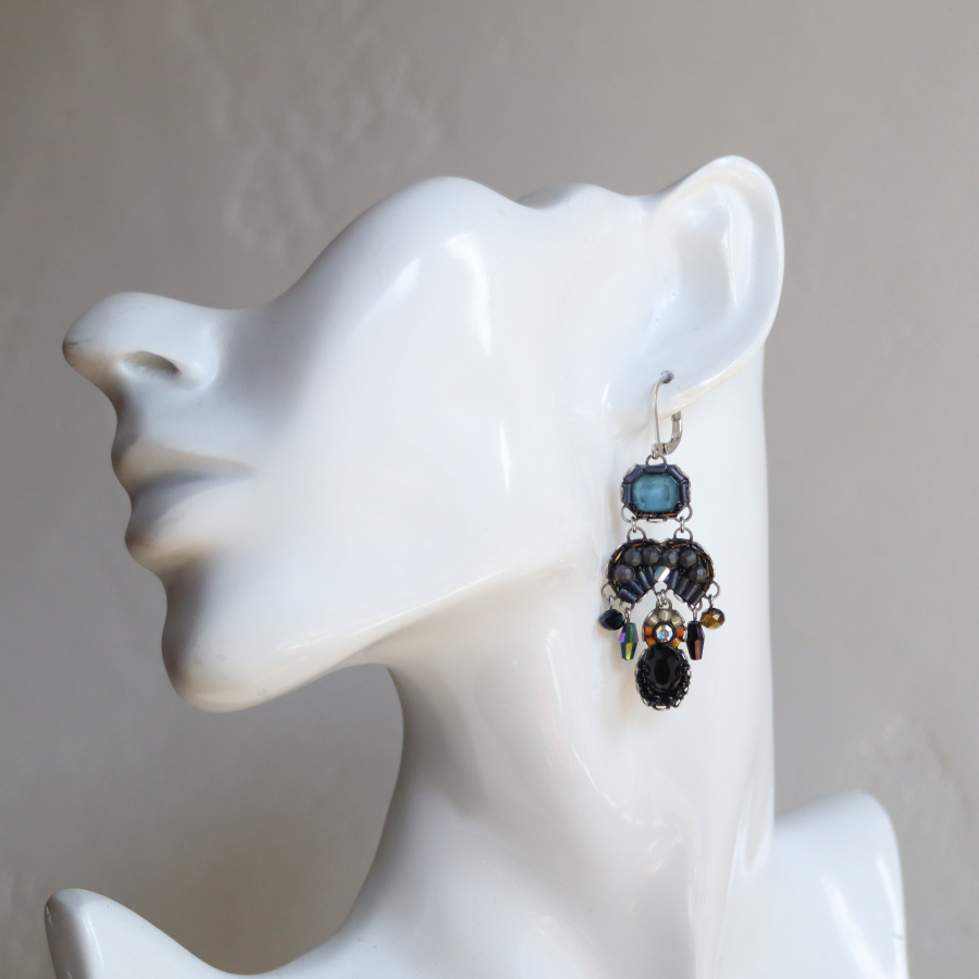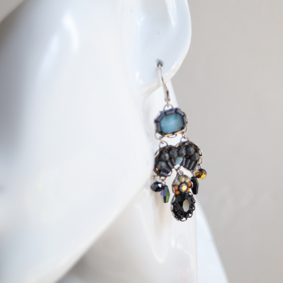 マットなスモーキーなブラックが幻想的な夜の森をイメージさせる、Black Forestという名のシリーズ。メタリックなビーズが耳元で揺れ、きらめくピアスです。