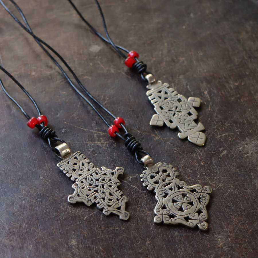 キリスト教国であるアフリカの角・エチオピアで、人々がいつも首にかけている手作りのクロスです。ひとつひとつ形が違い、武骨な感じが漂うネックレスは男女問わずお使いいただけます。