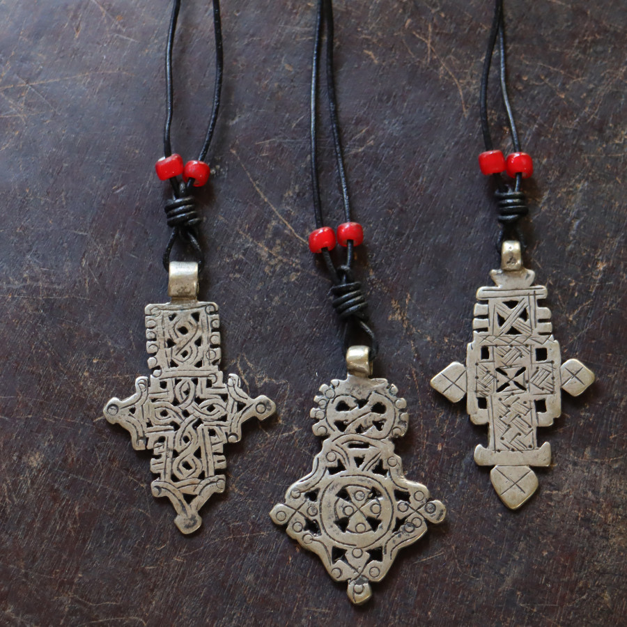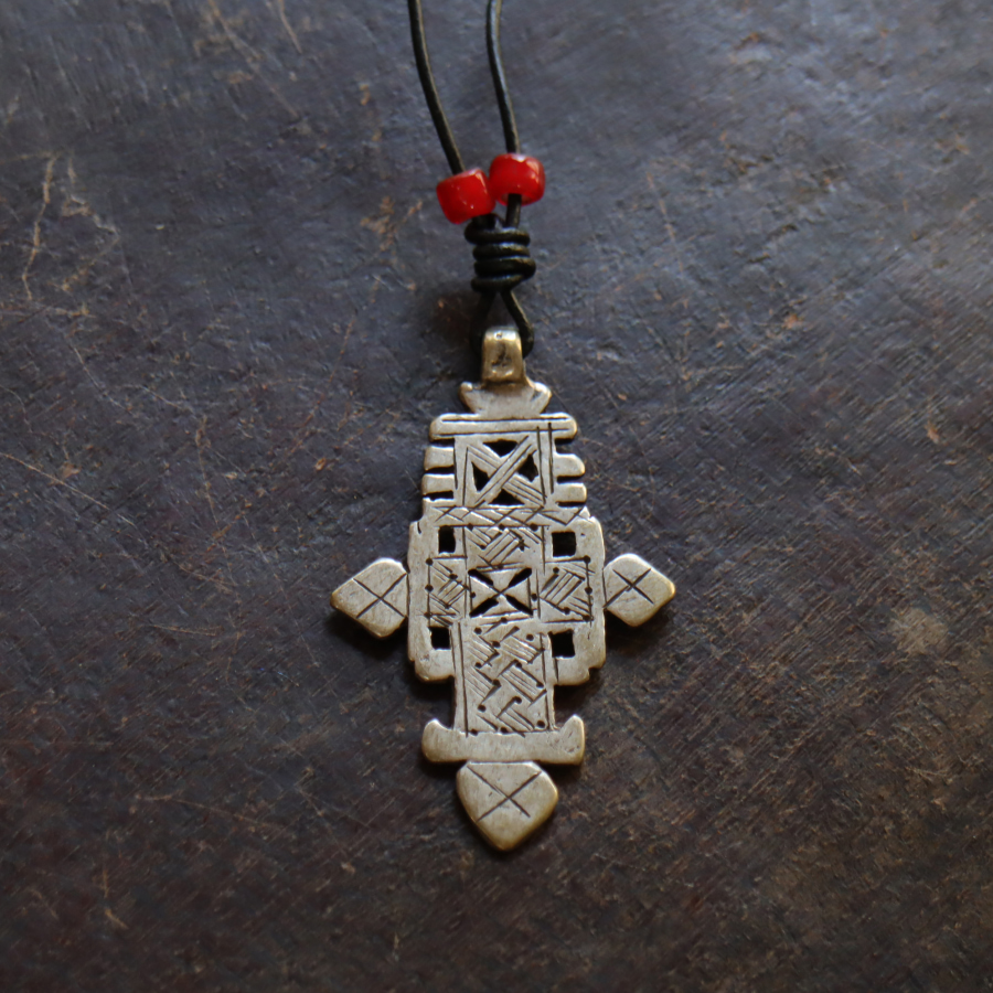 キリスト教国であるアフリカの角・エチオピアで、人々がいつも首にかけている手作りのクロスです。ひとつひとつ形が違い、武骨な感じが漂うネックレスは男女問わずお使いいただけます。