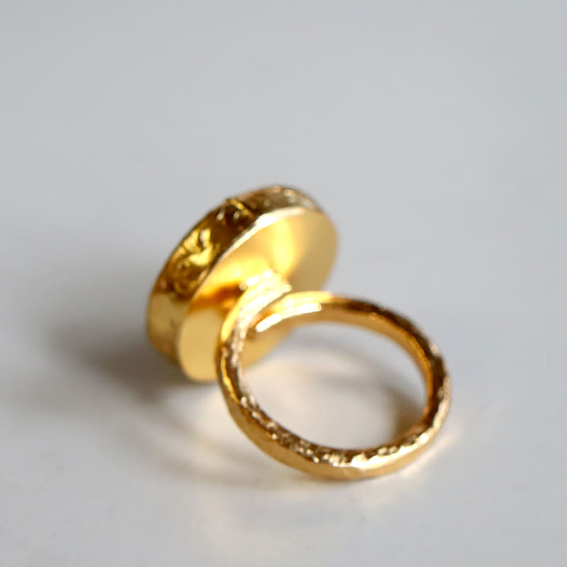 縁どられたゴールドカラーと白銀のコンビが上品な印象のコインモチーフのスクエアリング。つや消しのツチメ加工による凹凸が手作り感あり個性的。