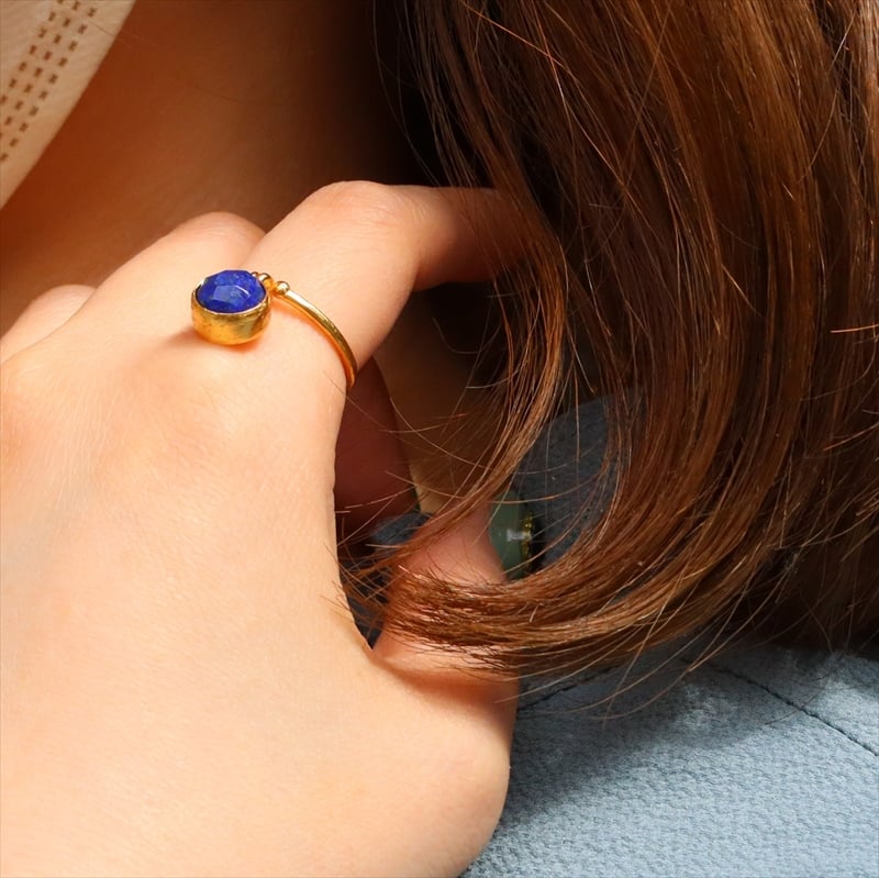 鮮やかな深みあるブルーのラピスラズリ。厚みがあり、まるでつぼみの様な立体的なカットが施されたひと粒の石が、指の上でゆれるユニークなデザインのリングです。リングの輪が閉じていないので、サイズはご自身で広げて多少調節できます。(最初の状態では約11号程度です)。※石直径0.7×0.7cm
