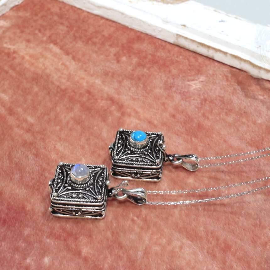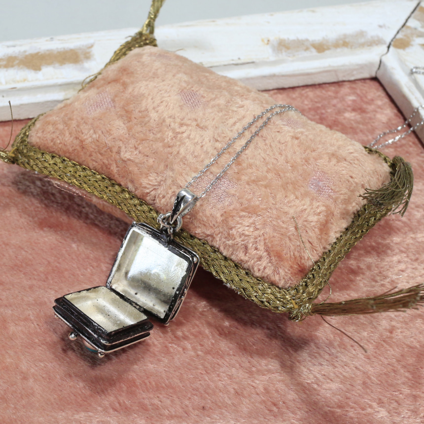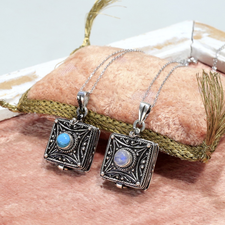 中央に天然石のついたシルバーのロケットペンダントトップです。上部が外れるフタになっています。表面はアンティーク調のレリーフで飾られています。写真や経典、薬、アロマなどなどを入れるために作られたオスマントルコ時代のペンダントがモデルになっているそうです。