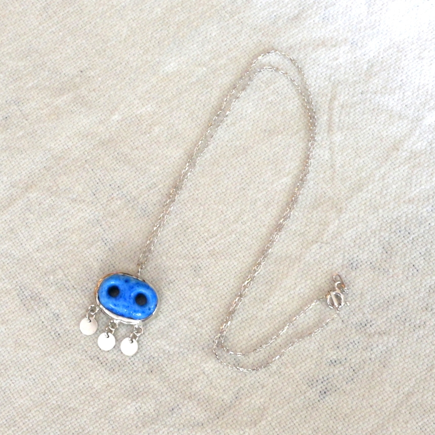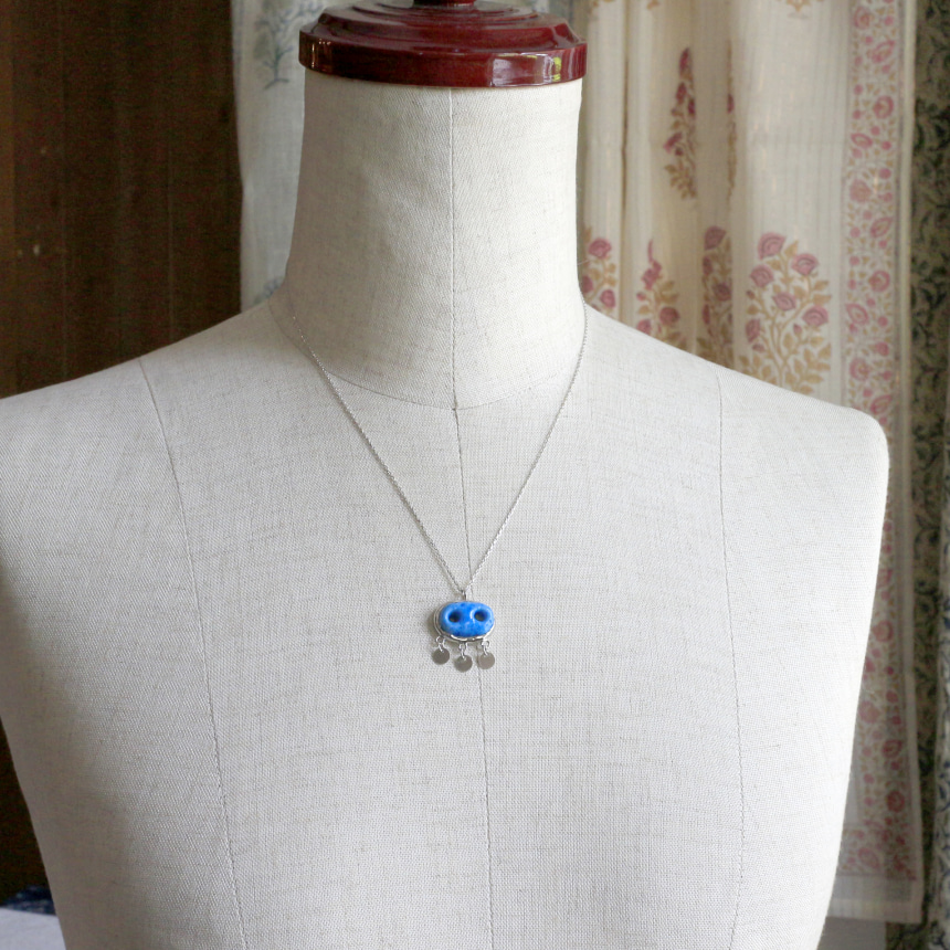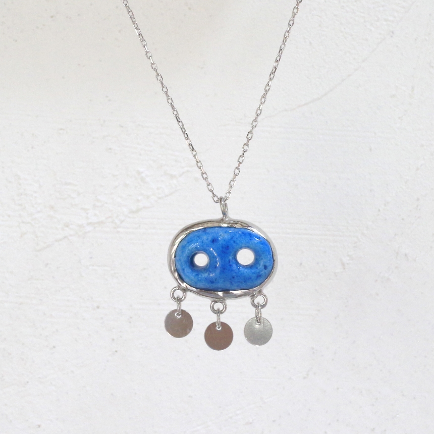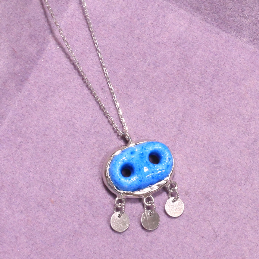 トルコの伝統的な青い目のお守り、マルディンナザールのネックレス。ブルーの部分は陶器です。二つのあいた穴(目)は、邪視から身を守り、跳ね除けてくれるという意味があります。