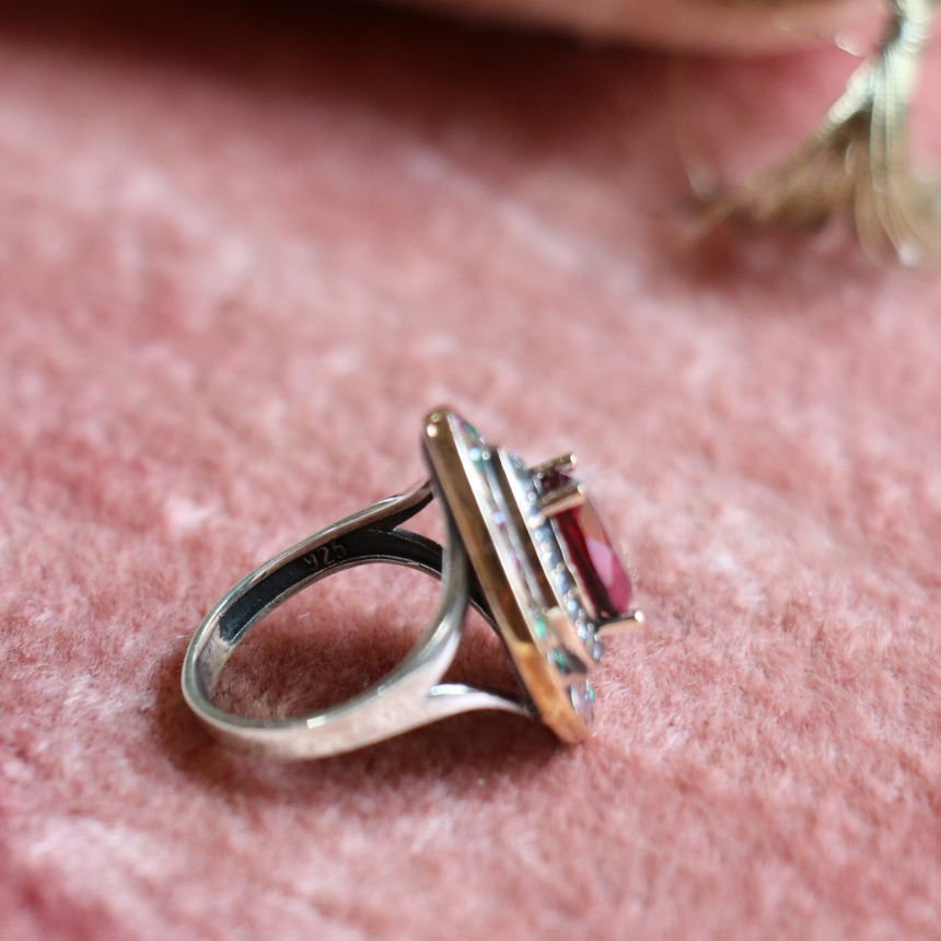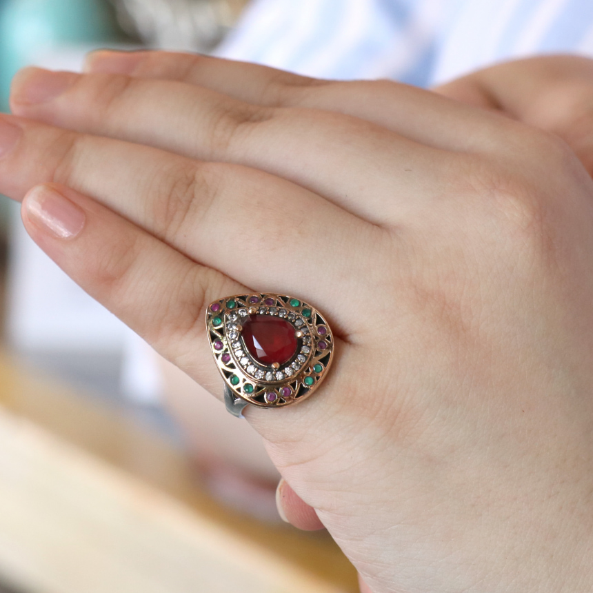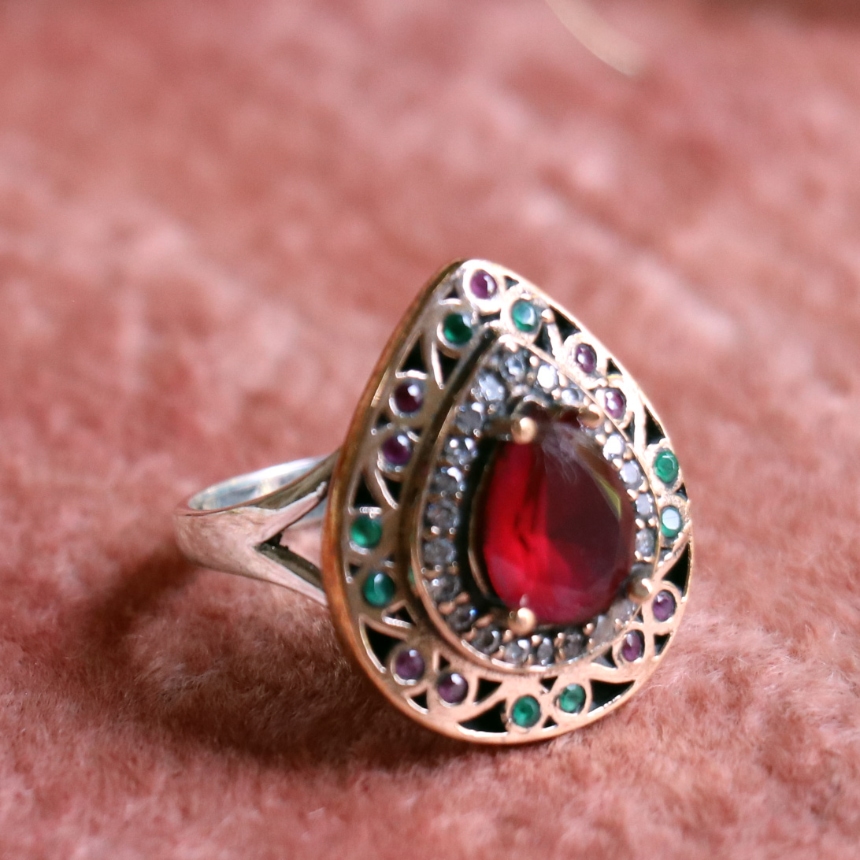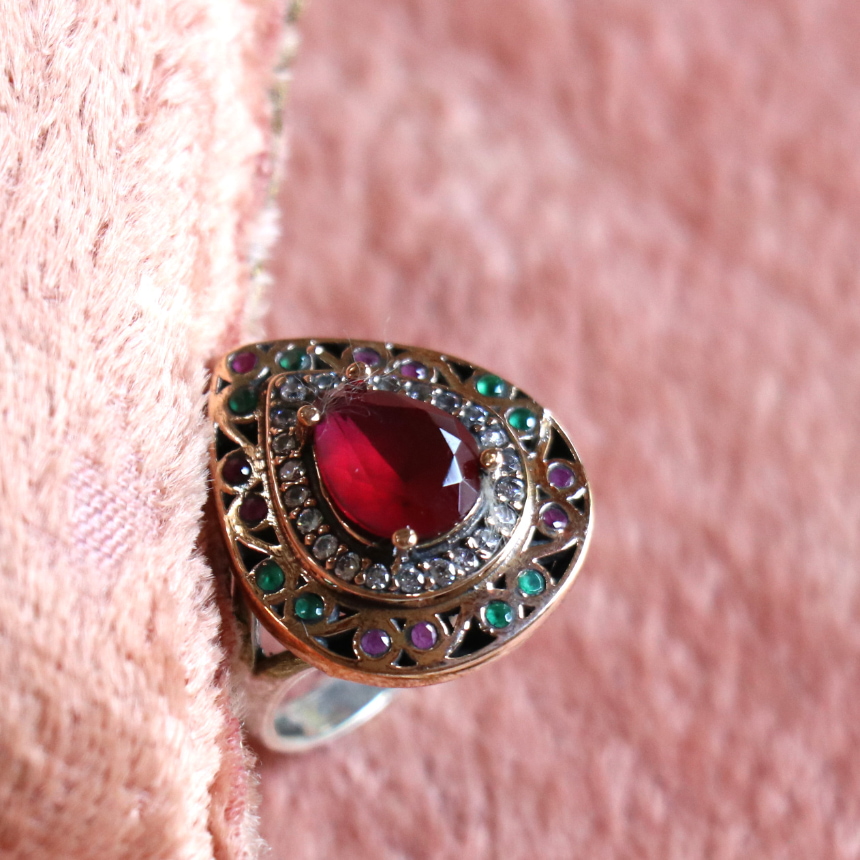 重厚感ある豪華なビックストーンシルバーリング。トプカプ宮殿をはじめとするハレムの人々を魅了した、凝ったデザインと細かい細工のオスマントルコジュエリーデザインを、現在のイスタンブールの工房が蘇らせました。煌びやかなサファイアブルーの石が贅沢にぎっしりと埋めこまれたデザインです。