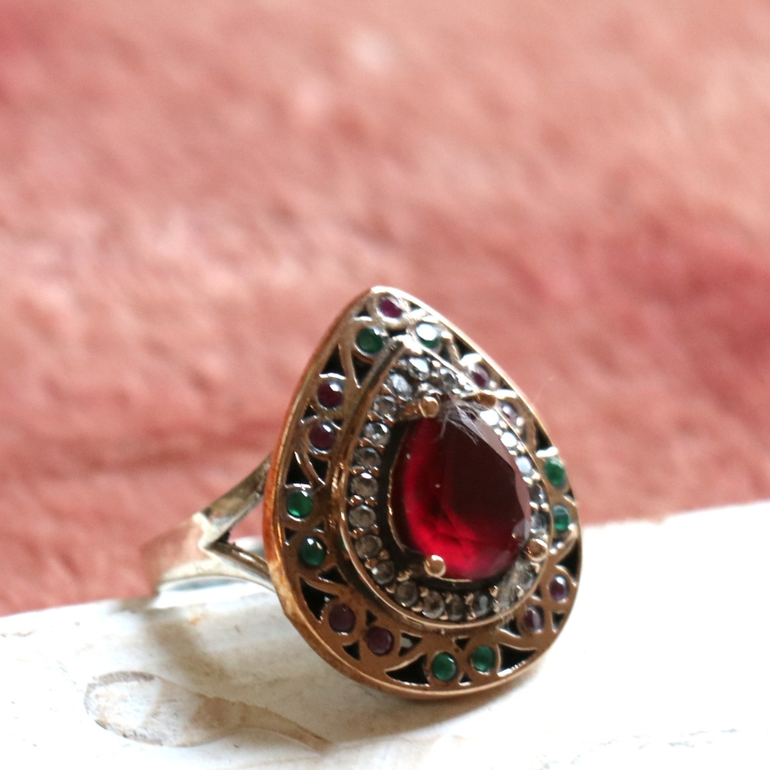 シルバーリング 15号 オスマントルコ アンティークデザイン エメラルドグリーン ドロップ