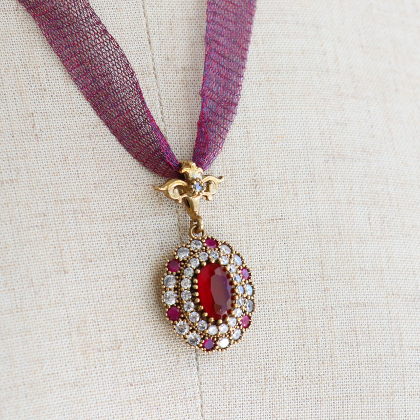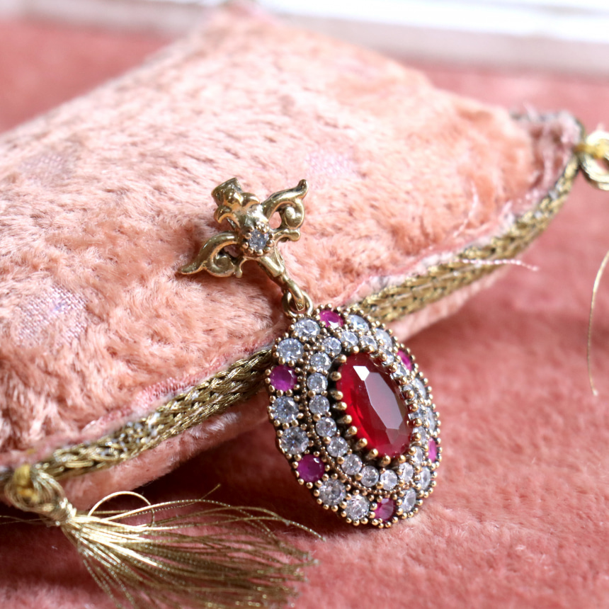 重厚感ある豪華なシルバーネックレス。トプカプ宮殿をはじめとするハレムの人々を魅了した、凝ったデザインと細かい細工のオスマントルコジュエリーデザインを、現在のイスタンブールの工房が蘇らせました。煌びやかなルビーレッドの石が贅沢にぎっしりと埋めこまれたデザインです。