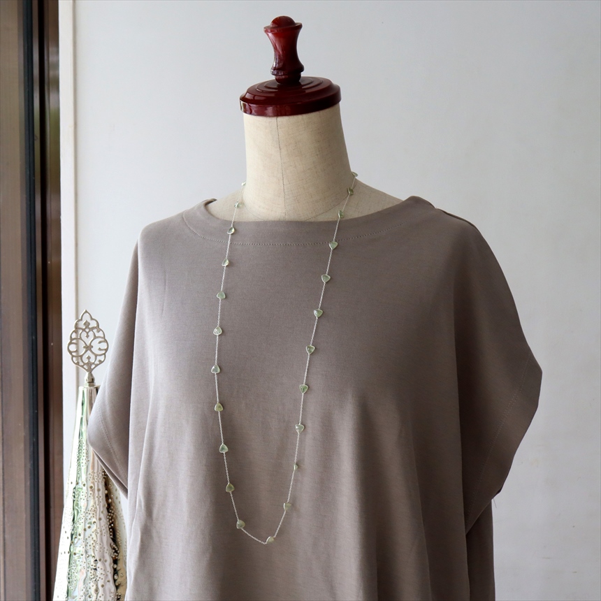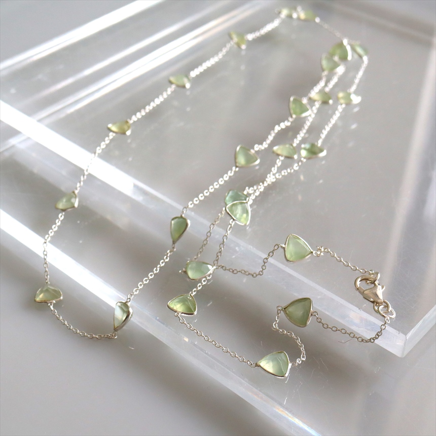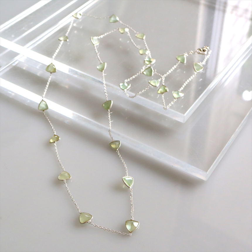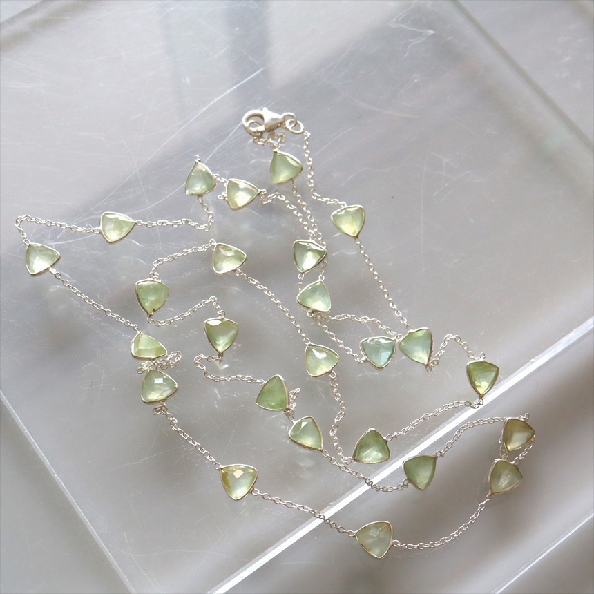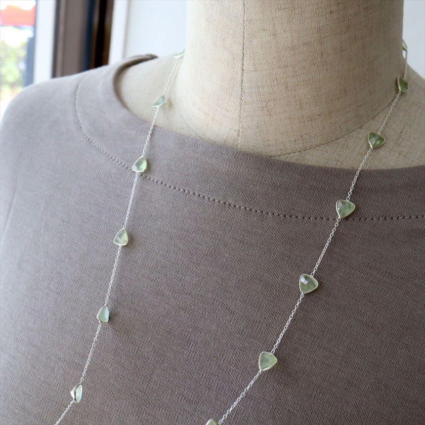 みずみずしい葡萄のようなプレナイトのネックレス。三角形のぷっくりとした立体感が光を反射し上品に輝きます。長さがたっぷりあるので、二連にしたり、バランスを変えてみたりとアレンジが楽しめます。