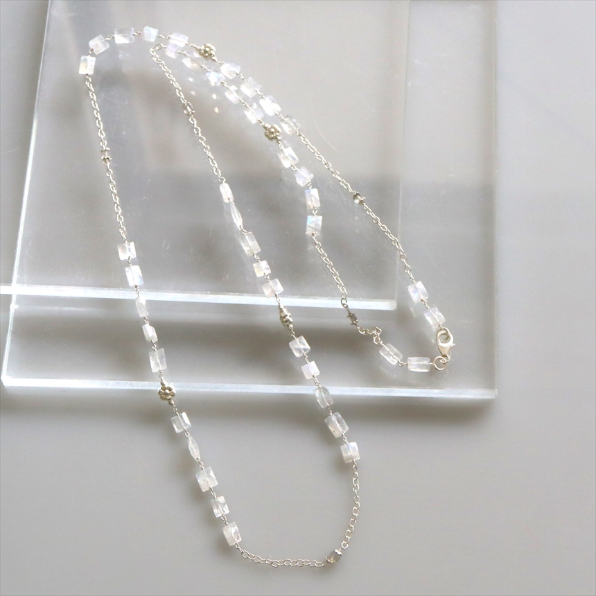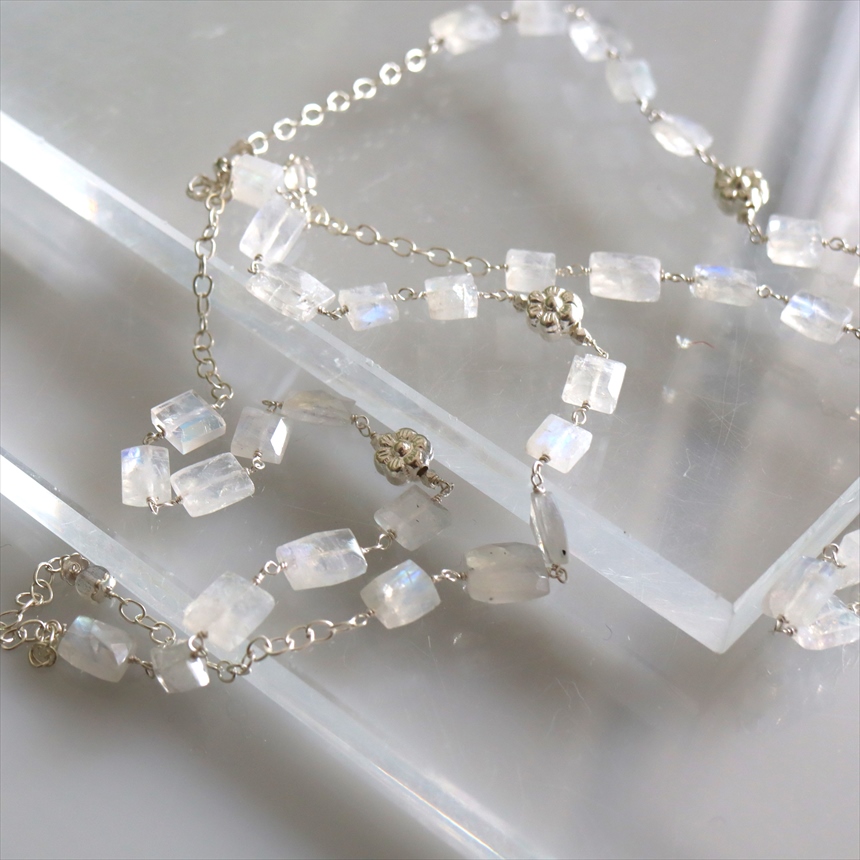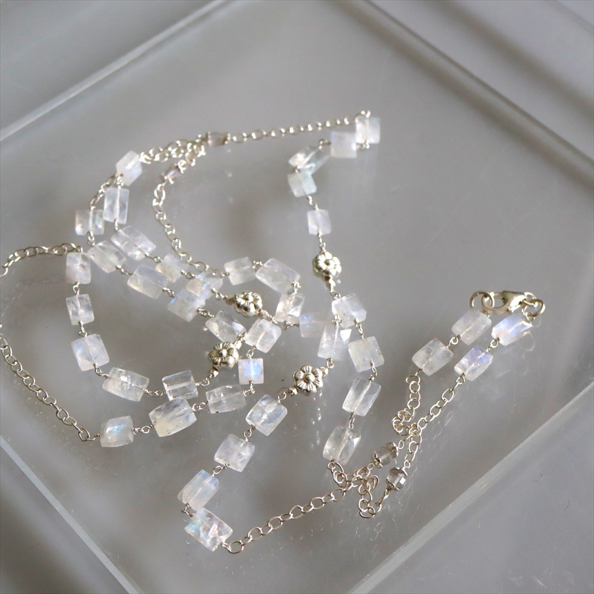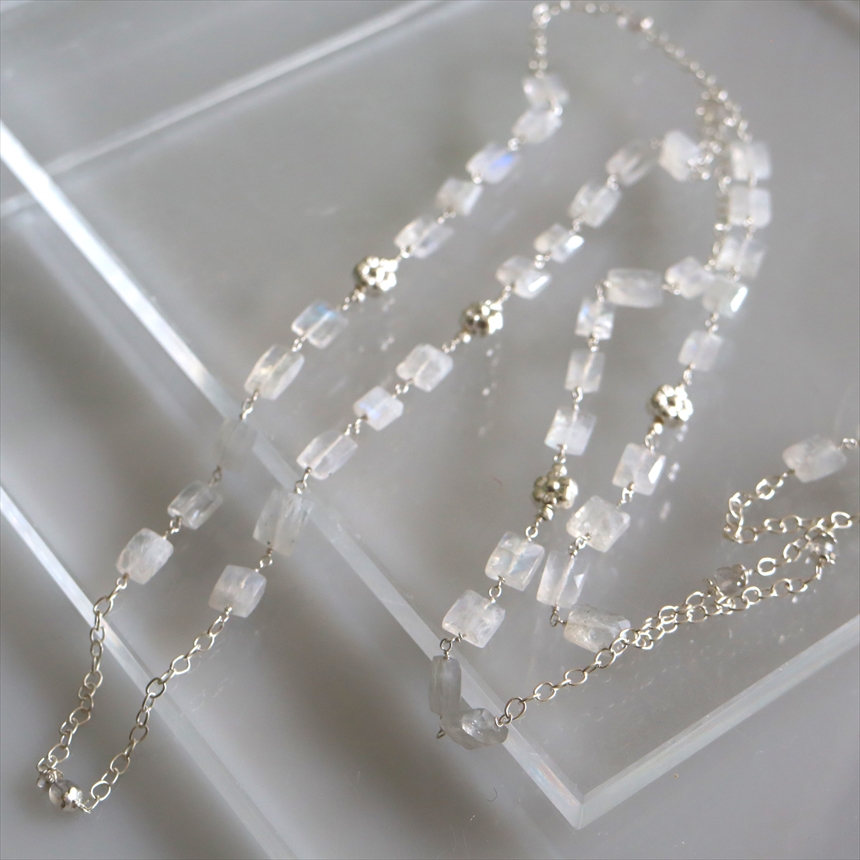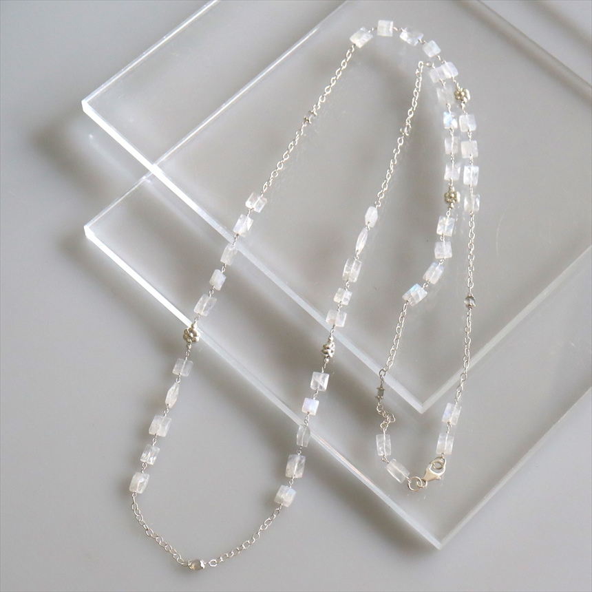 青紫のシラーが美しいレインボームーンストーンのネックレス。薄くスクエアーにカットが施された石が動くたびに揺れ、光を反射し輝きます。シルバーモチーフがアクセントになっています。※レインボームーンストーン0.5〜0.7×0.5〜0.7cm