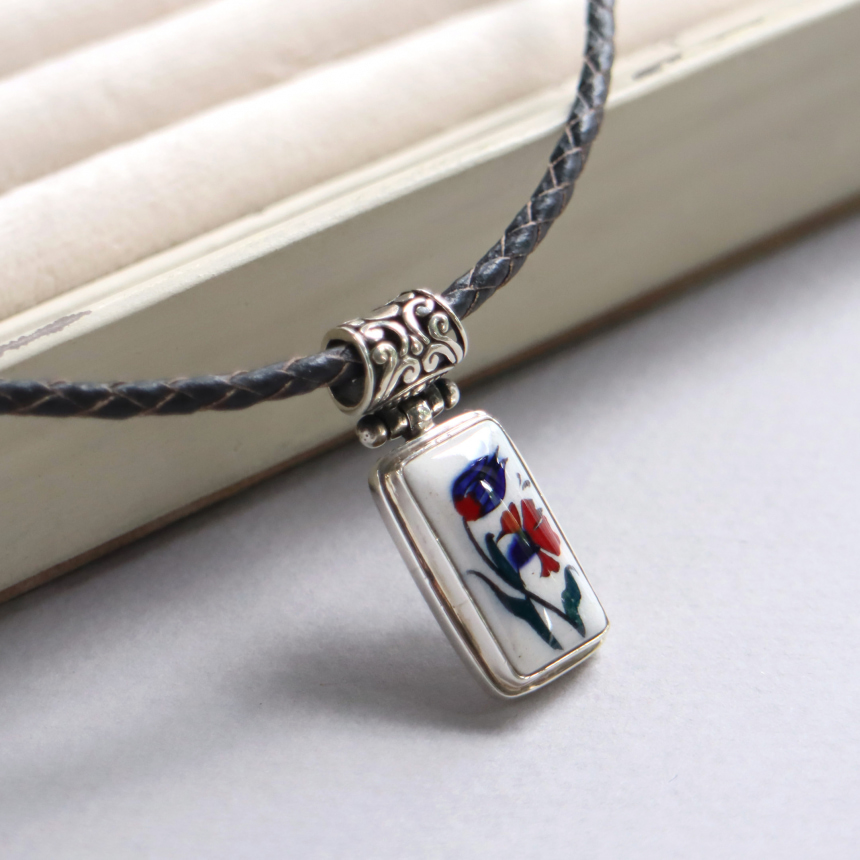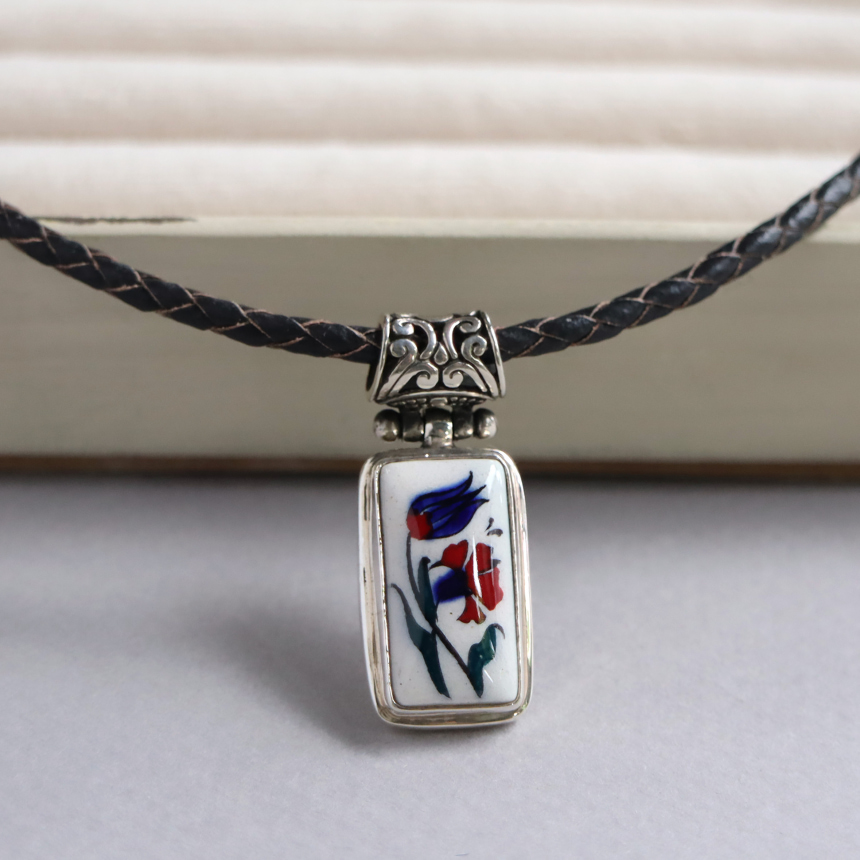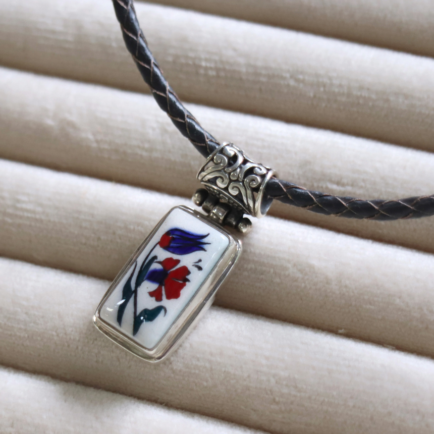 トルコキュターヤは陶芸の街!トルコの職人が、一つひとつ手描きで絵付けしたキュターヤ陶器とシルバー細工のペンダントです。シルバー細工も凝ったデザインで、本体とバチカン部分は蝶番になっていて稼働します。トルコの国花チューリップとカーネーションが描かれています。