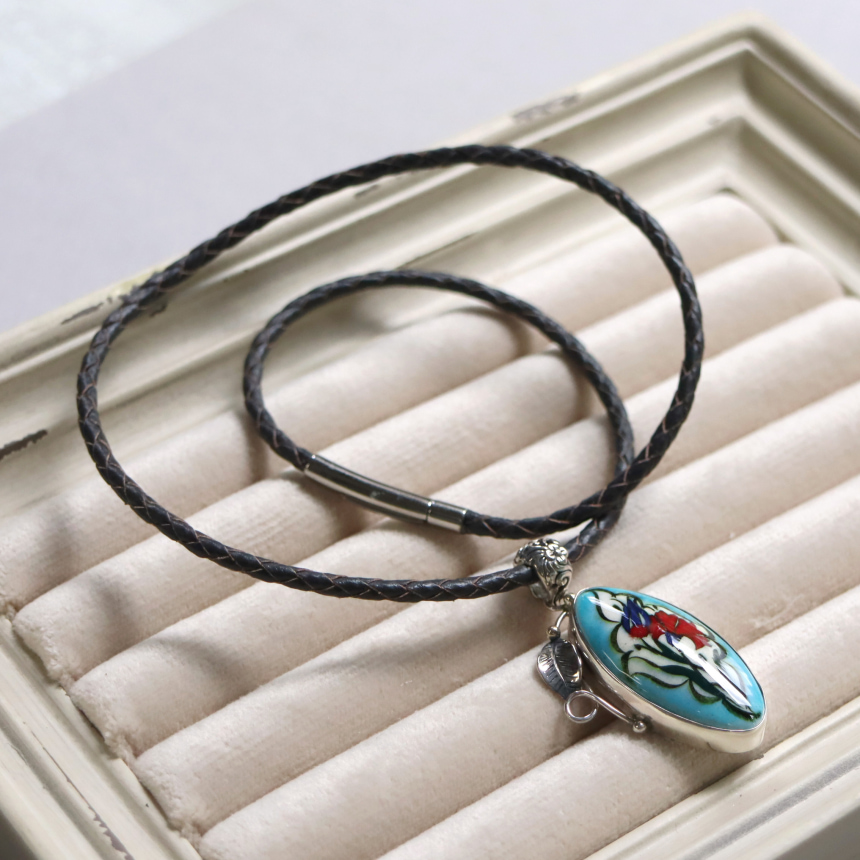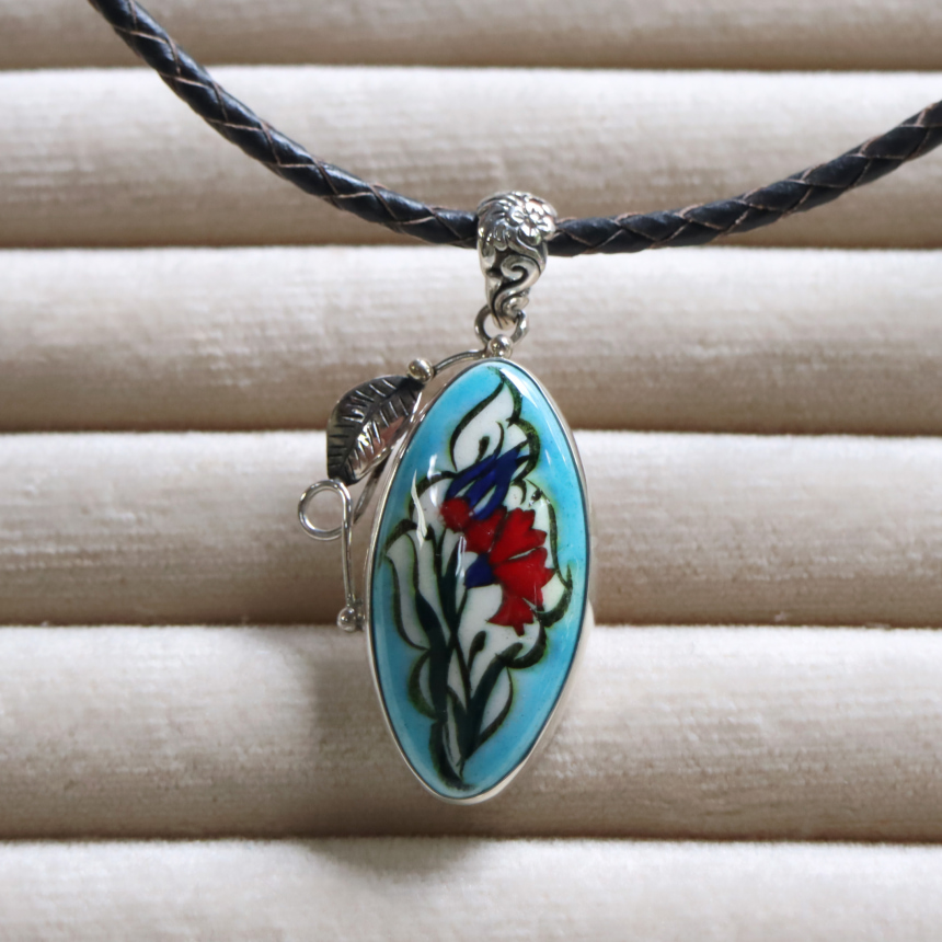 トルコキュターヤは陶芸の街!トルコの職人が、一つひとつ手描きで絵付けしたキュターヤ陶器とシルバー細工のペンダントです。シルバー細工も凝ったデザインで、オーバルモチーフの左側に葉と蔓のレリーフが施されています。