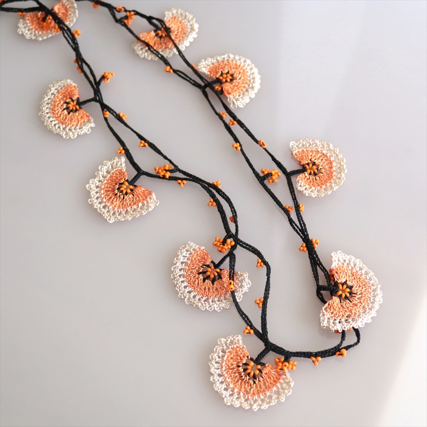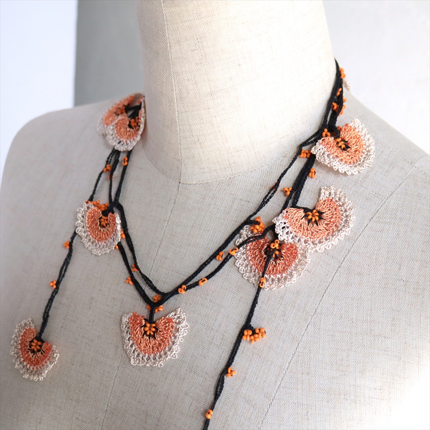トルコの伝統的な手芸「オヤ」をモチーフにして、手編みで作られたネックレスです。このピースは、かぎ針で編んだ「トゥ・オヤ」。